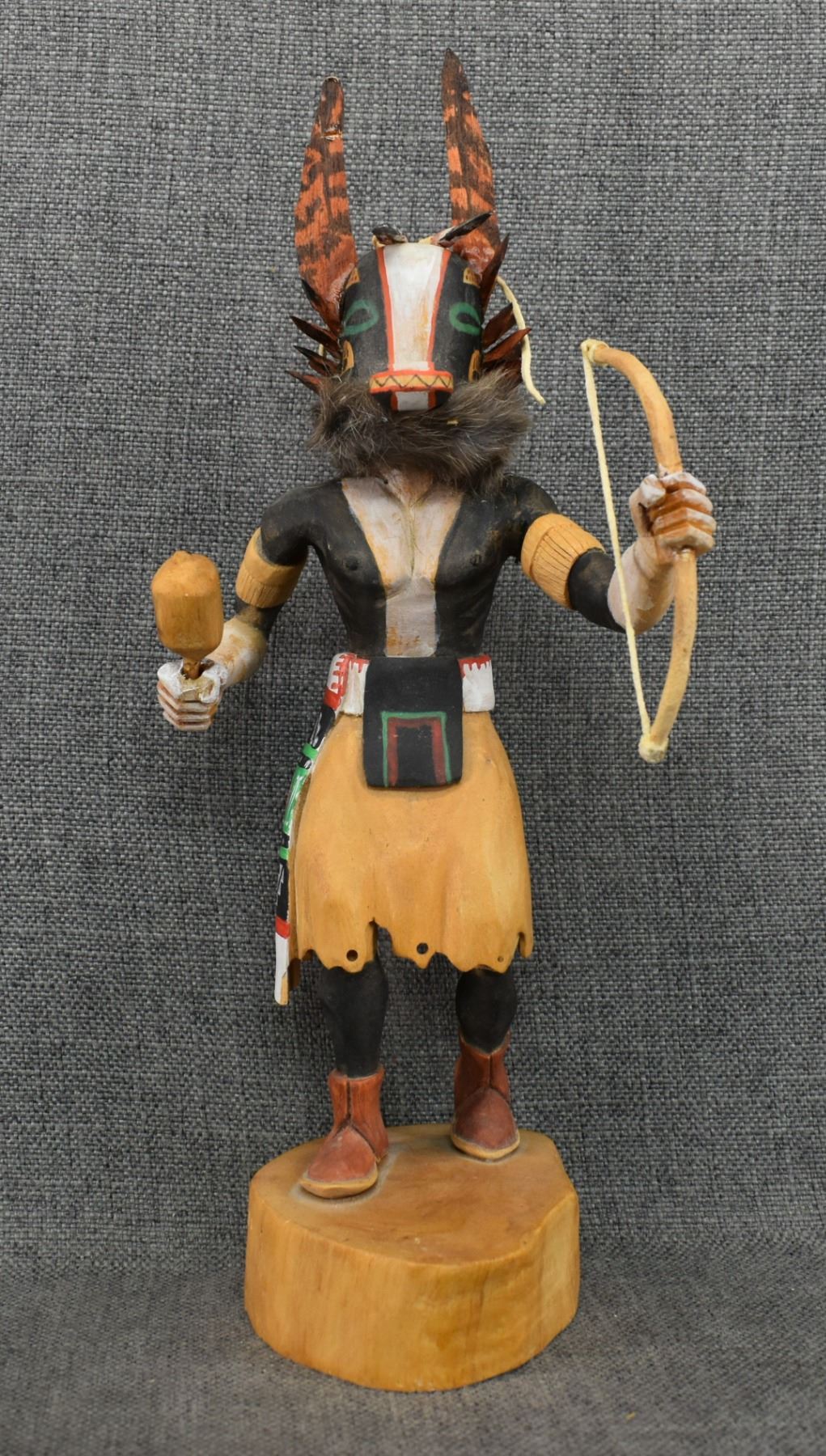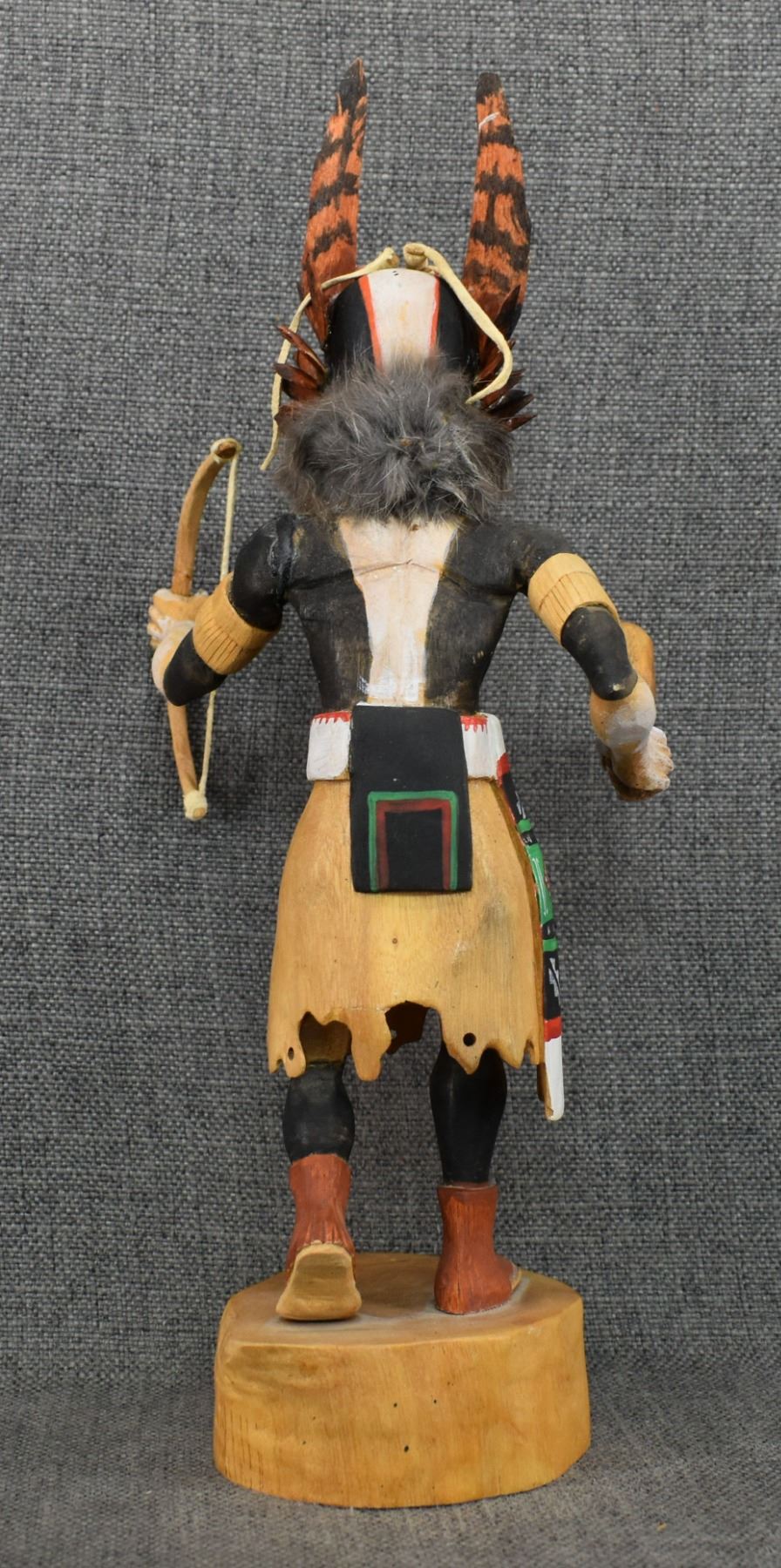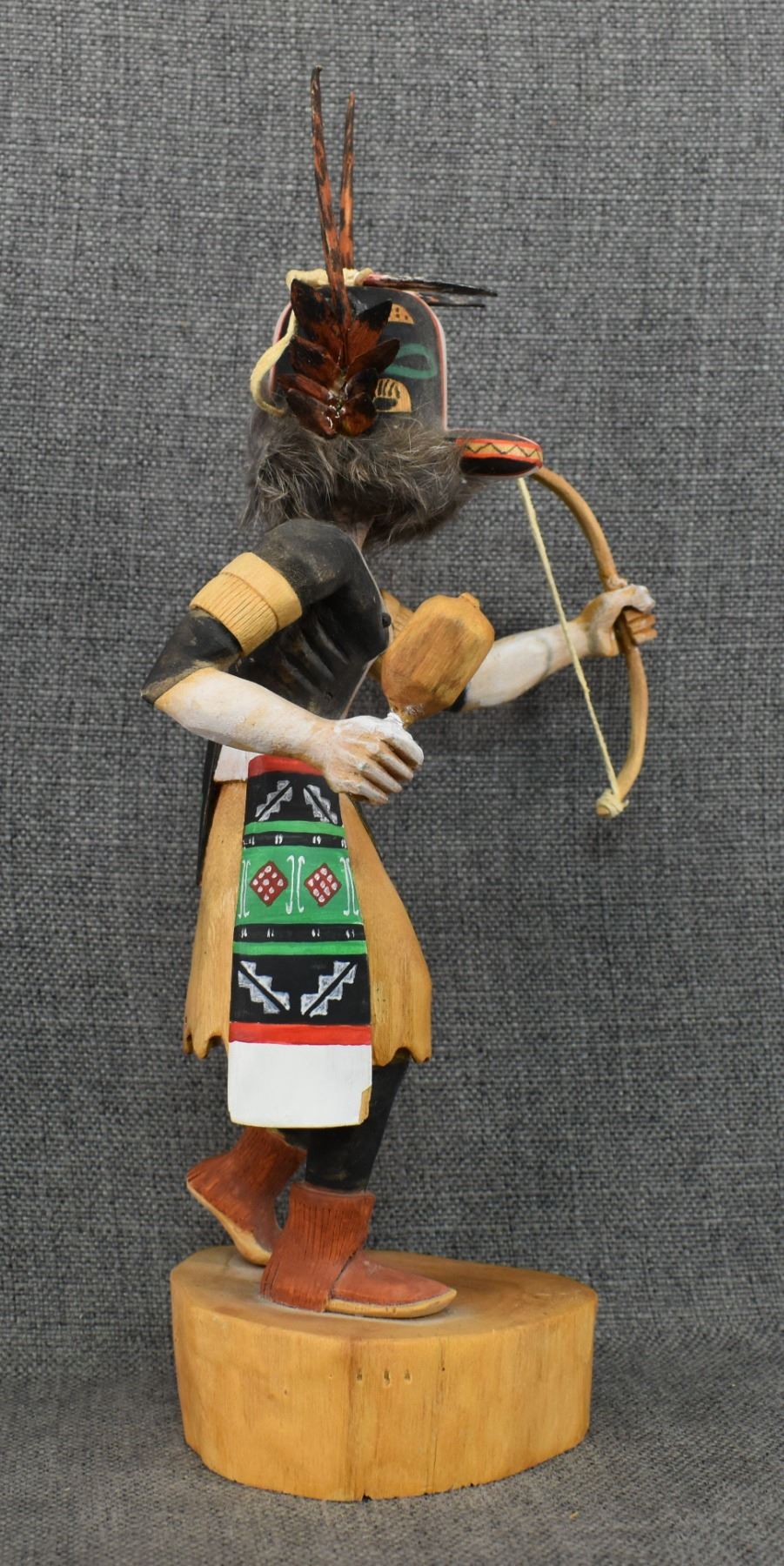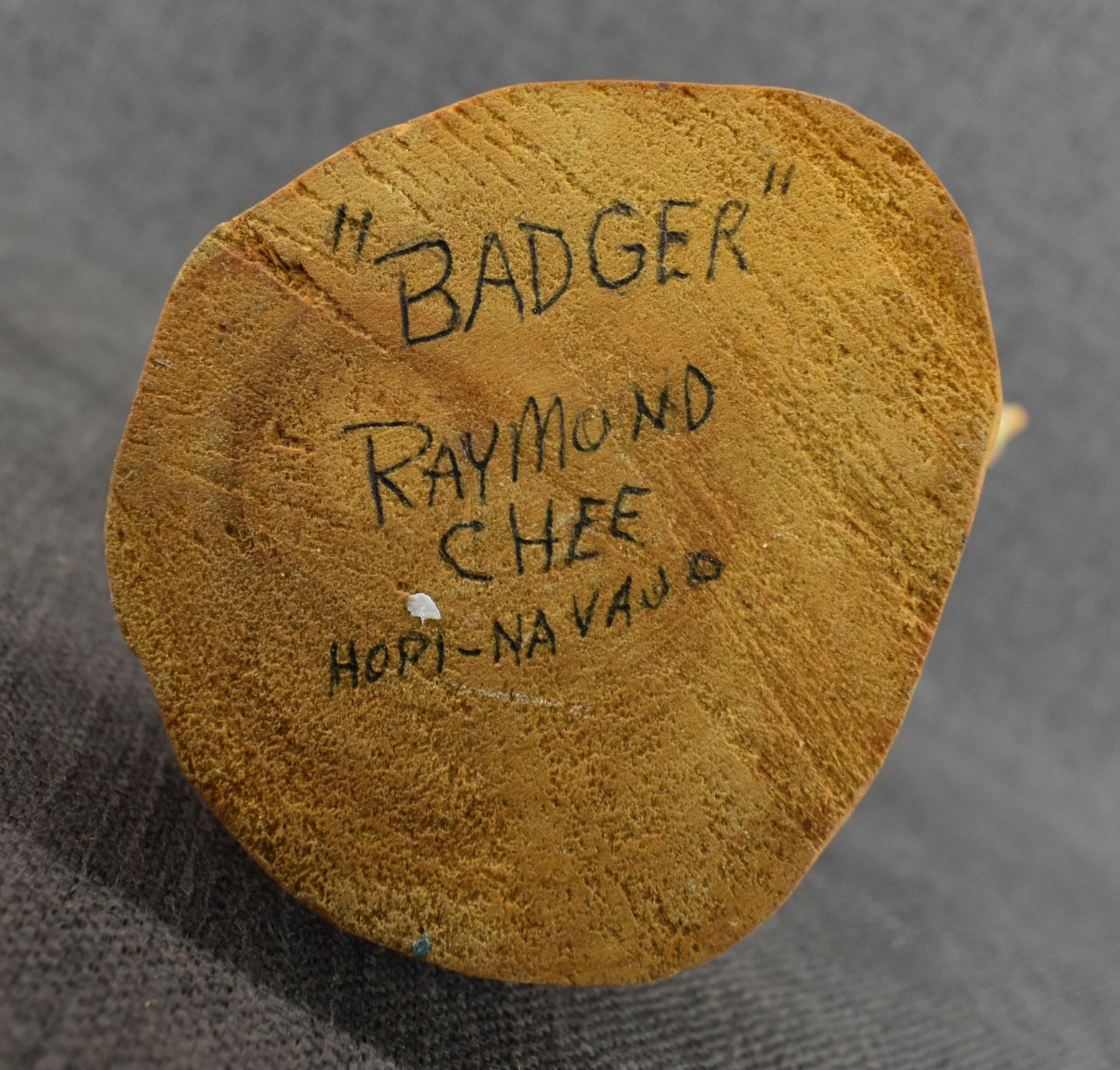 1990's Hopi . Hand carved and painted cotton wood depicting Badger kachina. Signed Raymond Chee. 14'' tall has broken and glued feather
