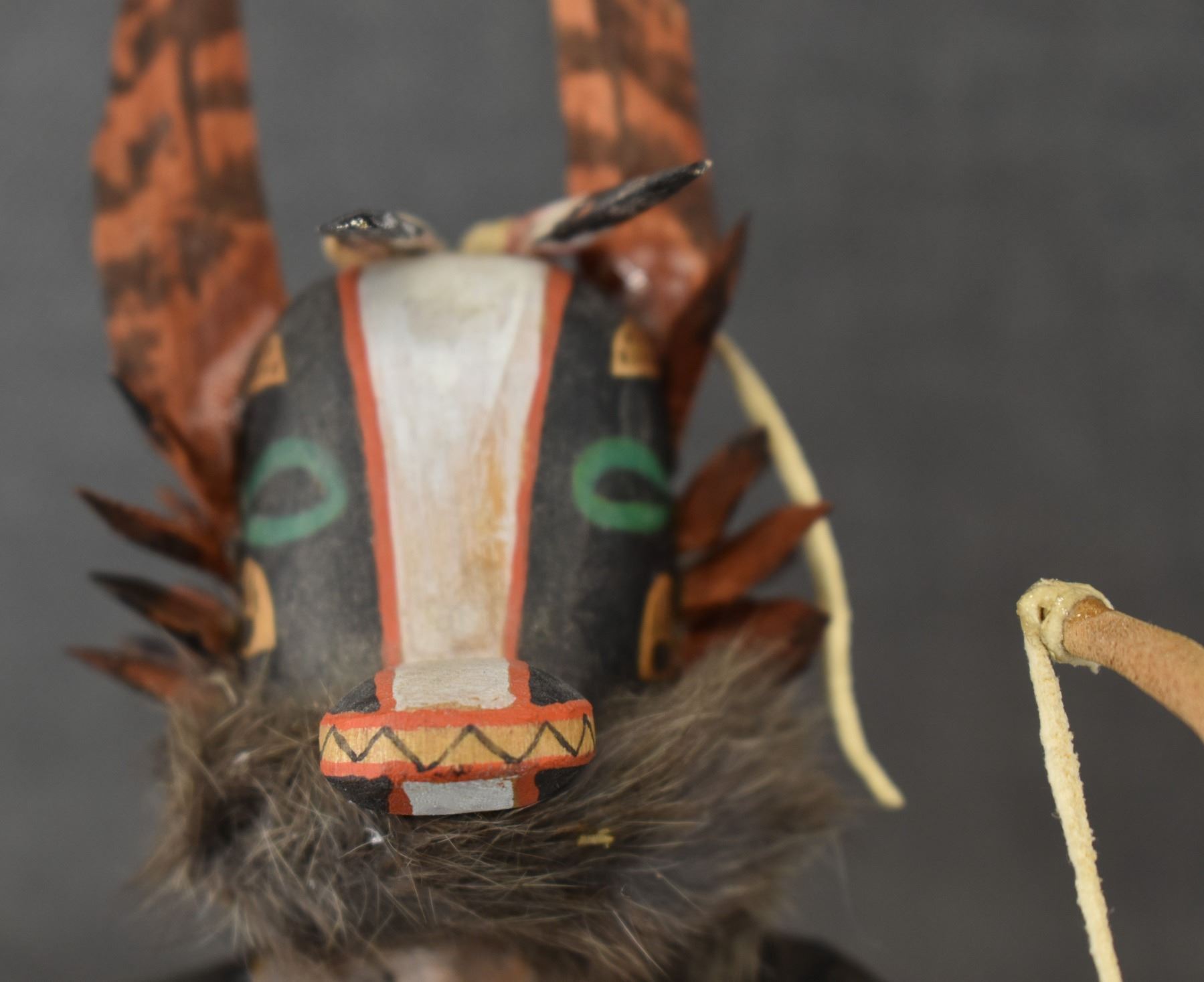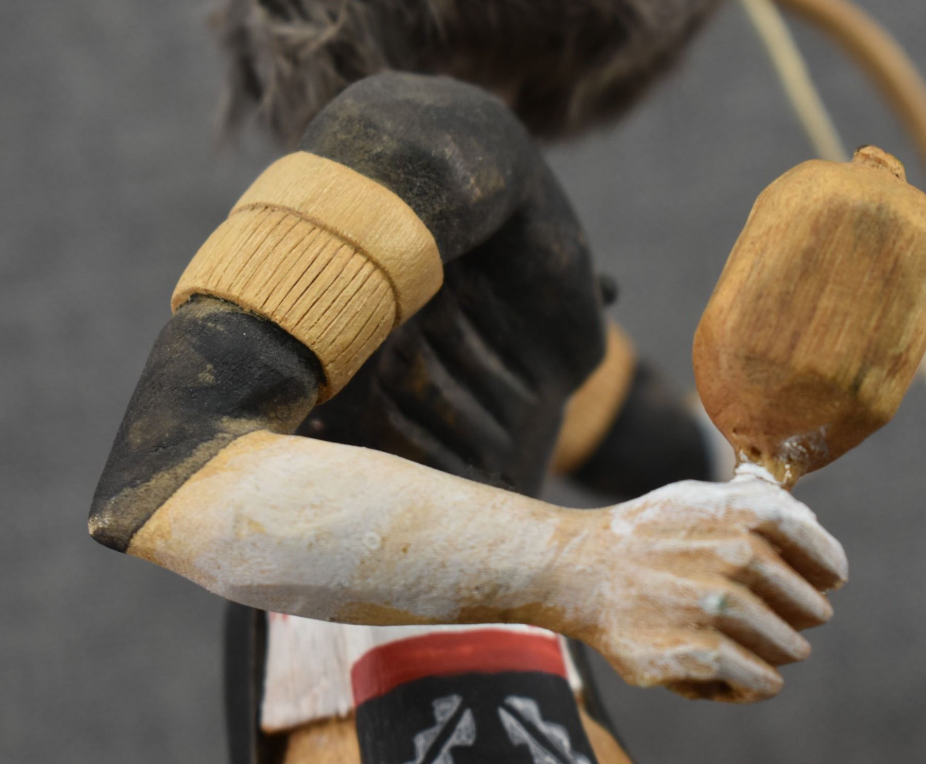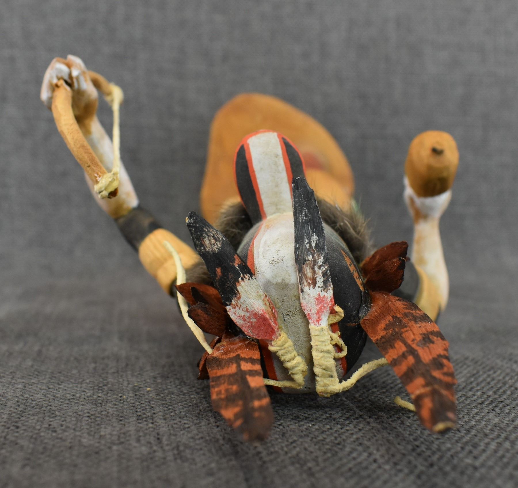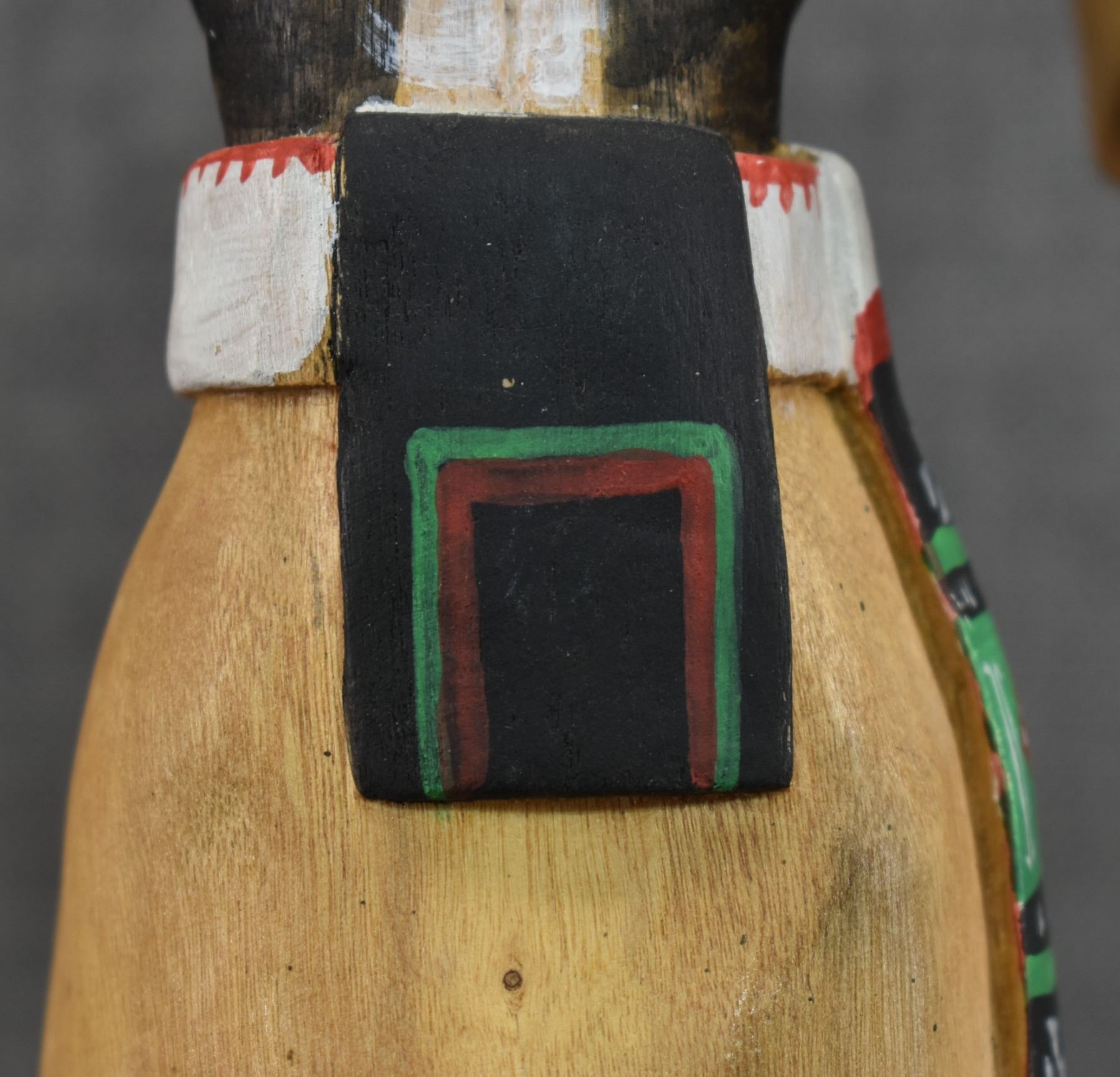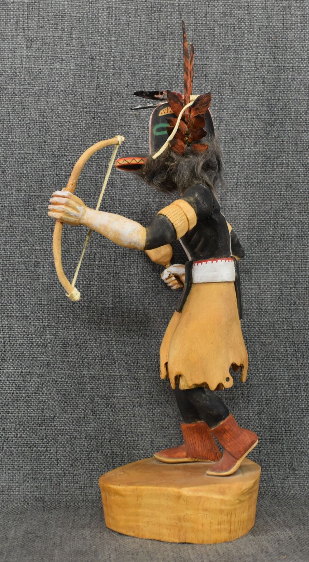 1990's Hopi . Hand carved and painted cotton wood depicting Badger kachina. Signed Raymond Chee. 14'' tall has broken and glued feather