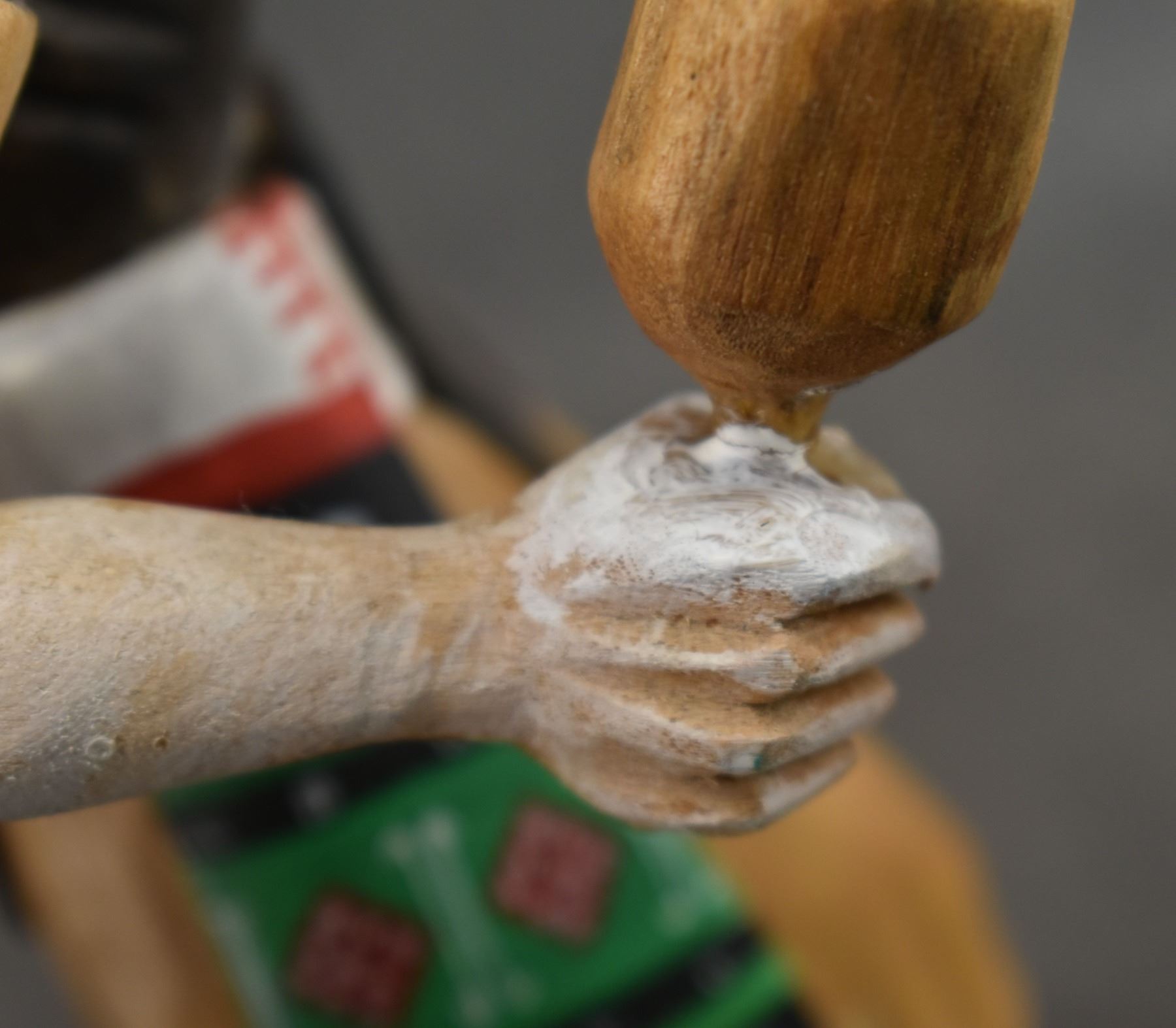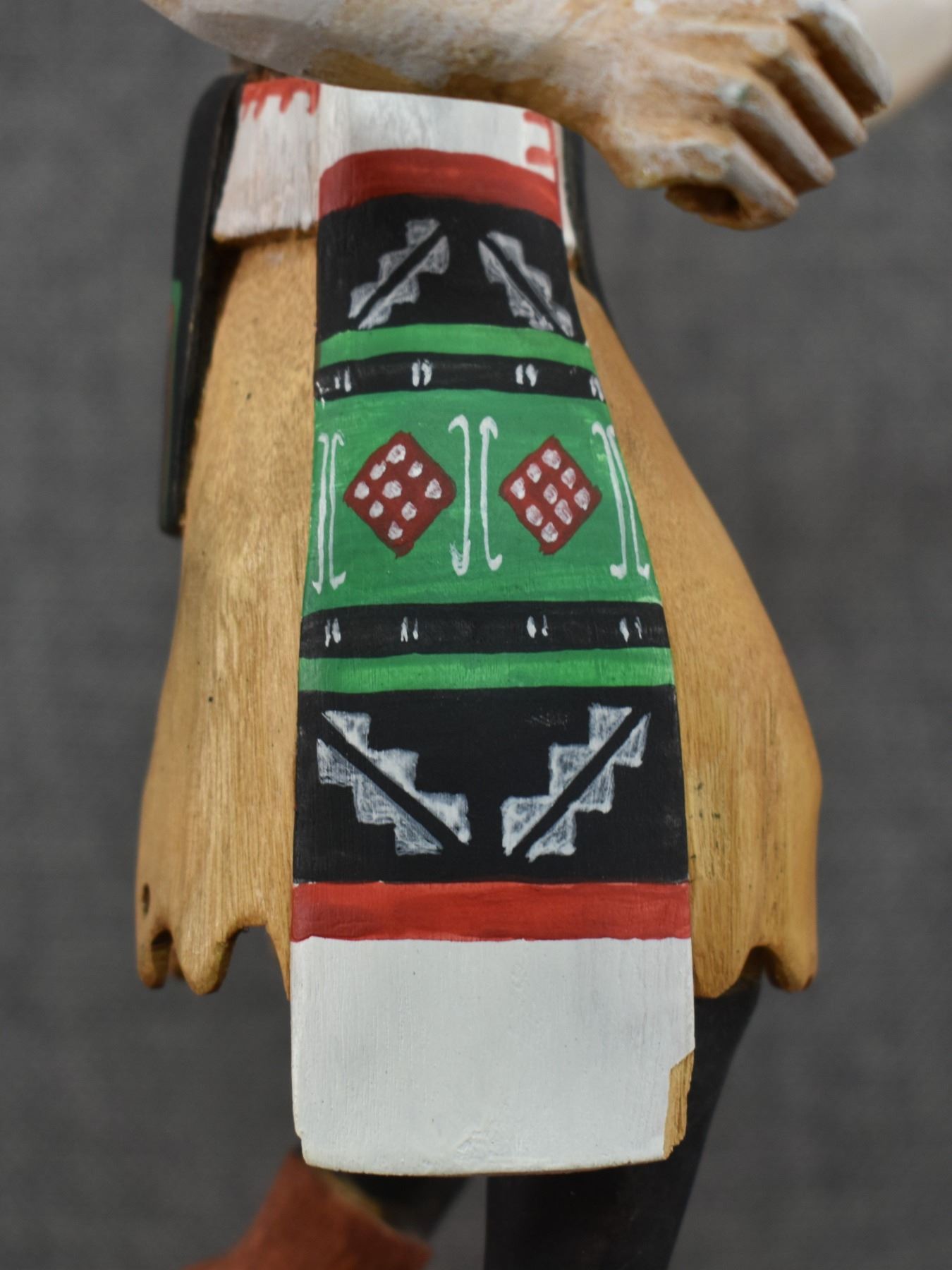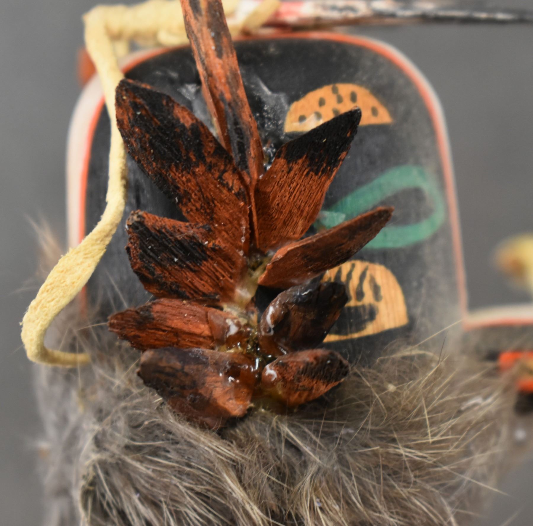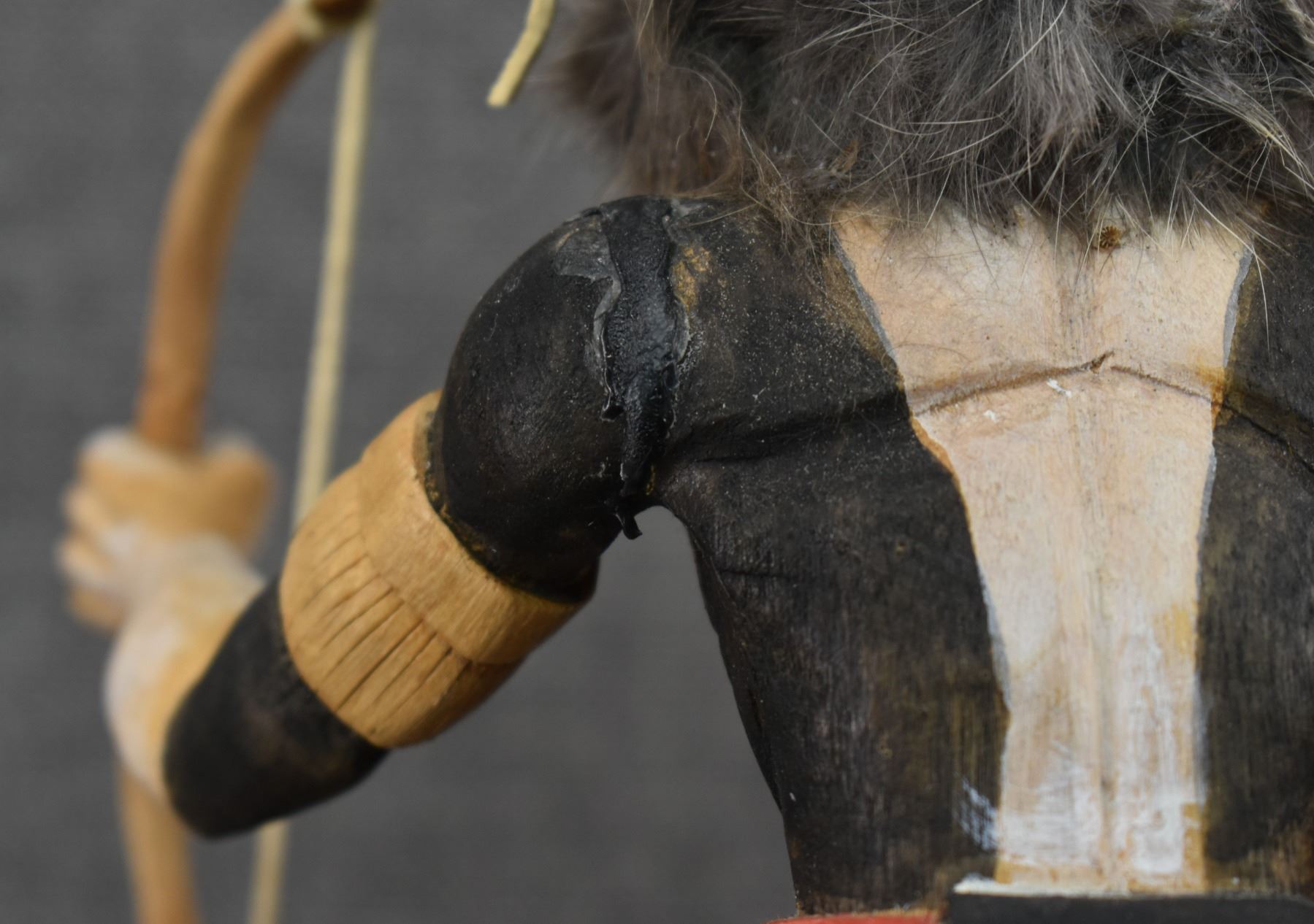 1990's Hopi . Hand carved and painted cotton wood depicting Badger kachina. Signed Raymond Chee. 14'' tall has broken and glued feather