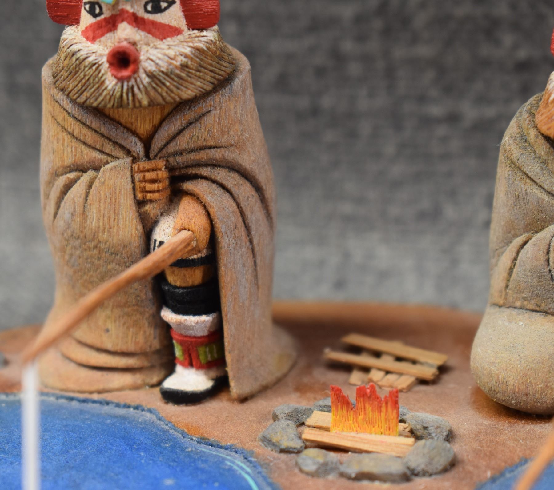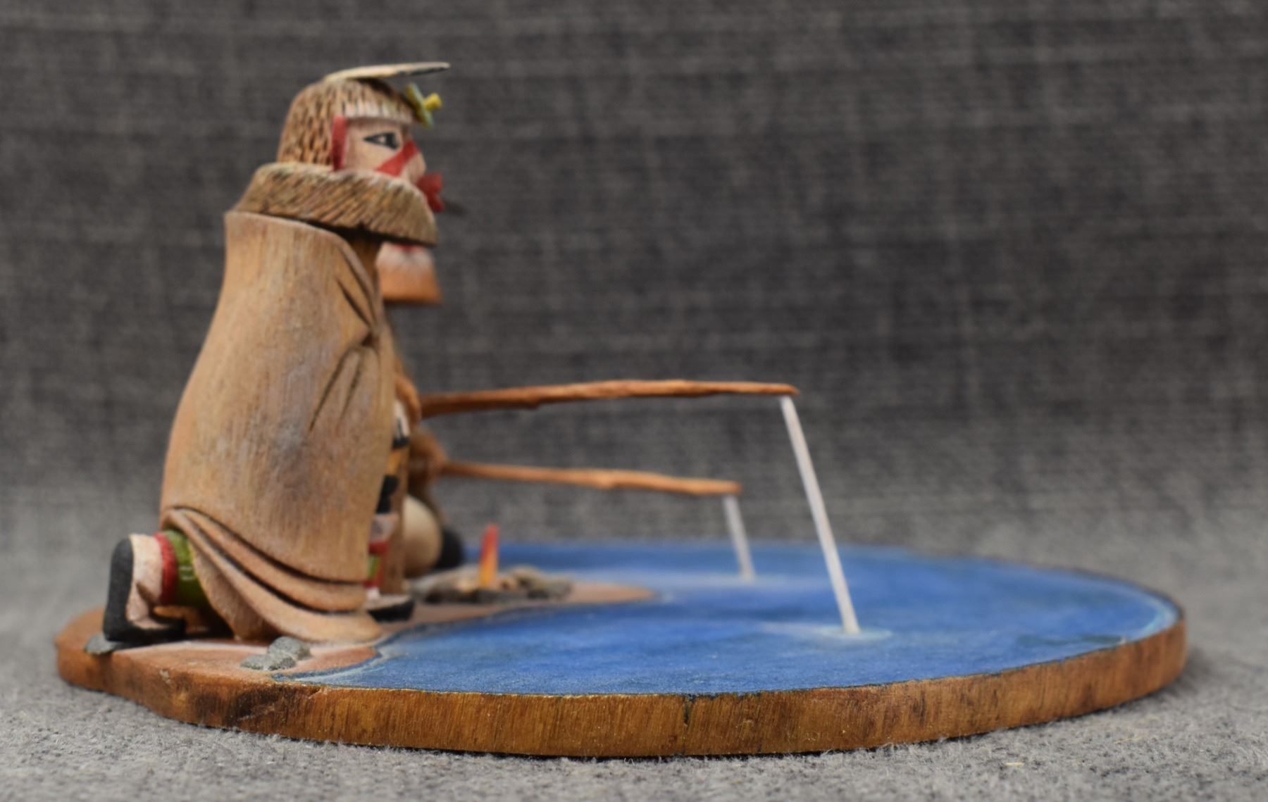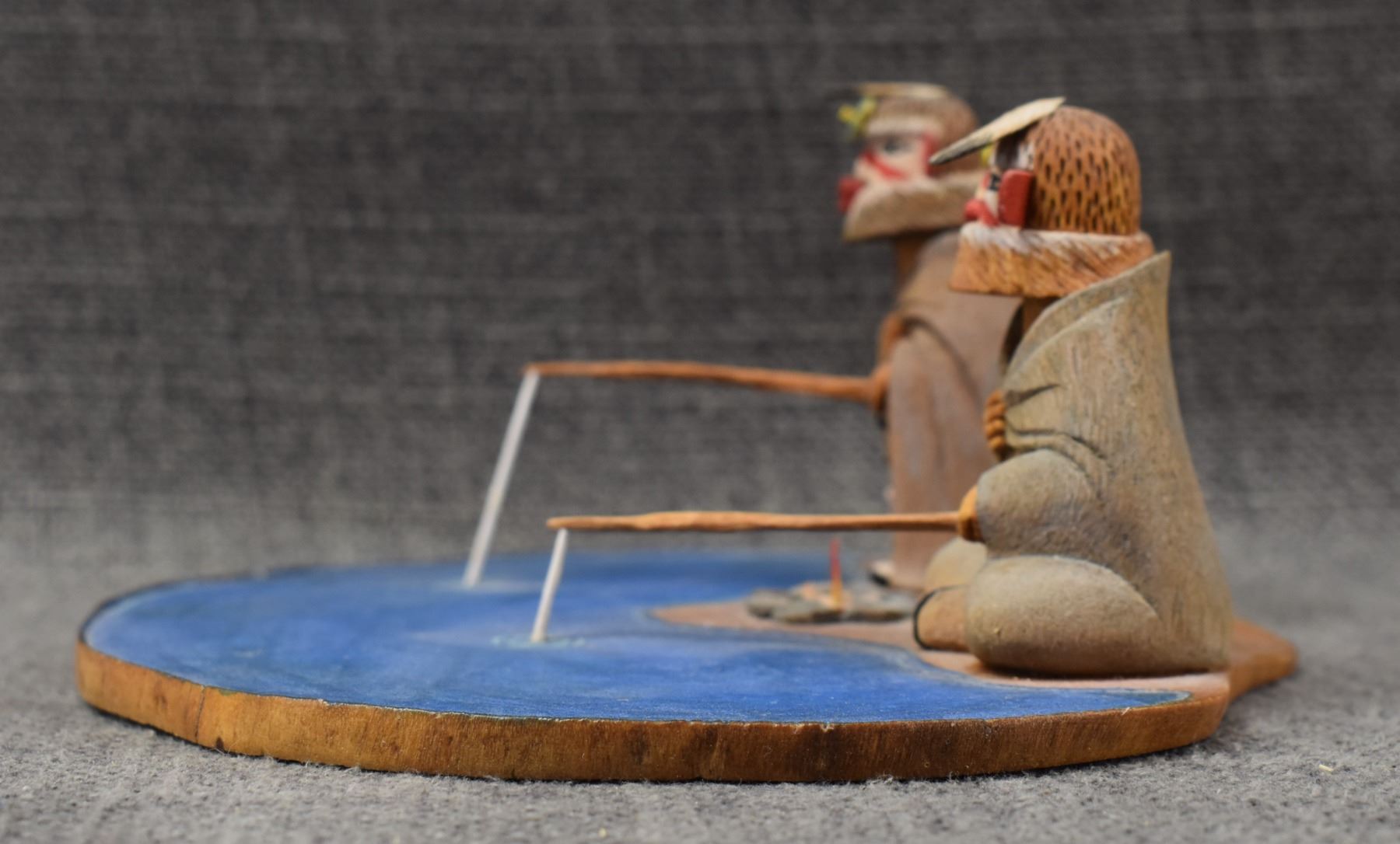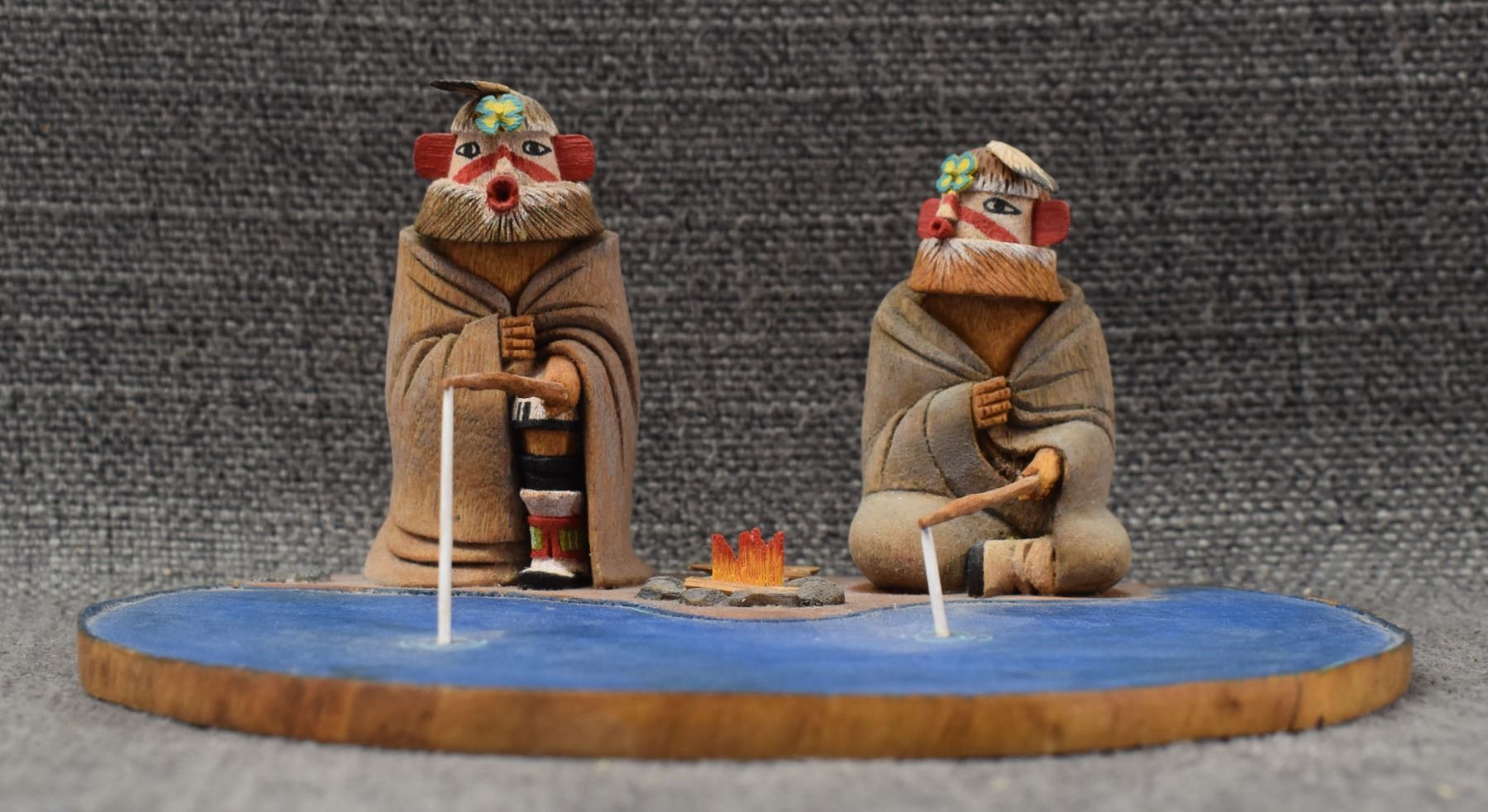 1990-2000's Hopi, carved and painted cottonwood depicting kachinas fishing 2.5" x 5.25" x 5.75"