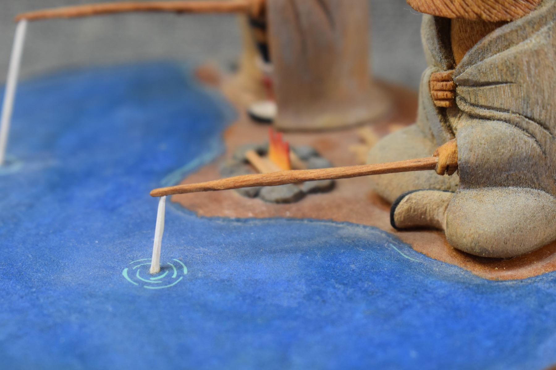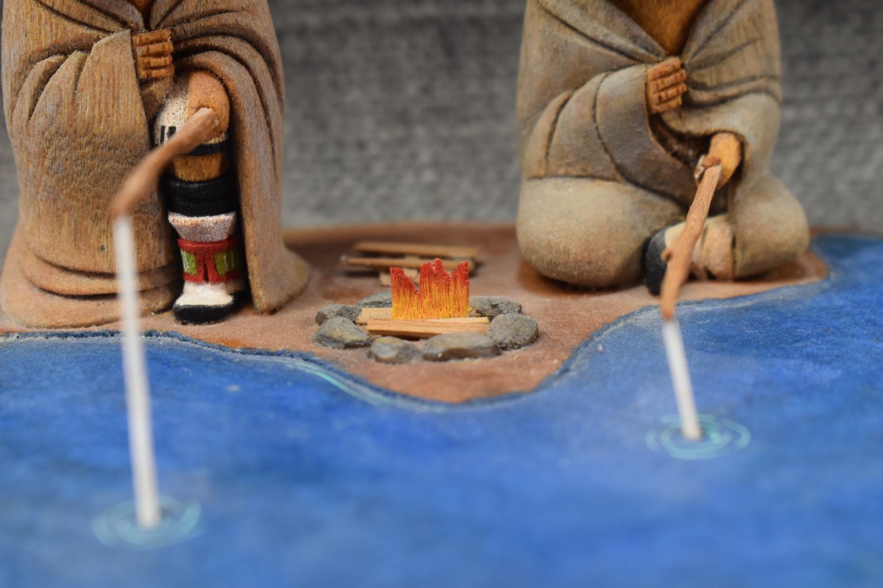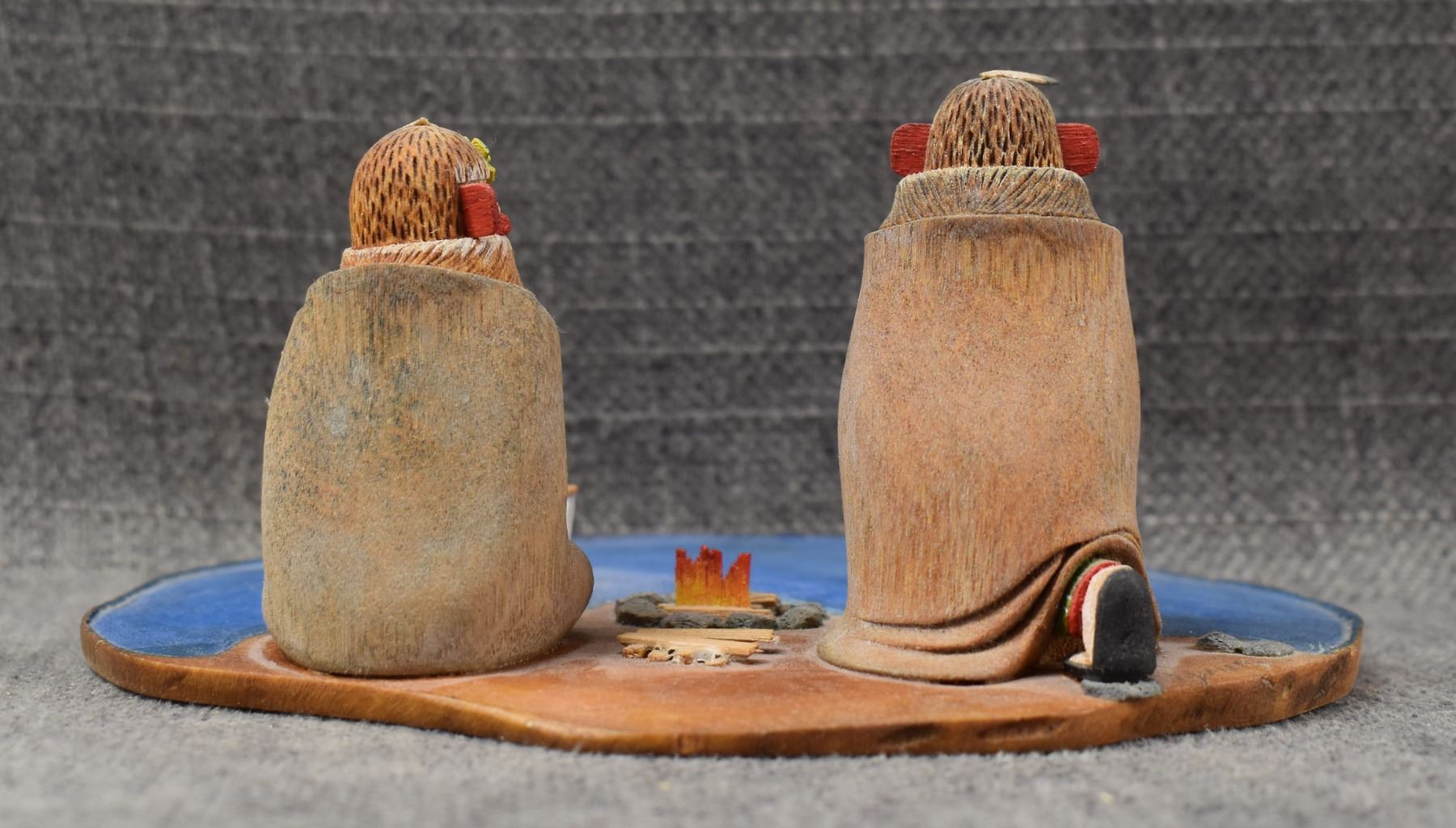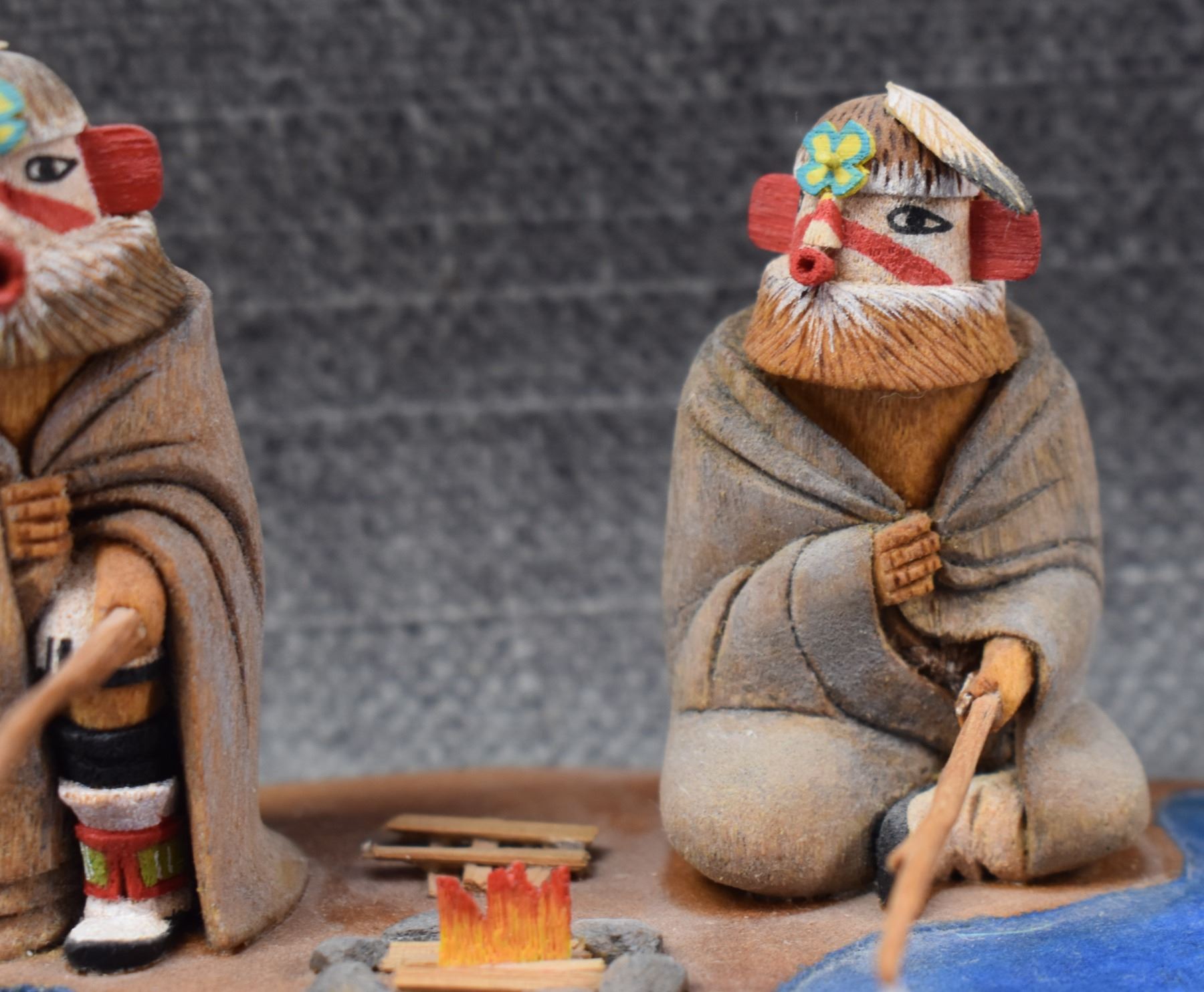 1990-2000's Hopi, carved and painted cottonwood depicting kachinas fishing 2.5" x 5.25" x 5.75"