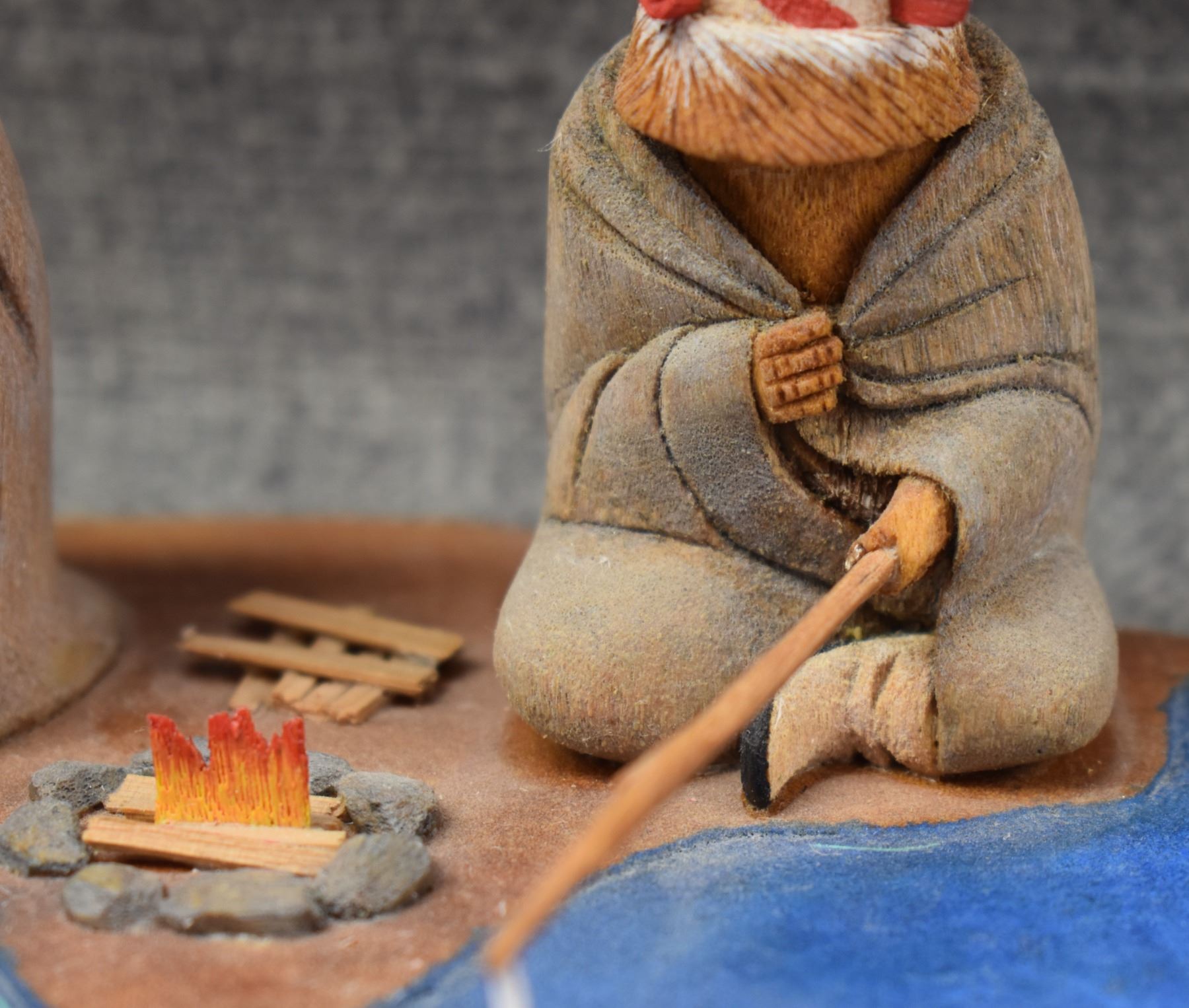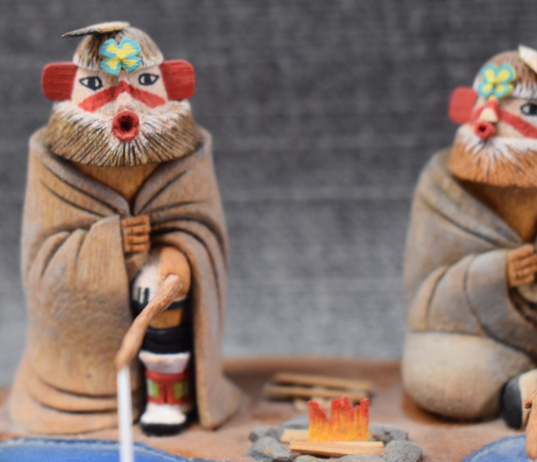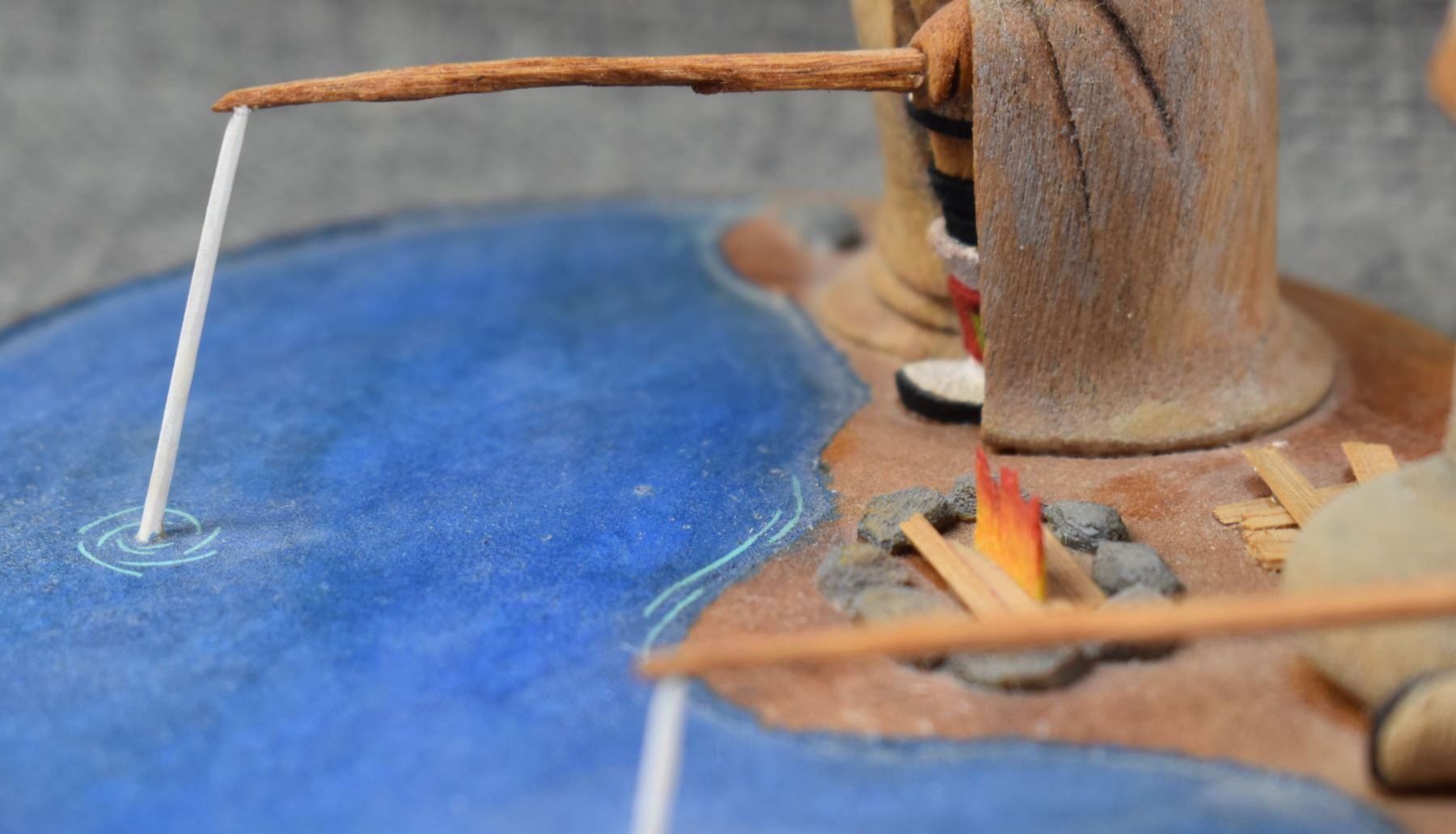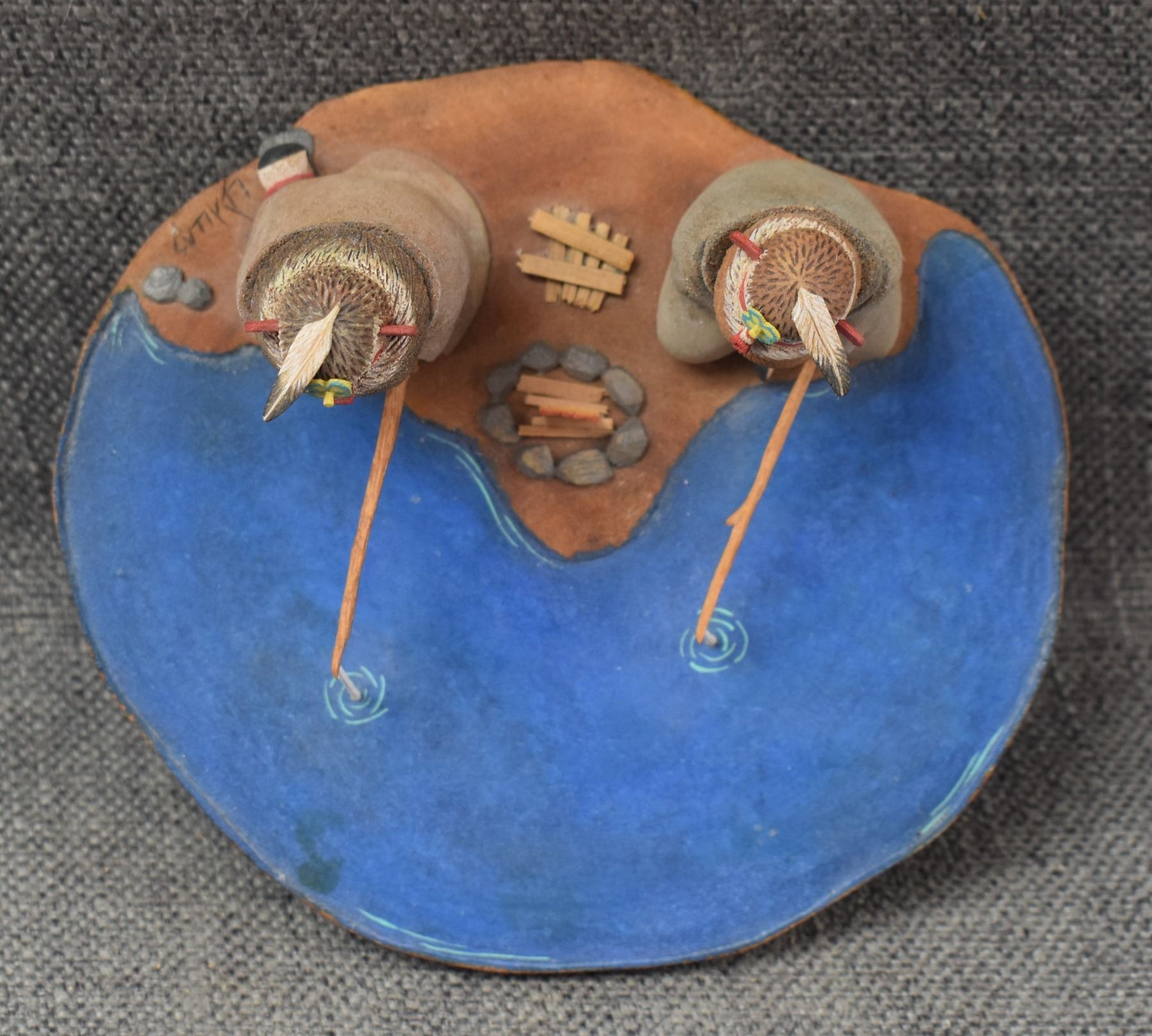 1990-2000's Hopi, carved and painted cottonwood depicting kachinas fishing 2.5" x 5.25" x 5.75"