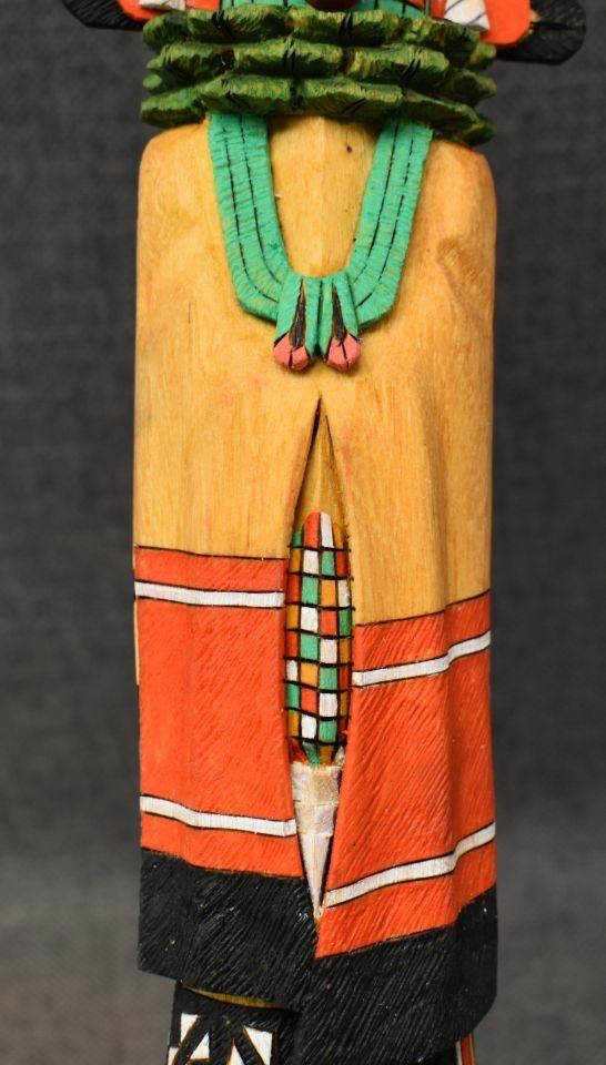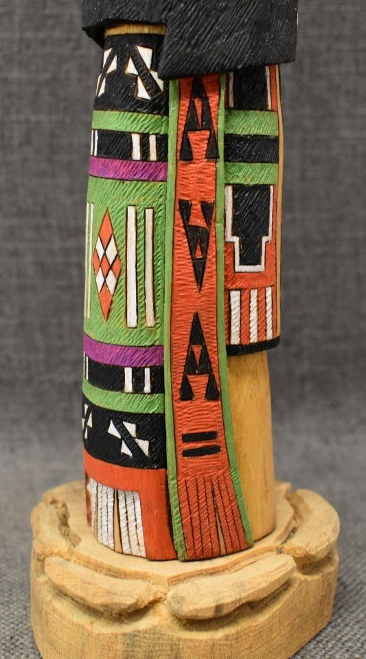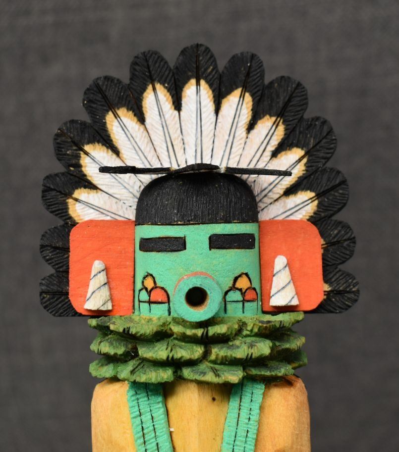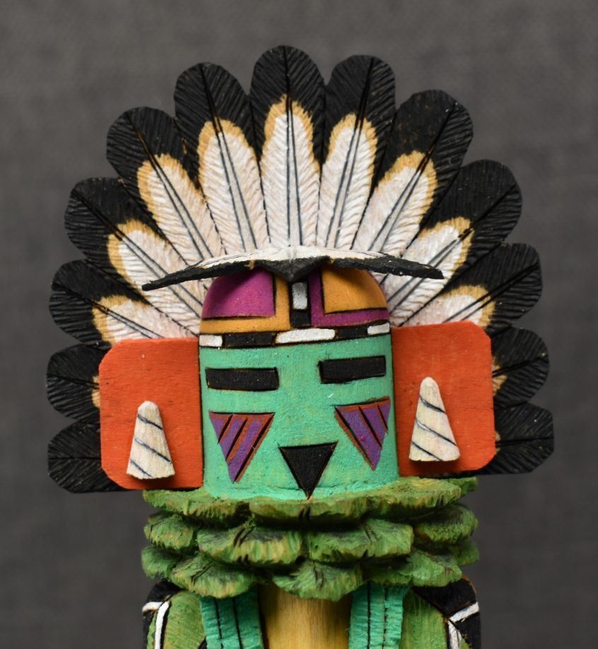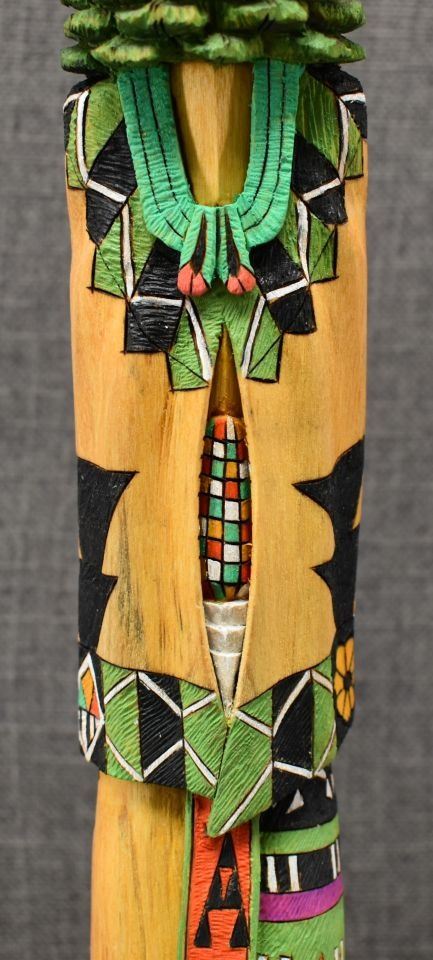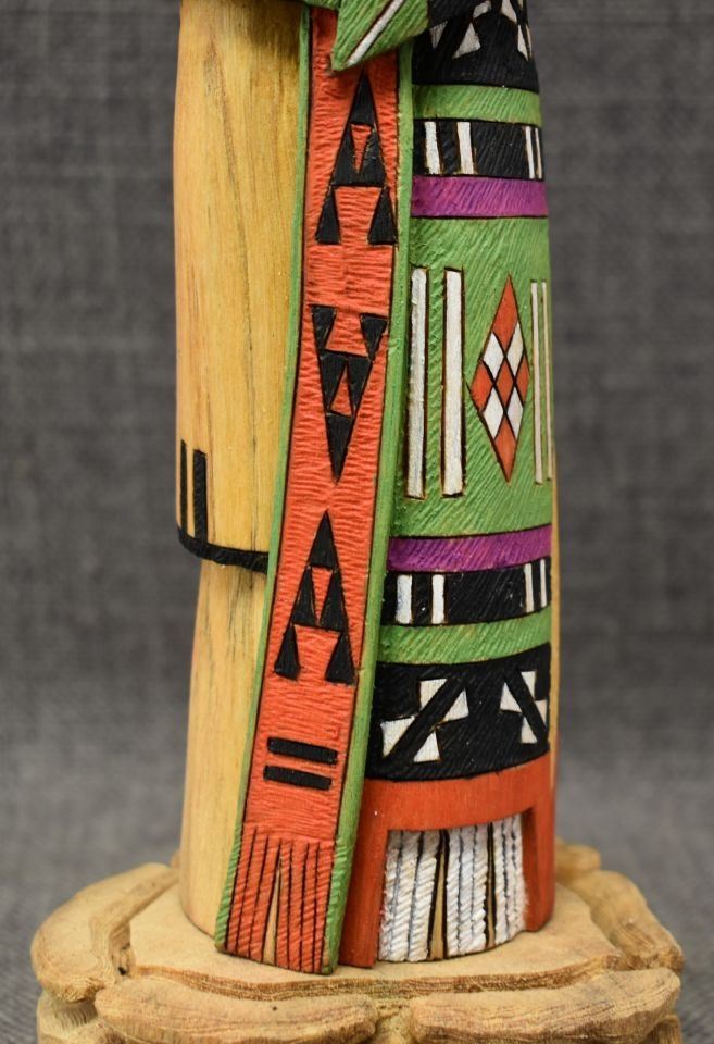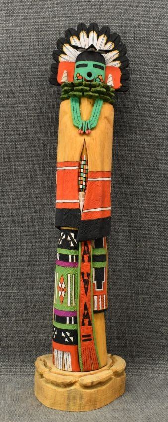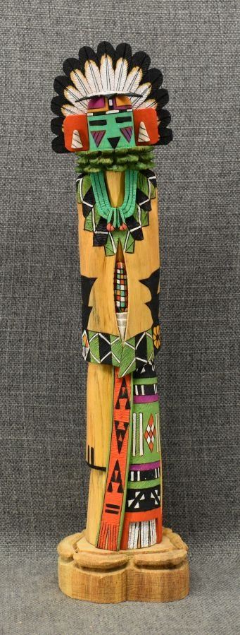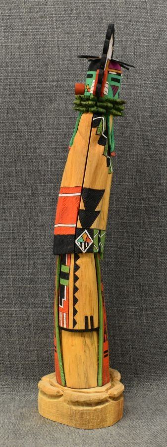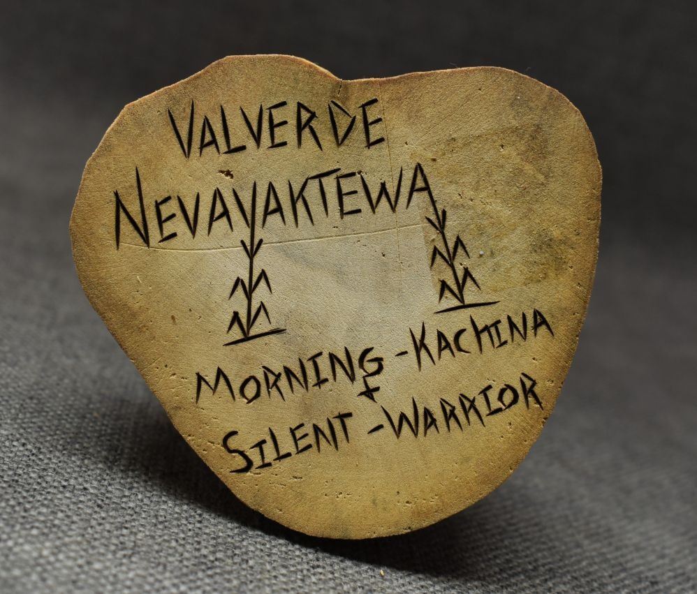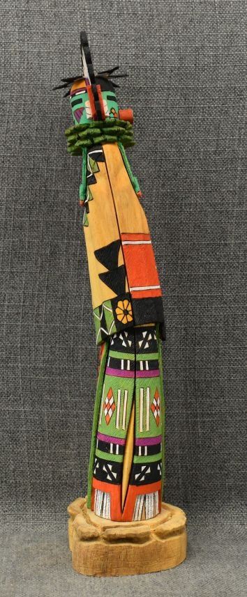 1990's Hopi, carved and painted cottonwood double sided depicting Morning Kachina and Silent Warrior kachina by Valverde Nevayaktewa 15.75"