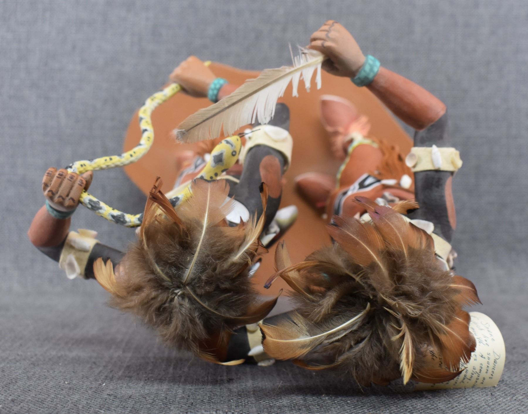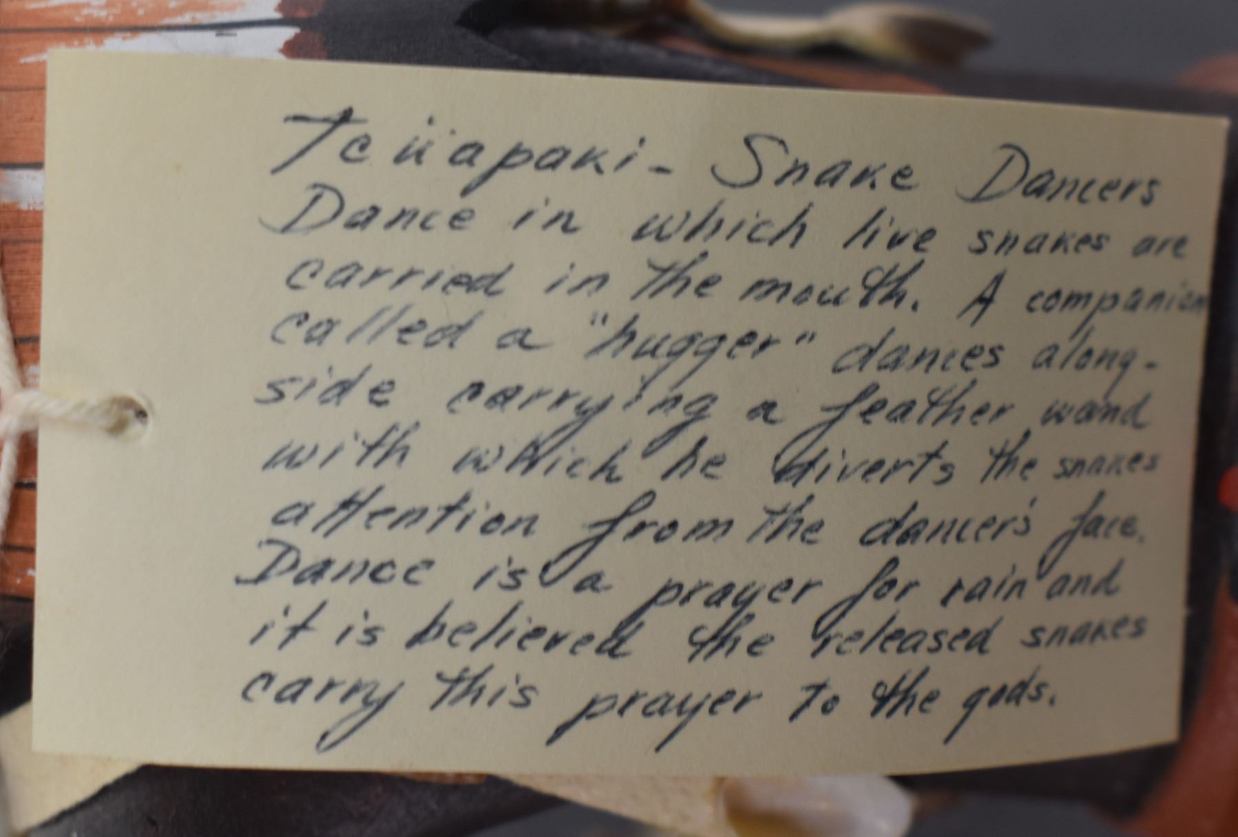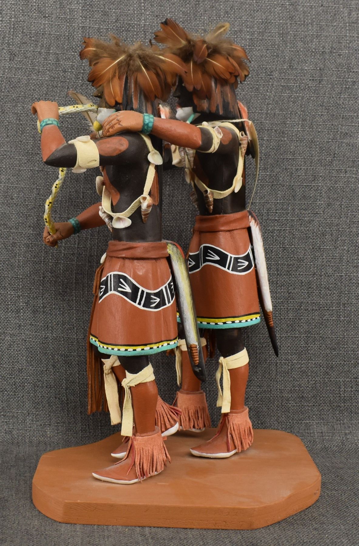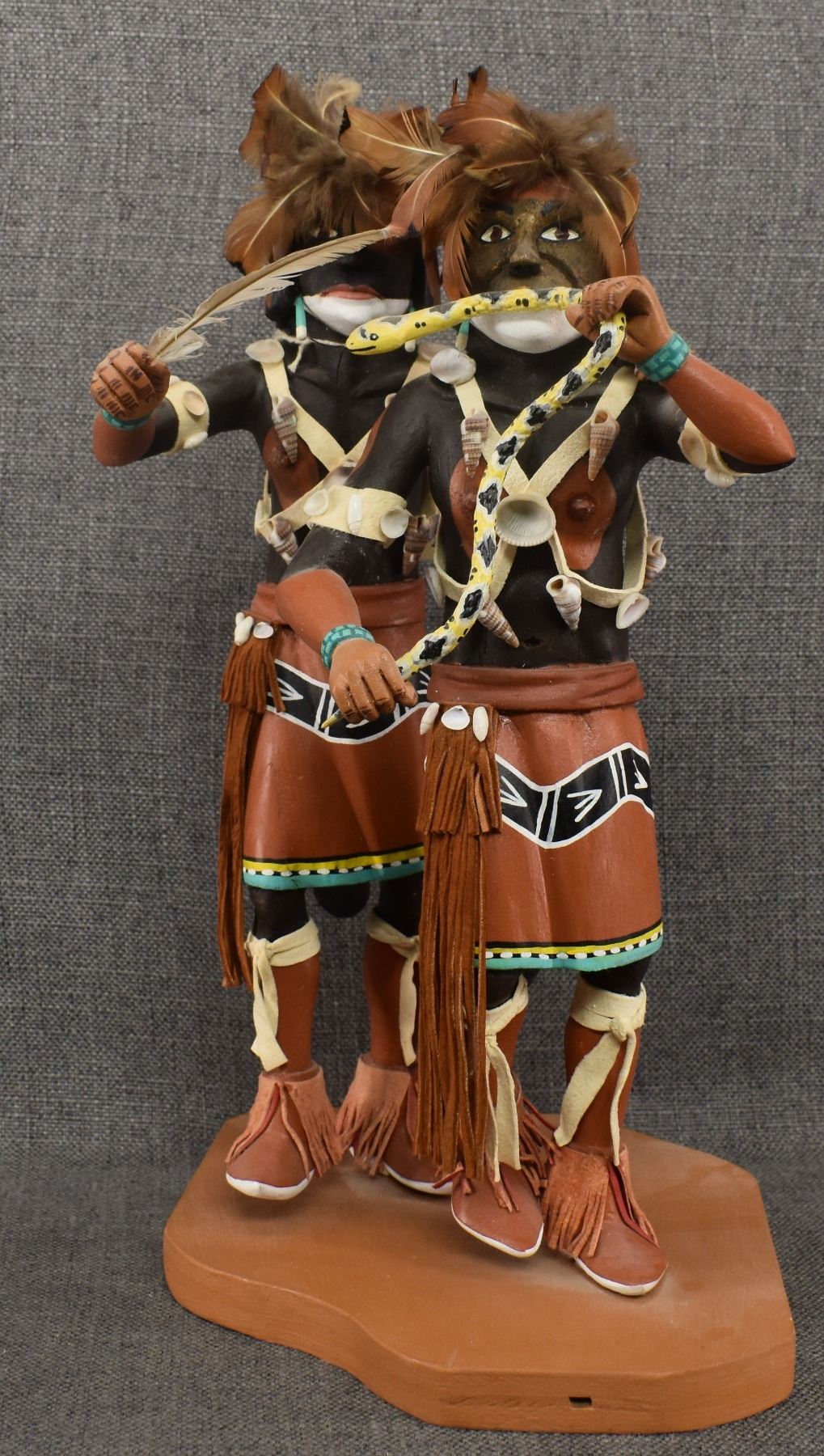 1970's Hopi. Hand carved and painted cotton wood depicting snake dancers. Signed H. Sheldon. 14'' tall