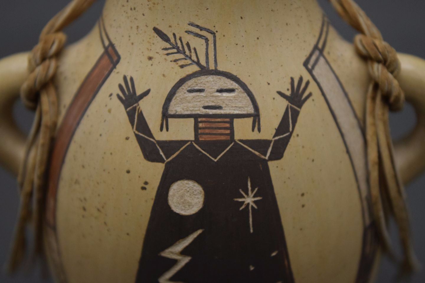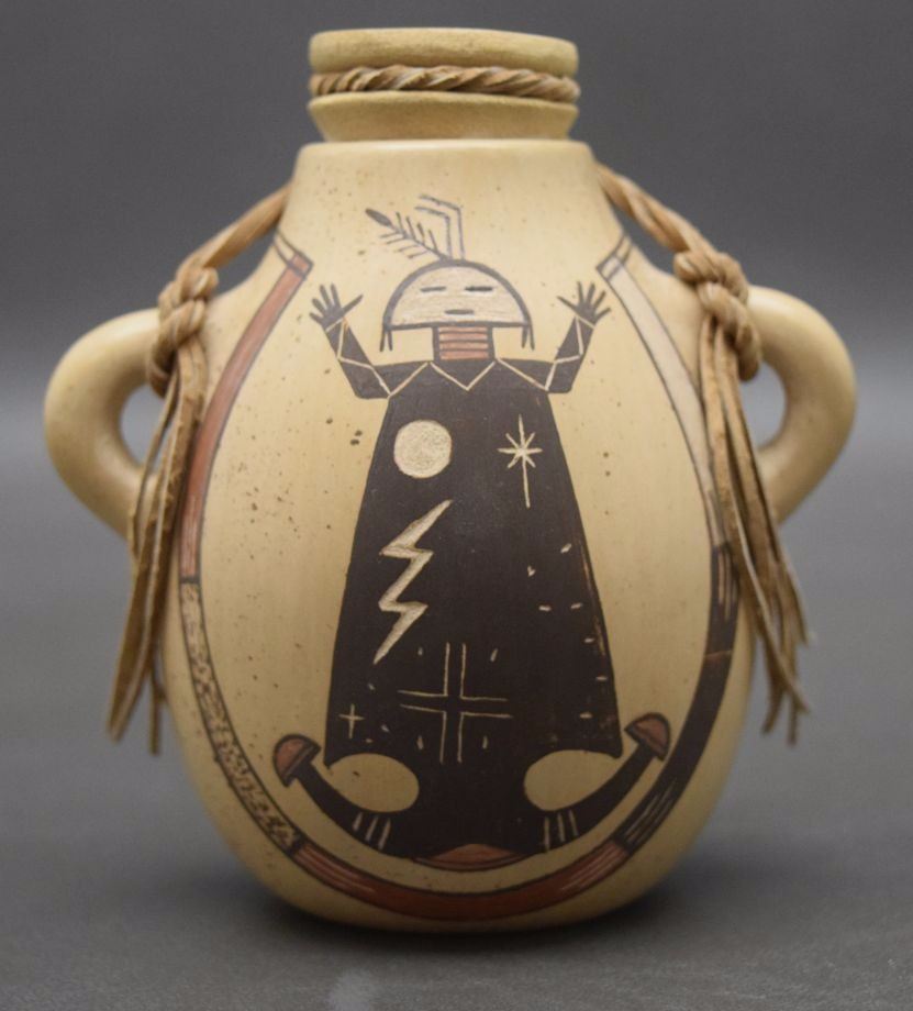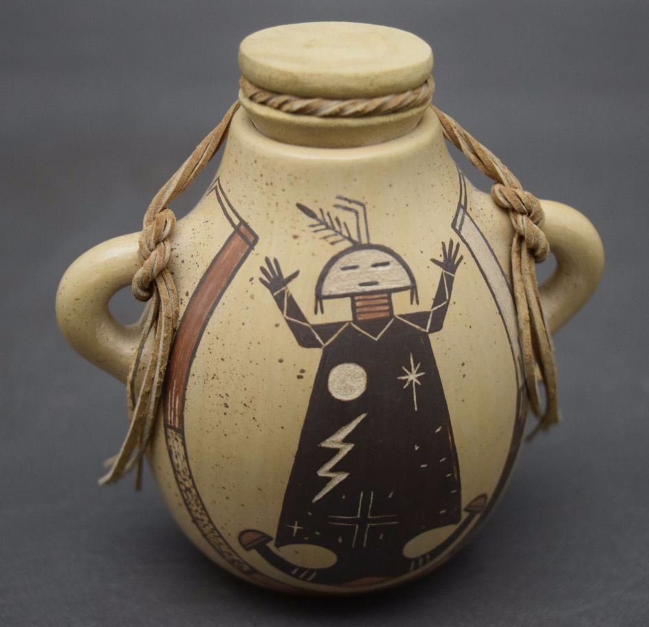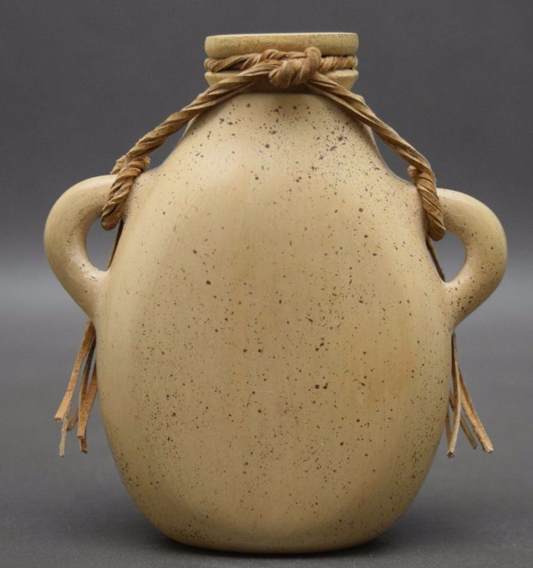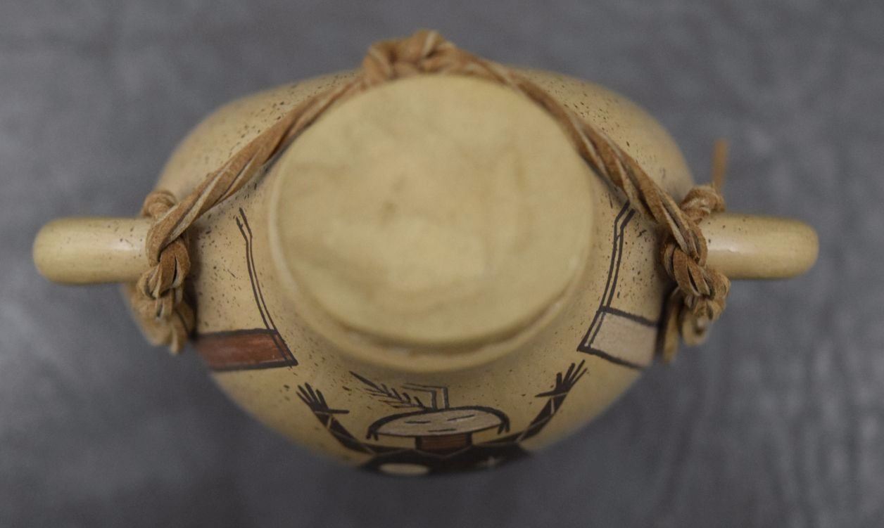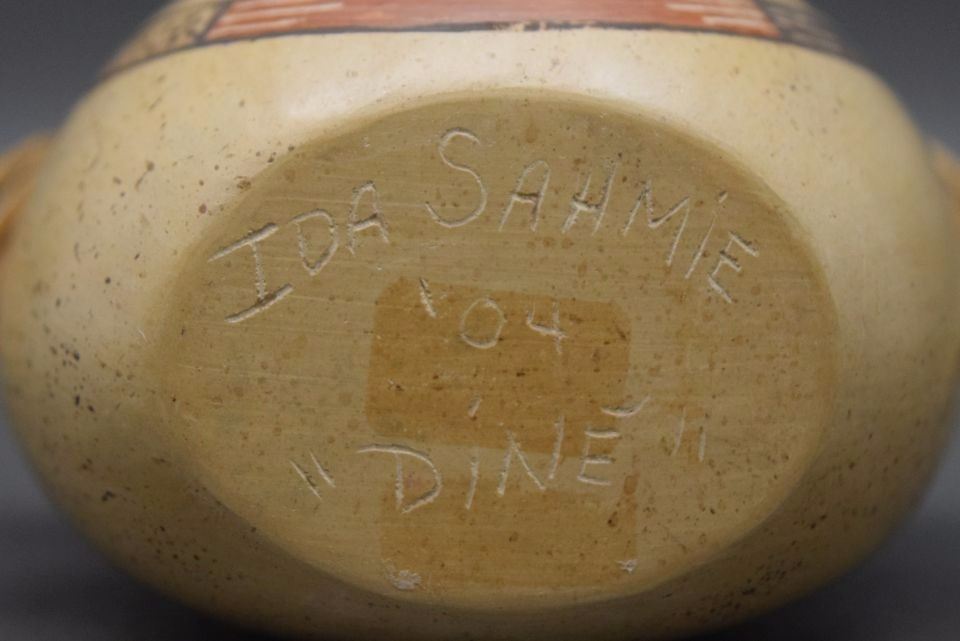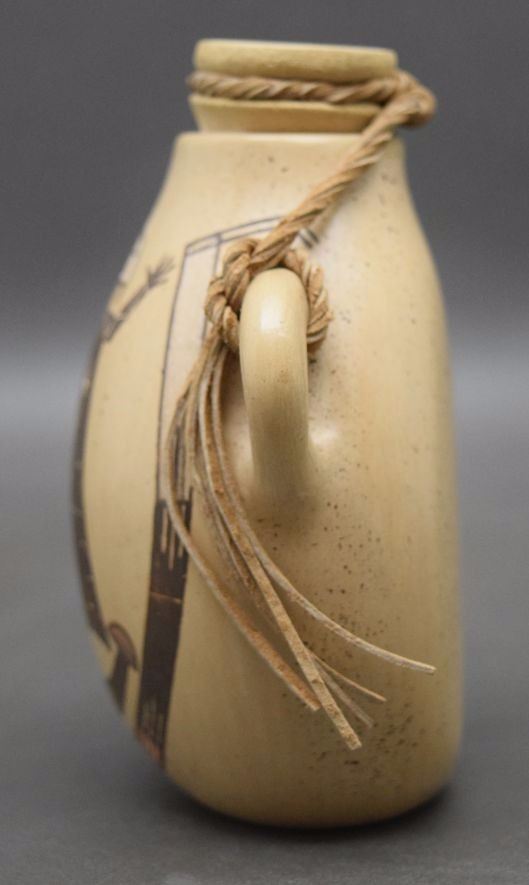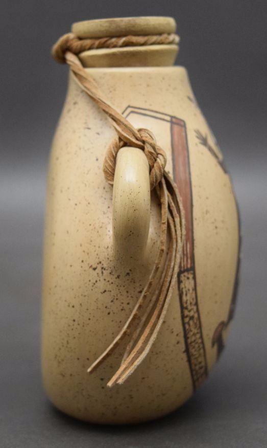 2004 hand coiled and painted pottery canteen signed Ida Sahmie 4'' x 3.75'' x 2''
