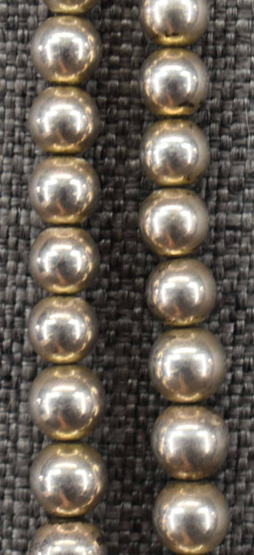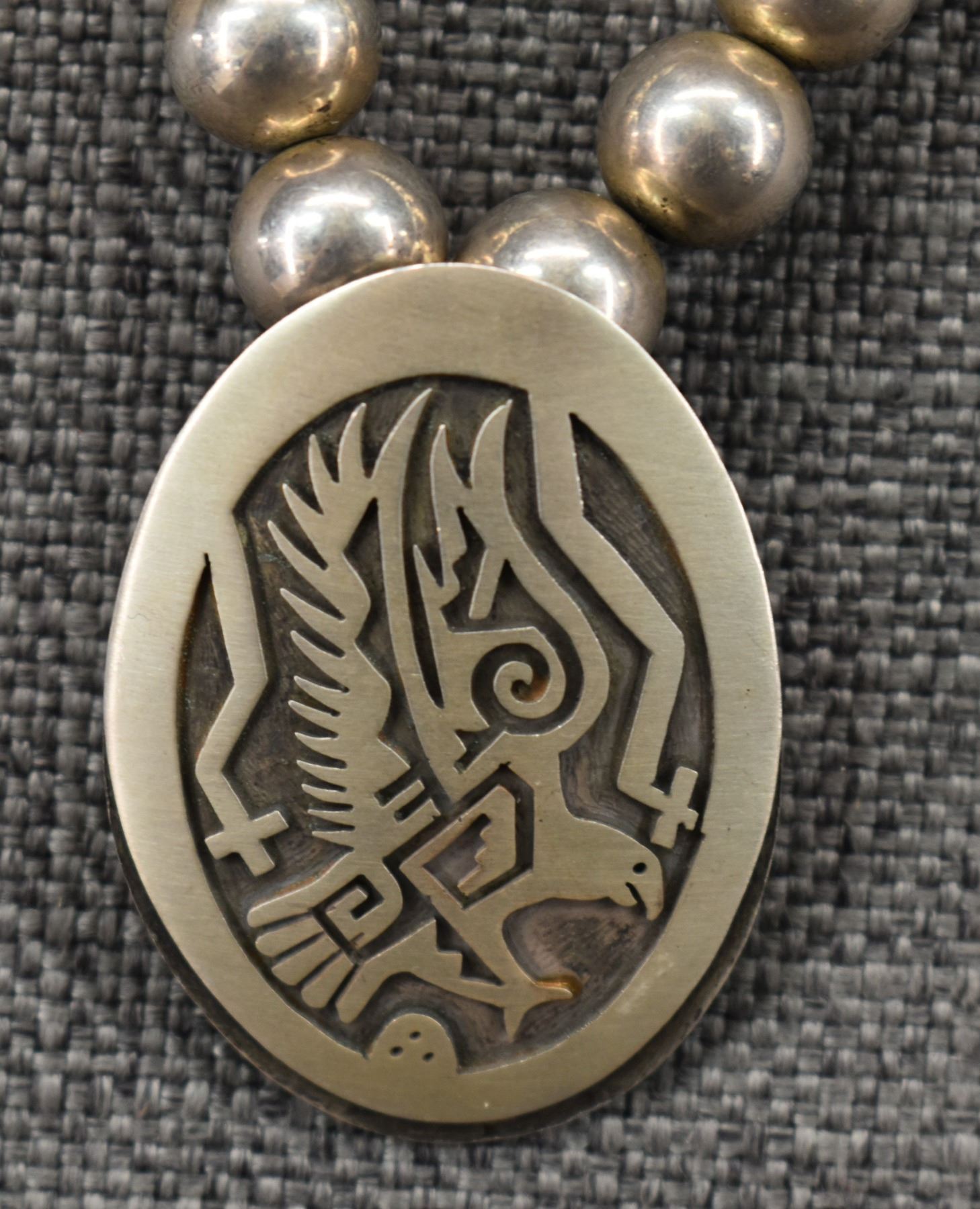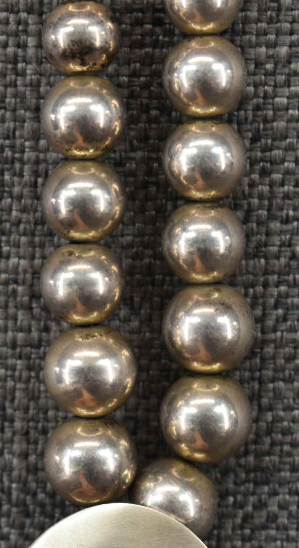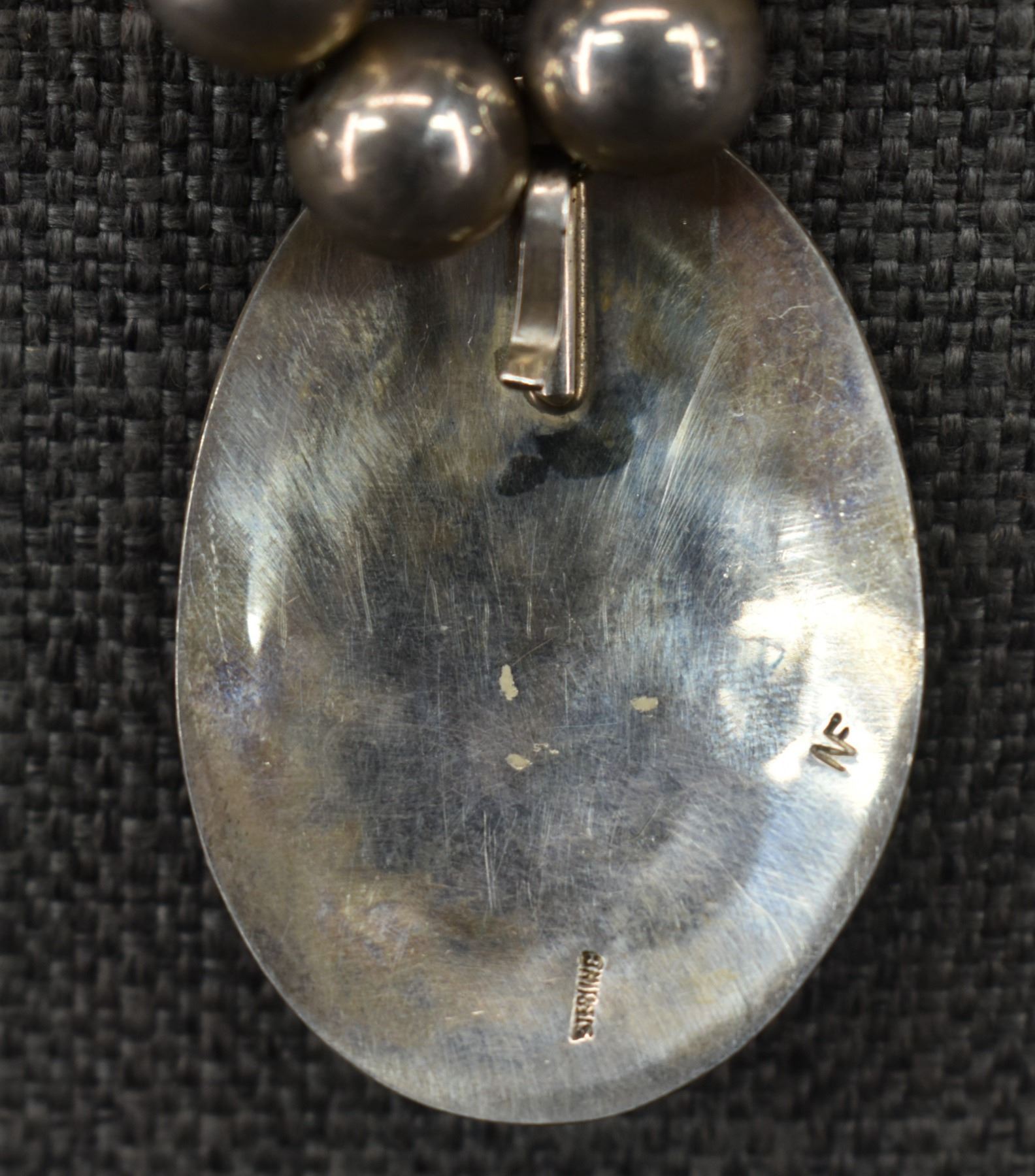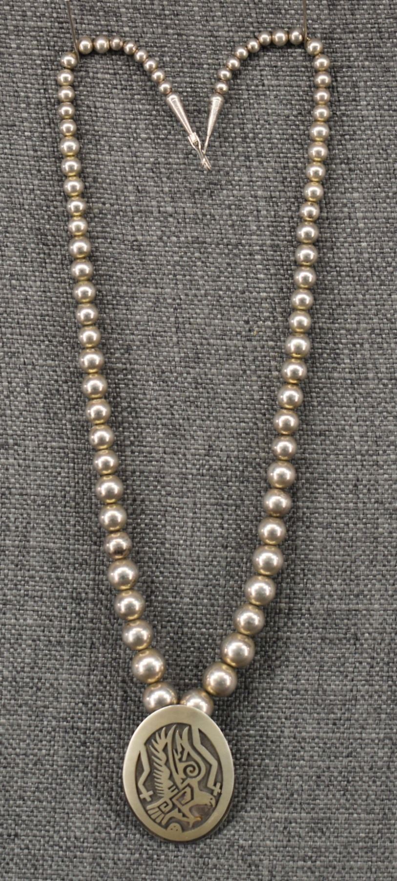 1980's Hopi. Sterling silver bead necklace 22'' long sterling pendant signed Nf. 2'' x 1.5'', total weight 63 grams