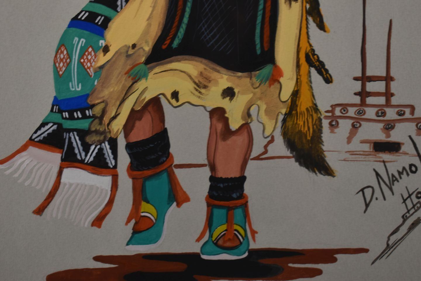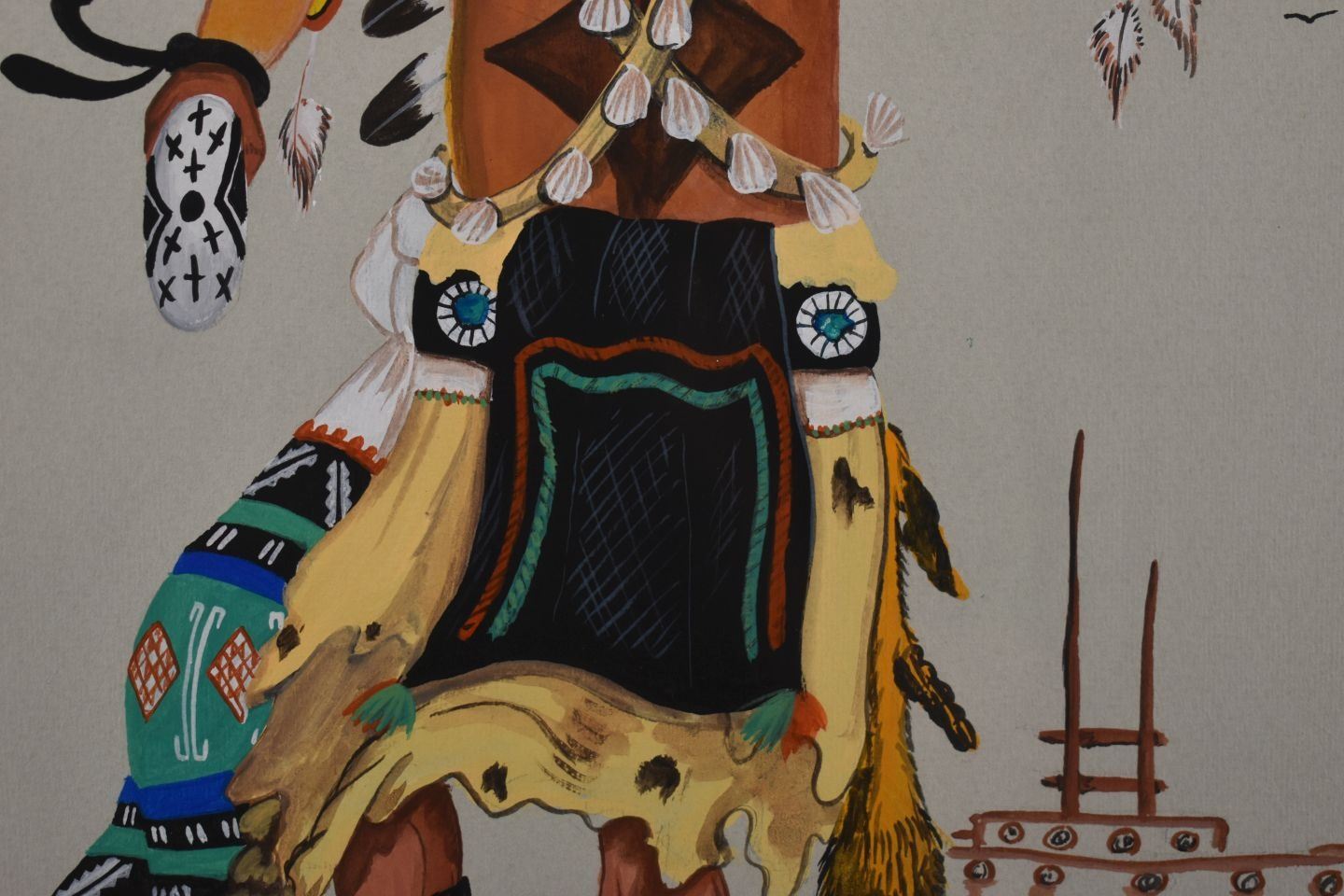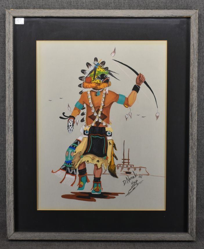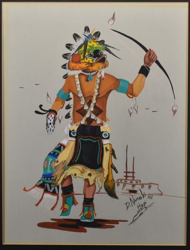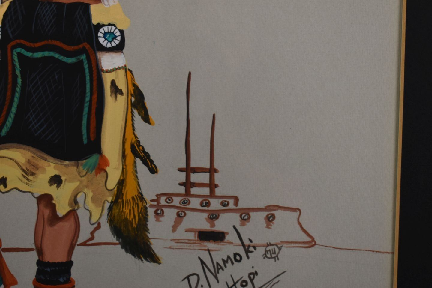 1974 Hopi, original hand painted kachina dancer signed D Namoki 17" x 13" matted and framed to 23" x 19"