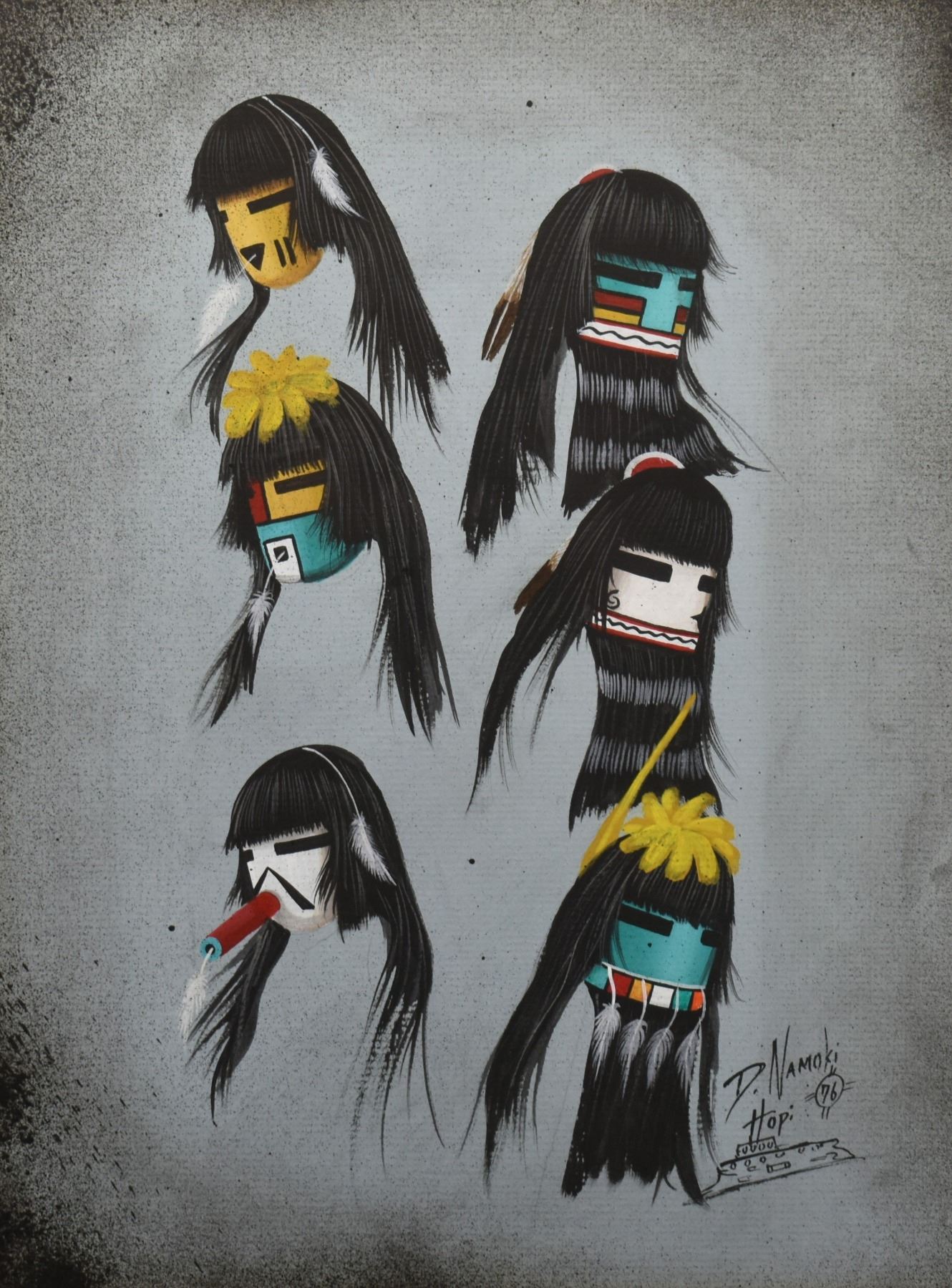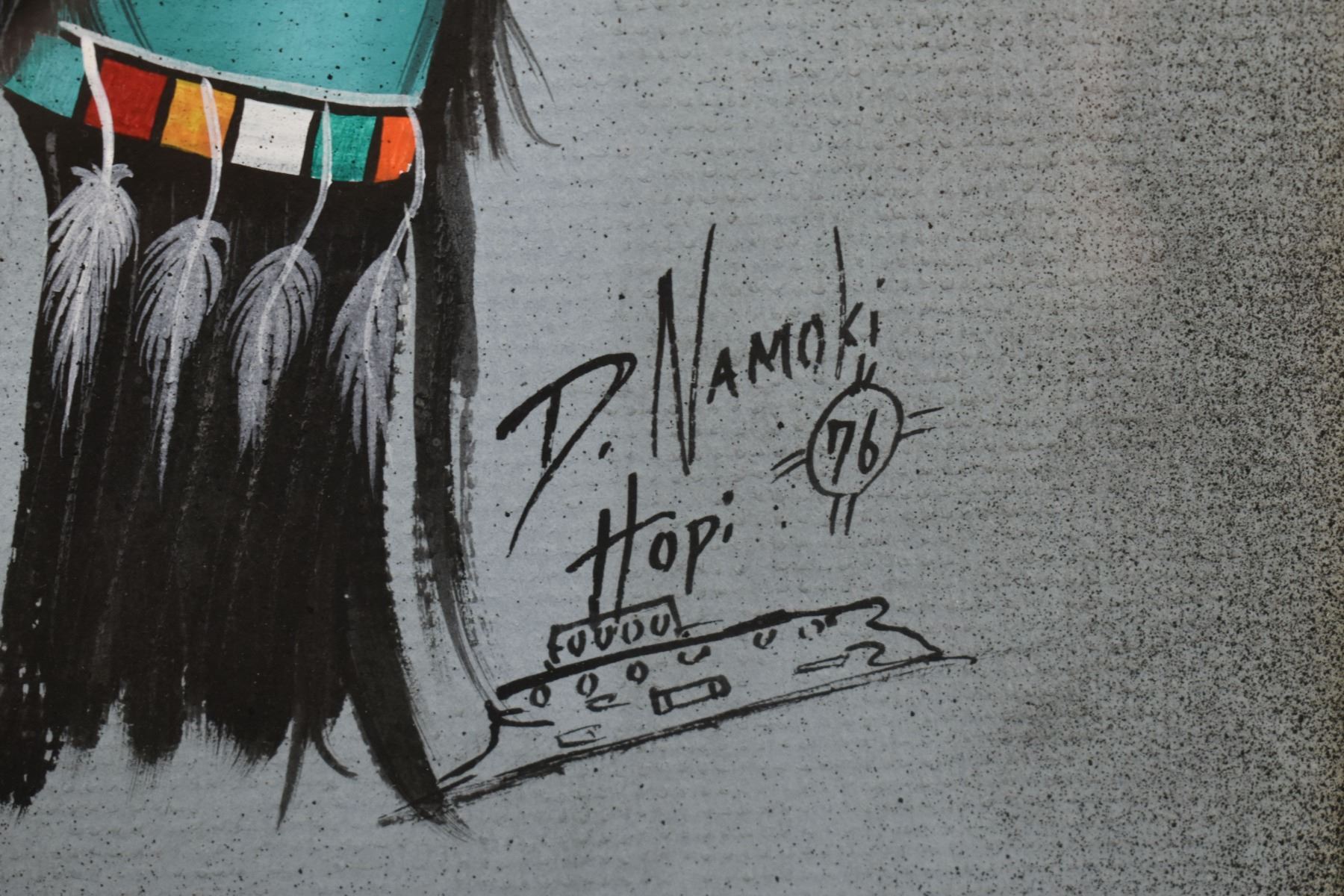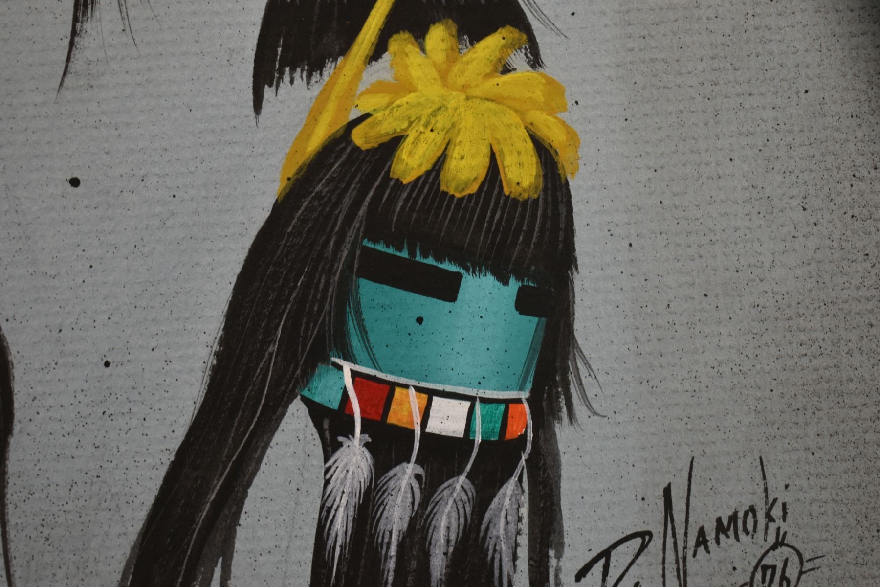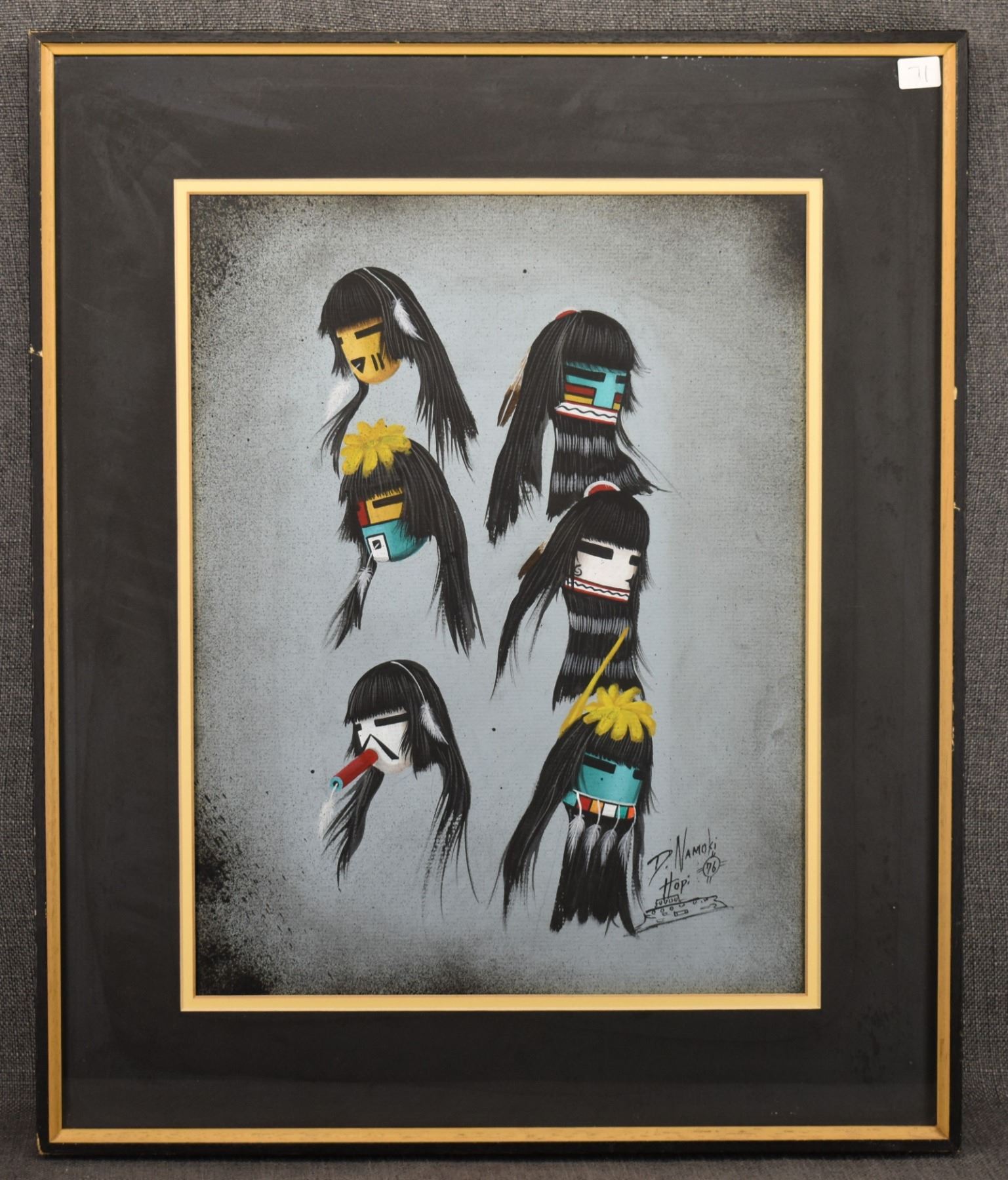 1976 Hopi. Original on paper depicting long hair kachinas. Signed D. Namoki. 17'' x 13'' frame size 24'' x 20''