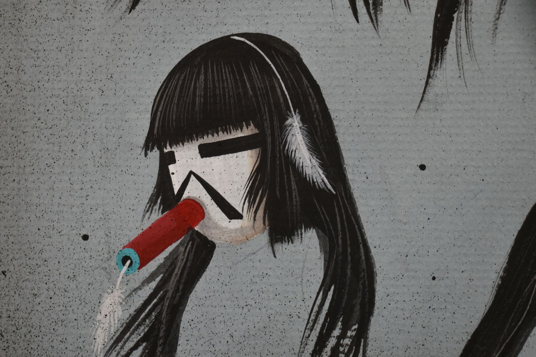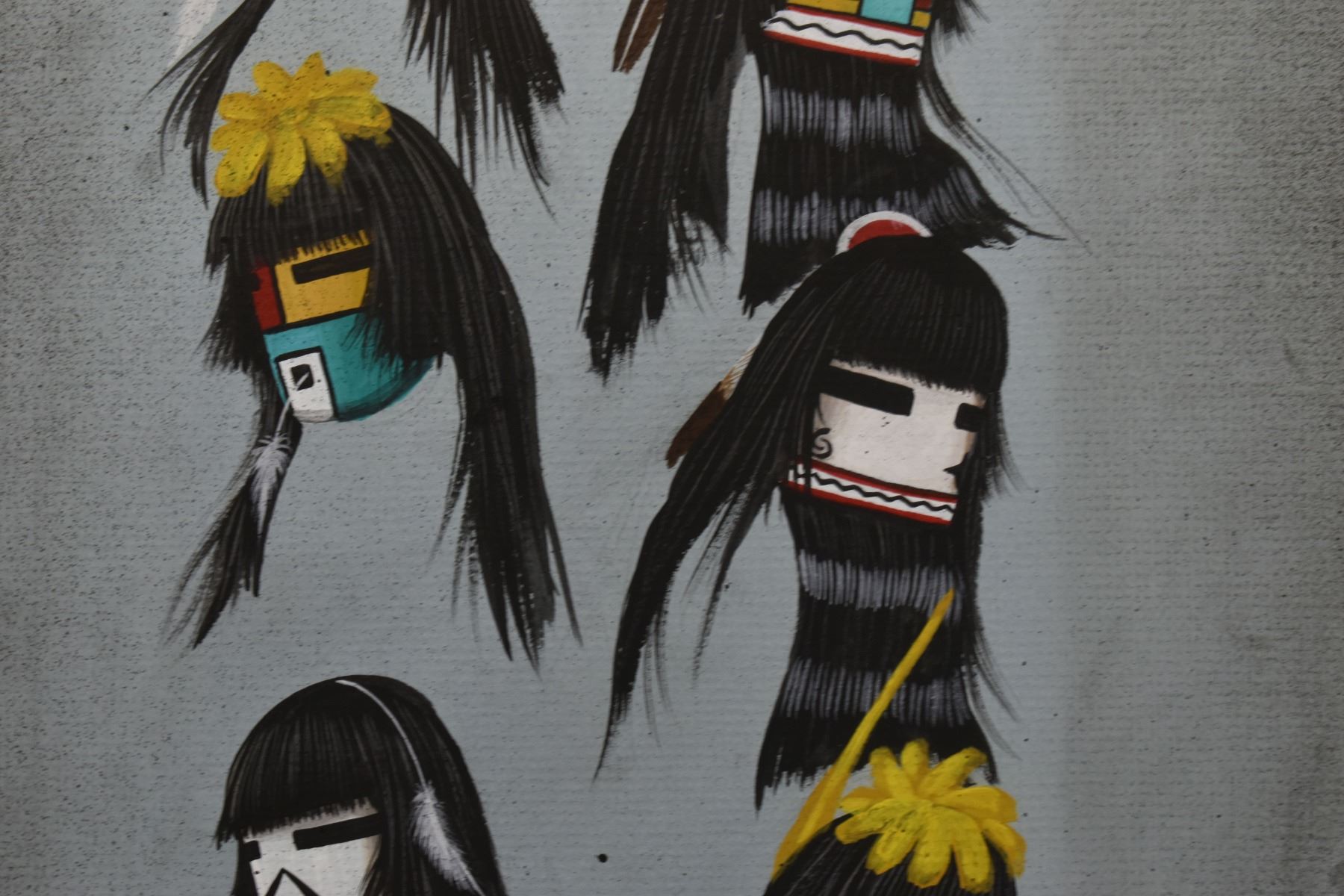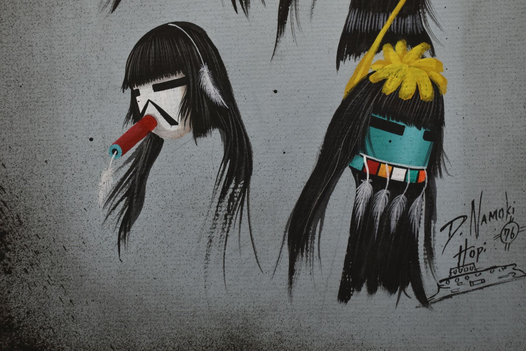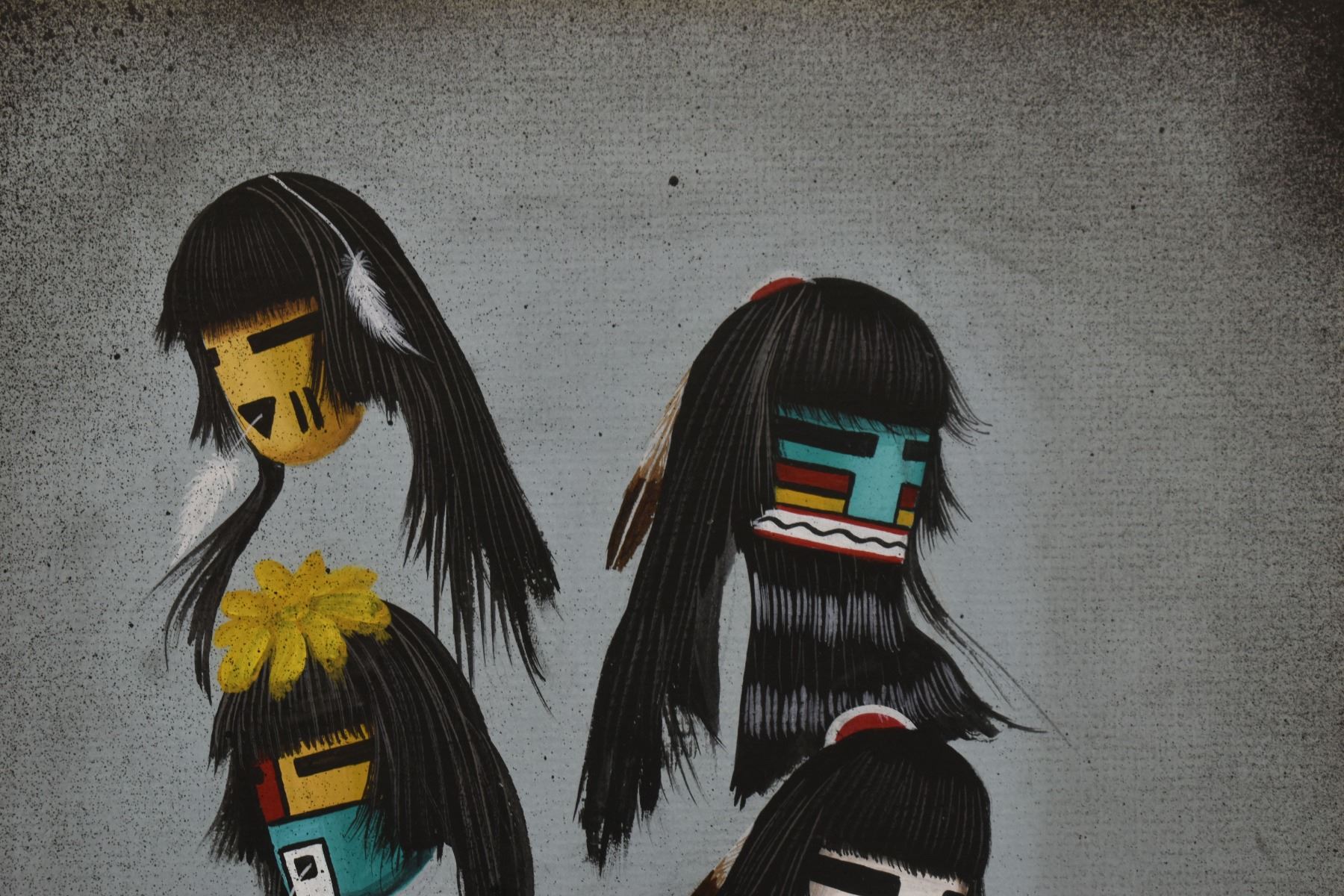 1976 Hopi. Original on paper depicting long hair kachinas. Signed D. Namoki. 17'' x 13'' frame size 24'' x 20''