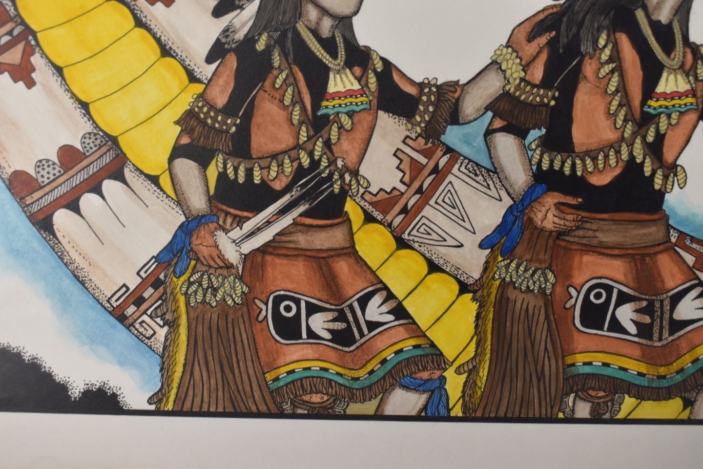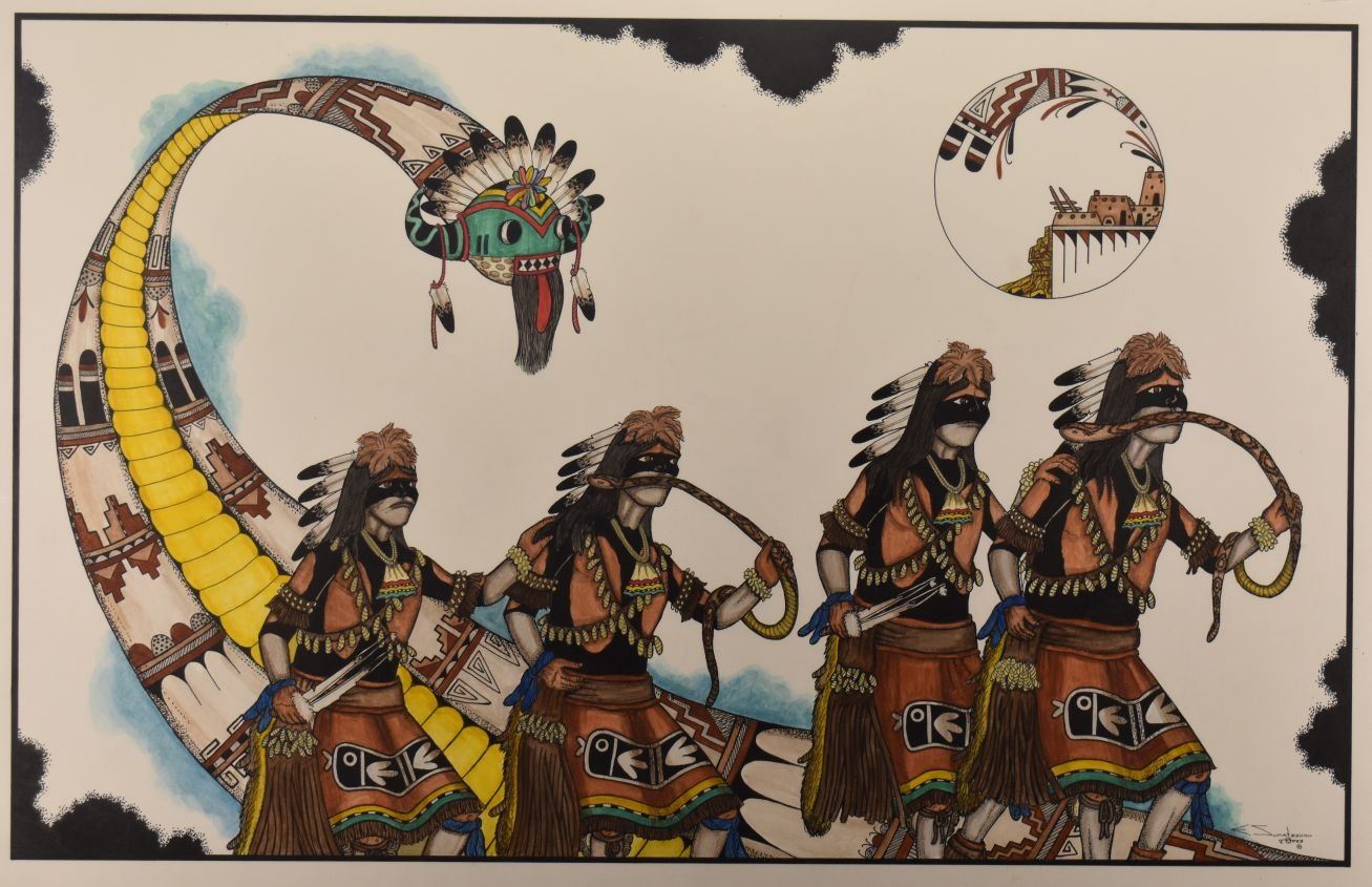 2003 Hopi, original hand painted depicting Snake Dancer scene by Edward Sumatzkuku 19.5" x 29.5" framed to 22.5" x 32.5"