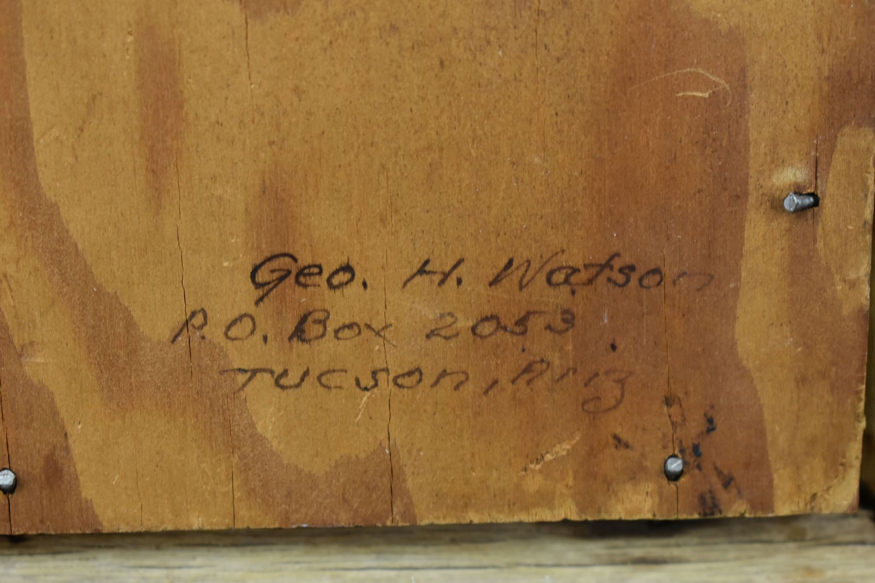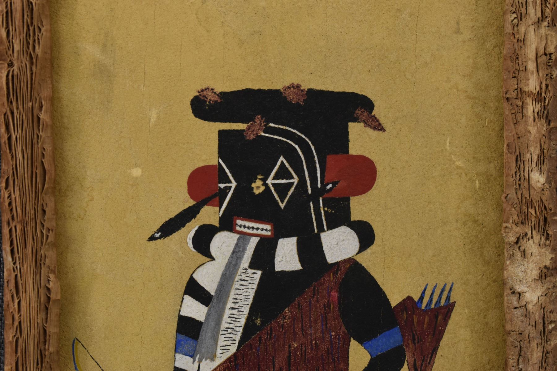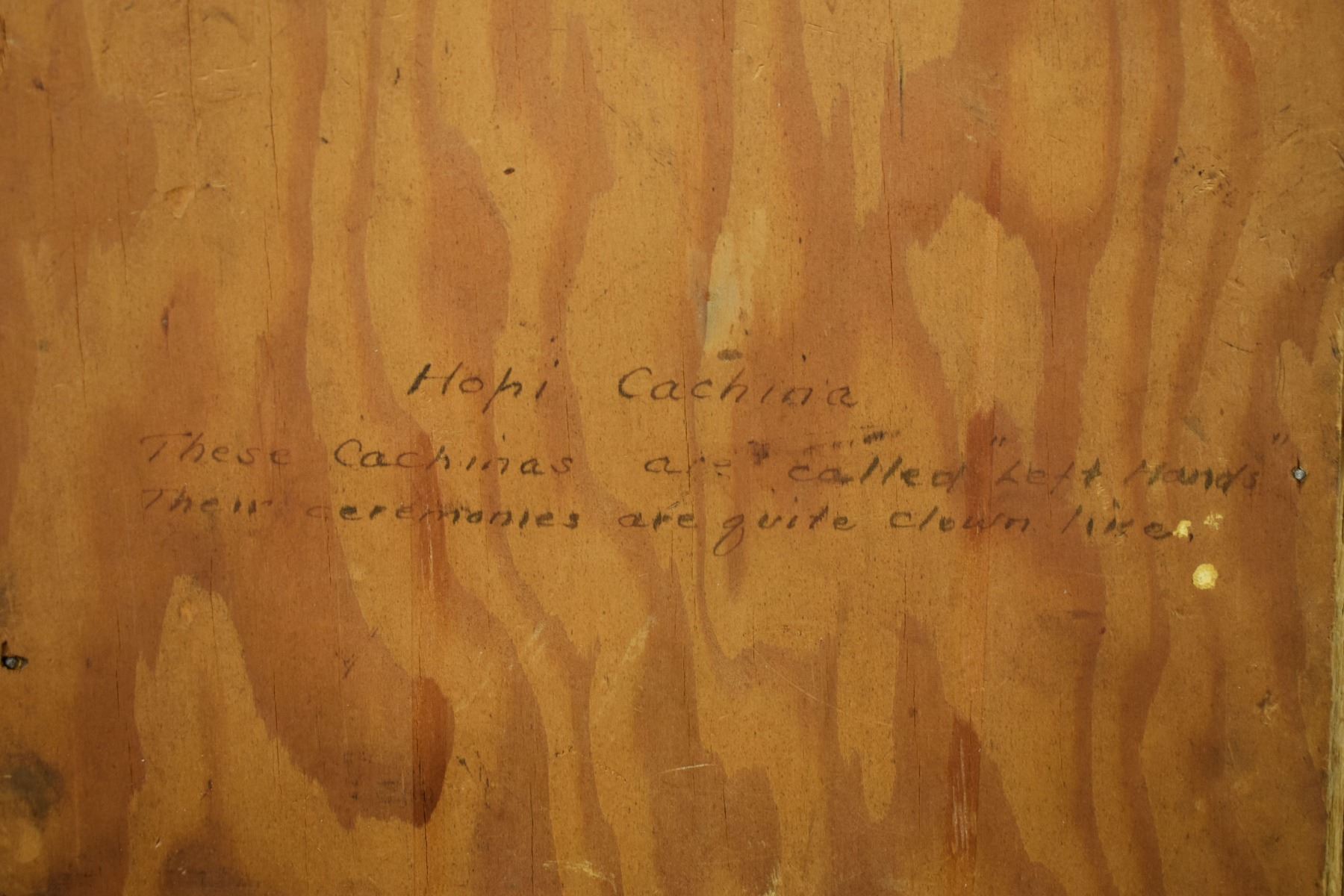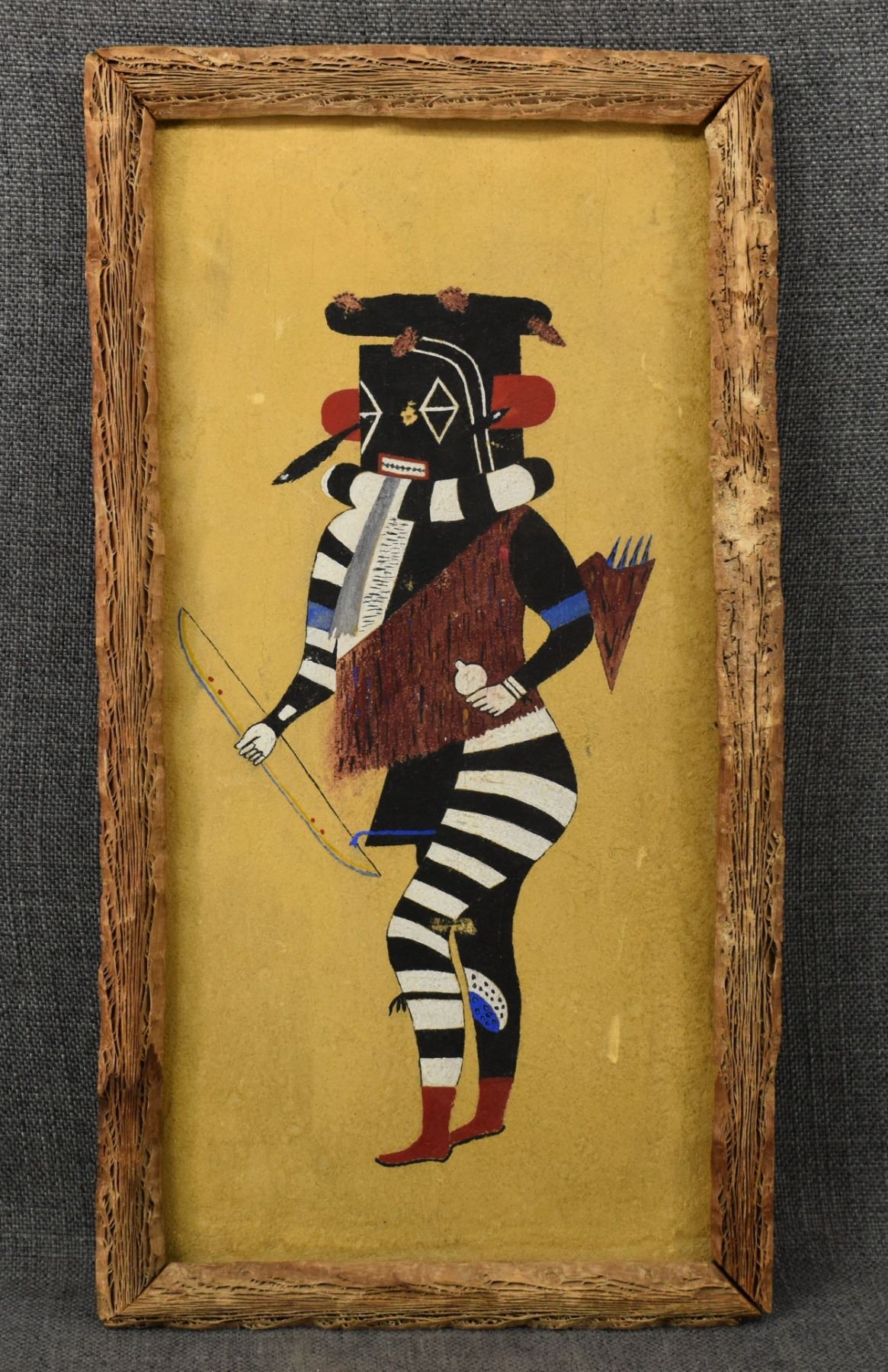 1970's Hopi, original hand painted on board depicting left hand kachina signed Geo H Watson, 15.5' x 7.5" framed to 17.5" x 9.25"