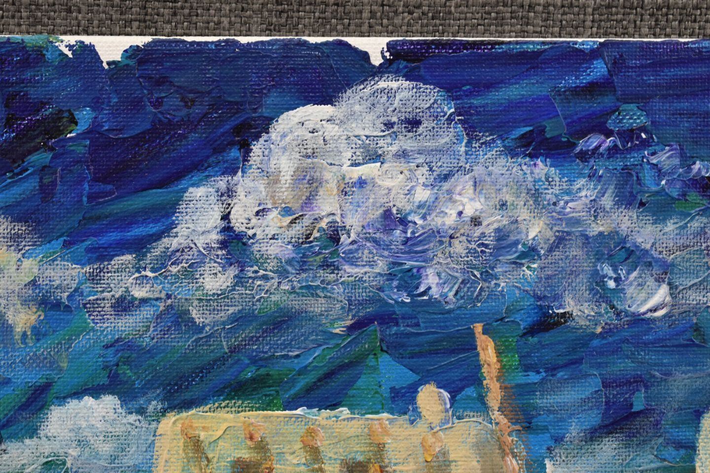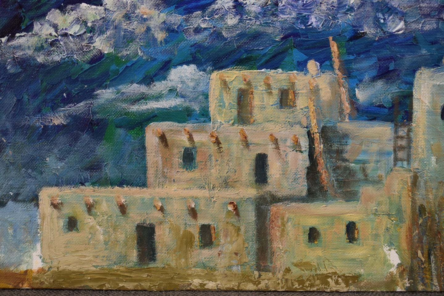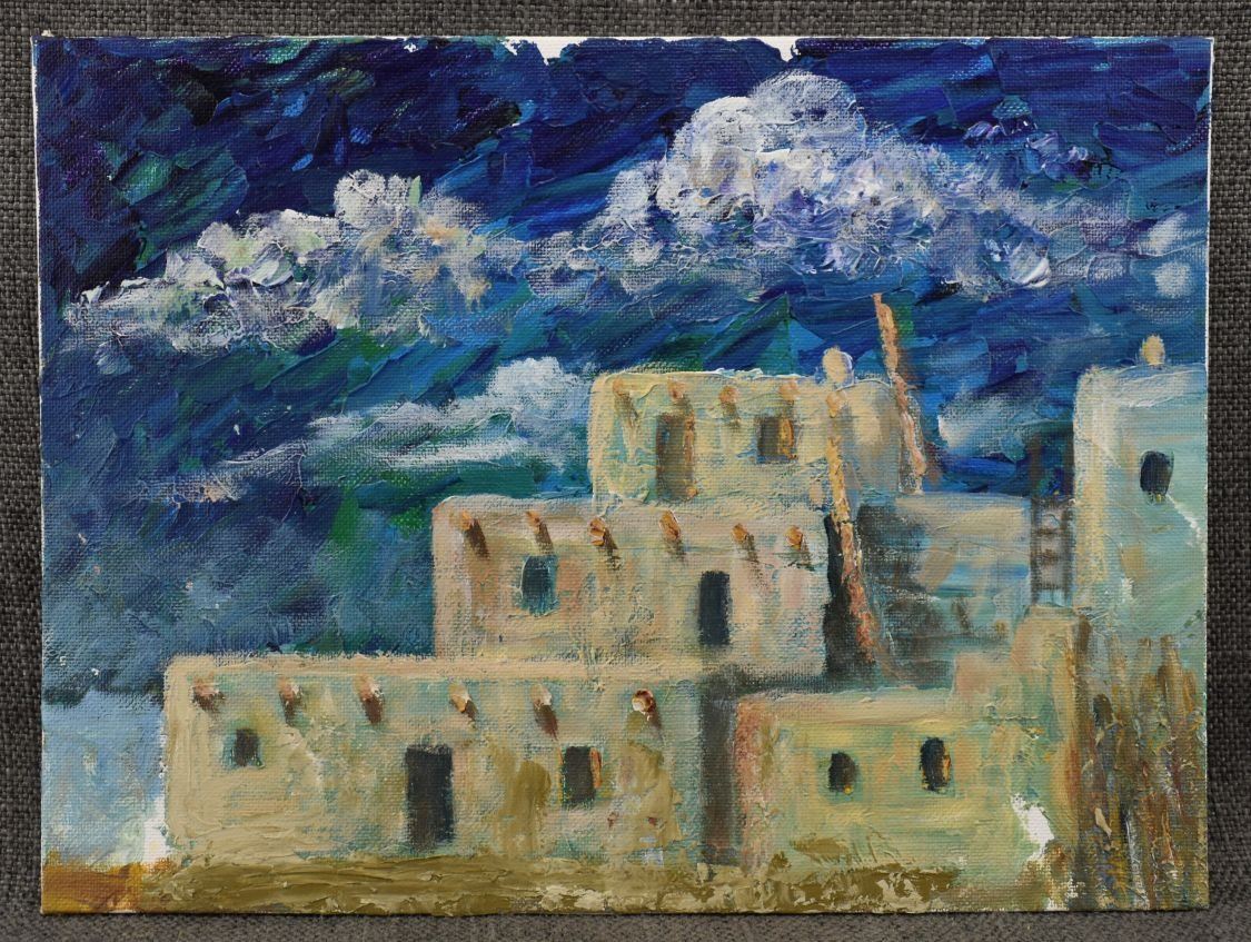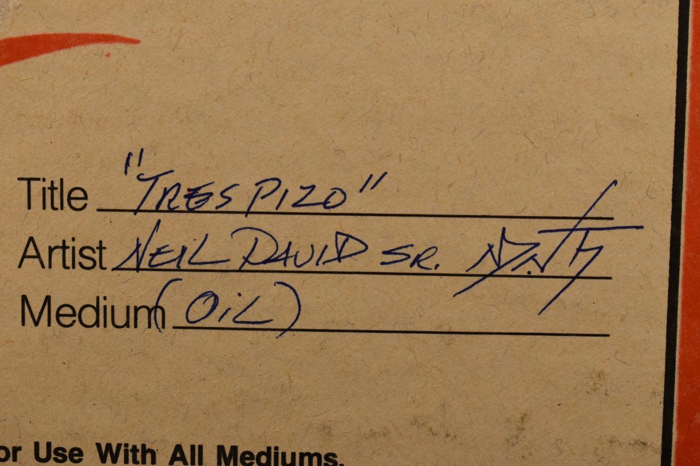 1990-2000's Hopi, original hand painted oil on artist board titled "Tres Pizo" by Neil David 9" x 12"