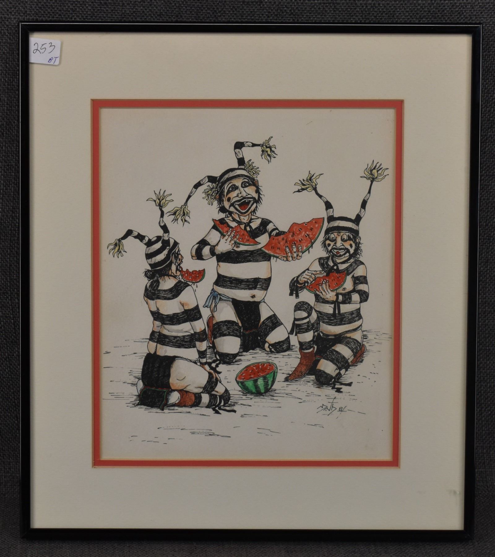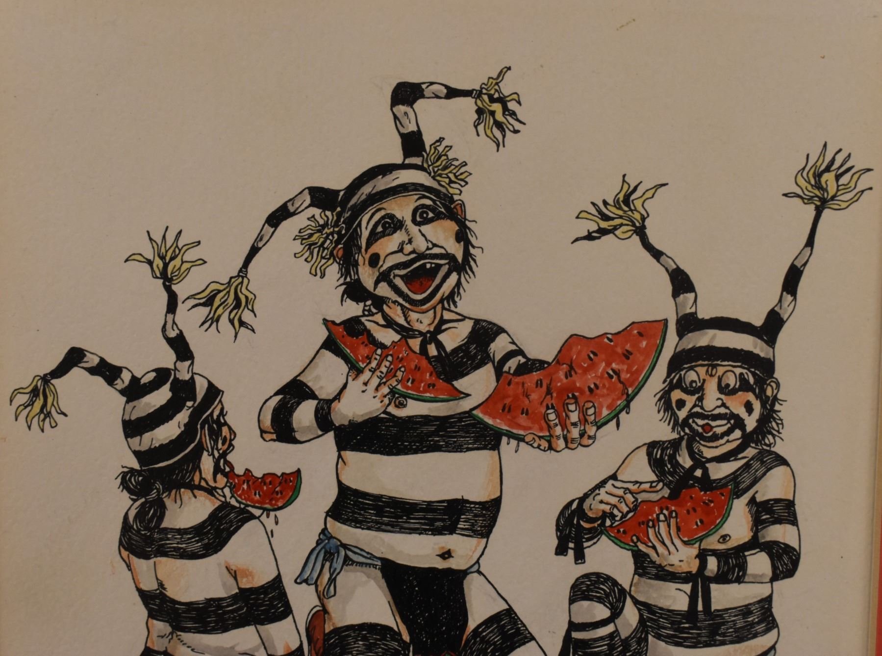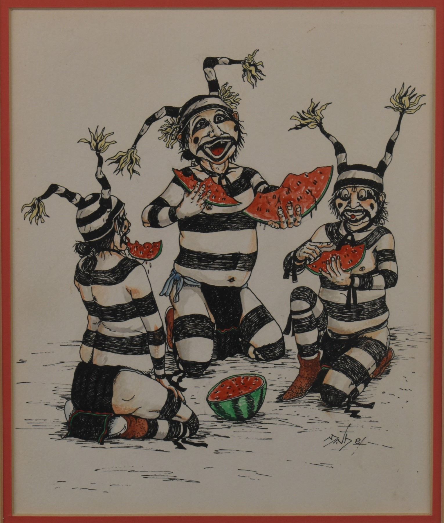 1980's Hopi, original hand painted on paper depicting Kosharis eating watermelon by Neil David, 9" x 7.5" framed to 13.25" x 11.75"