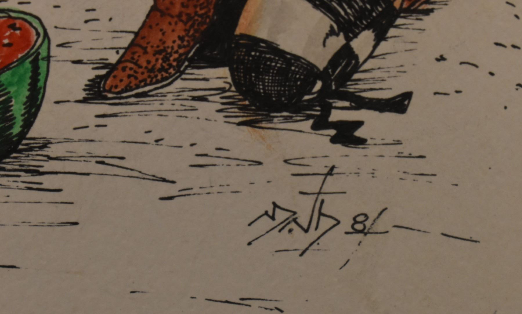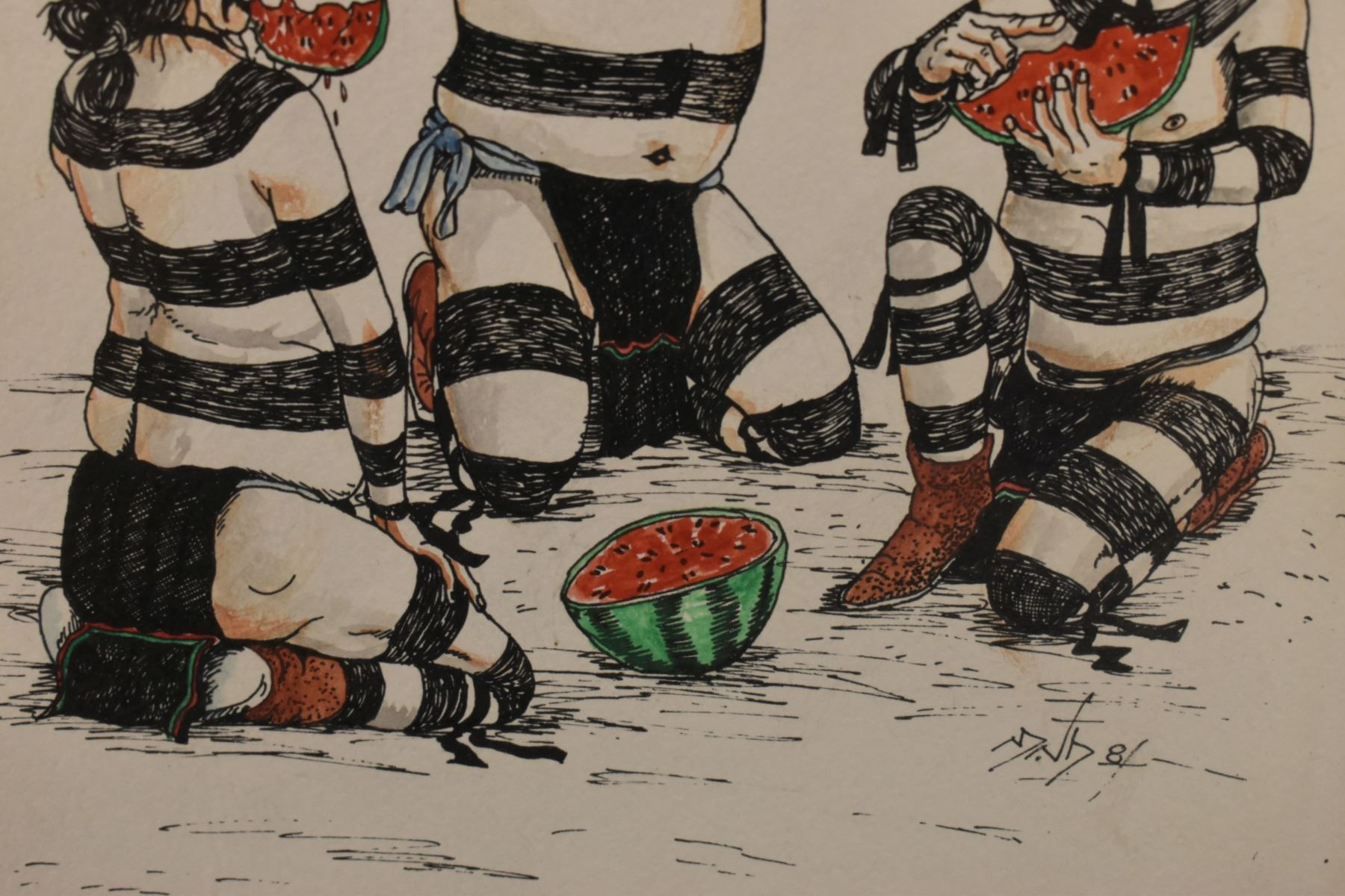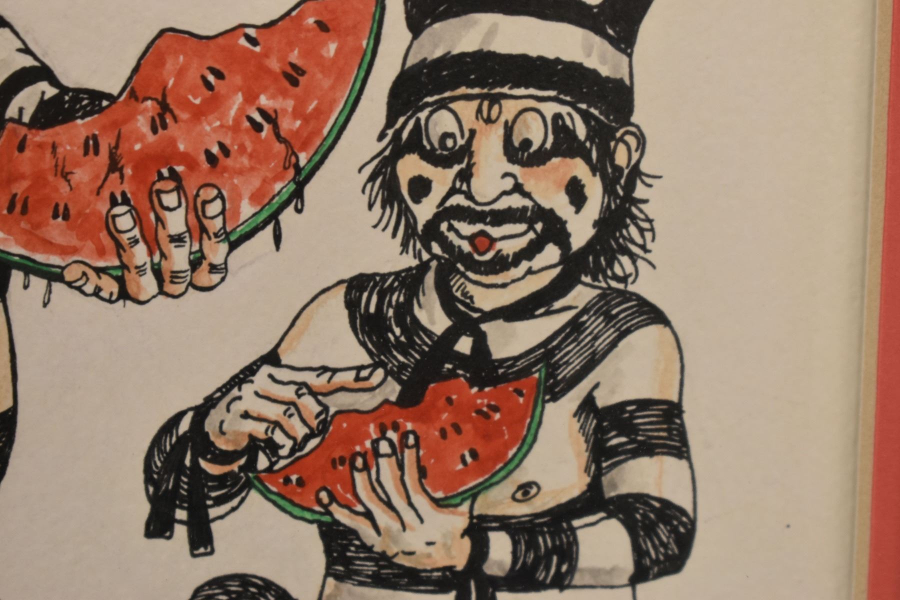 1980's Hopi, original hand painted on paper depicting Kosharis eating watermelon by Neil David, 9" x 7.5" framed to 13.25" x 11.75"