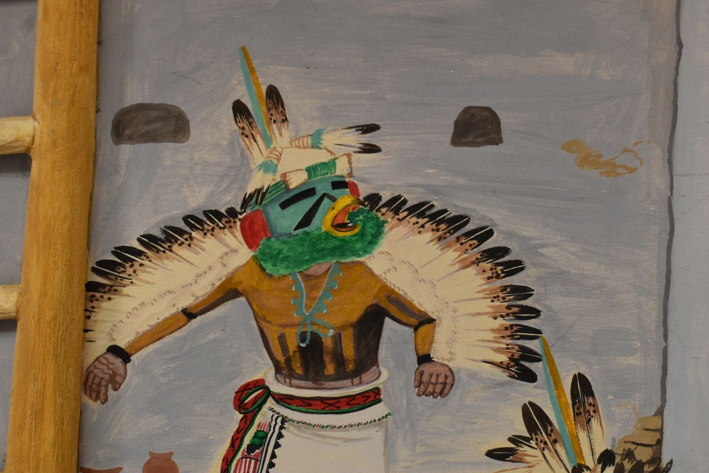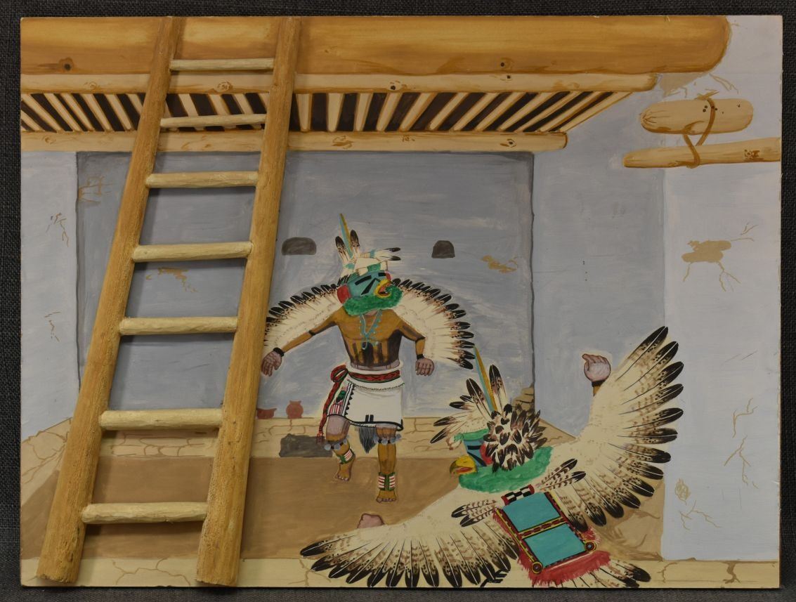 1960-70's Hopi, original hand painted depicting eagle dancers in kiva with 3d wooden ladder 15" x 20"