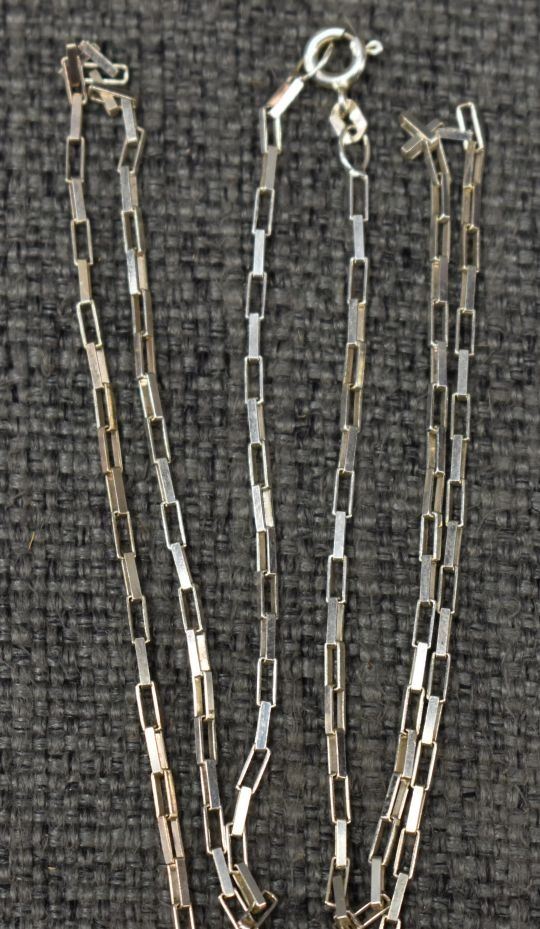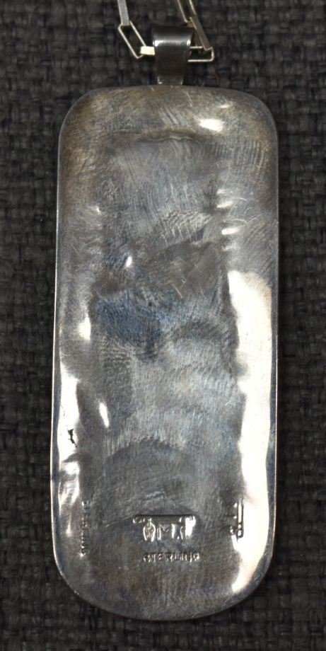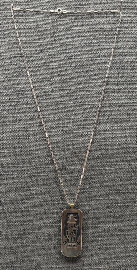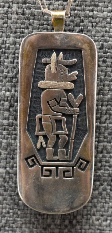 2000's Hopi, sterling silver with cut out design depicting kachina 2.75" x 1" market with chiefs stick logo silver chain 22" long 24 grams