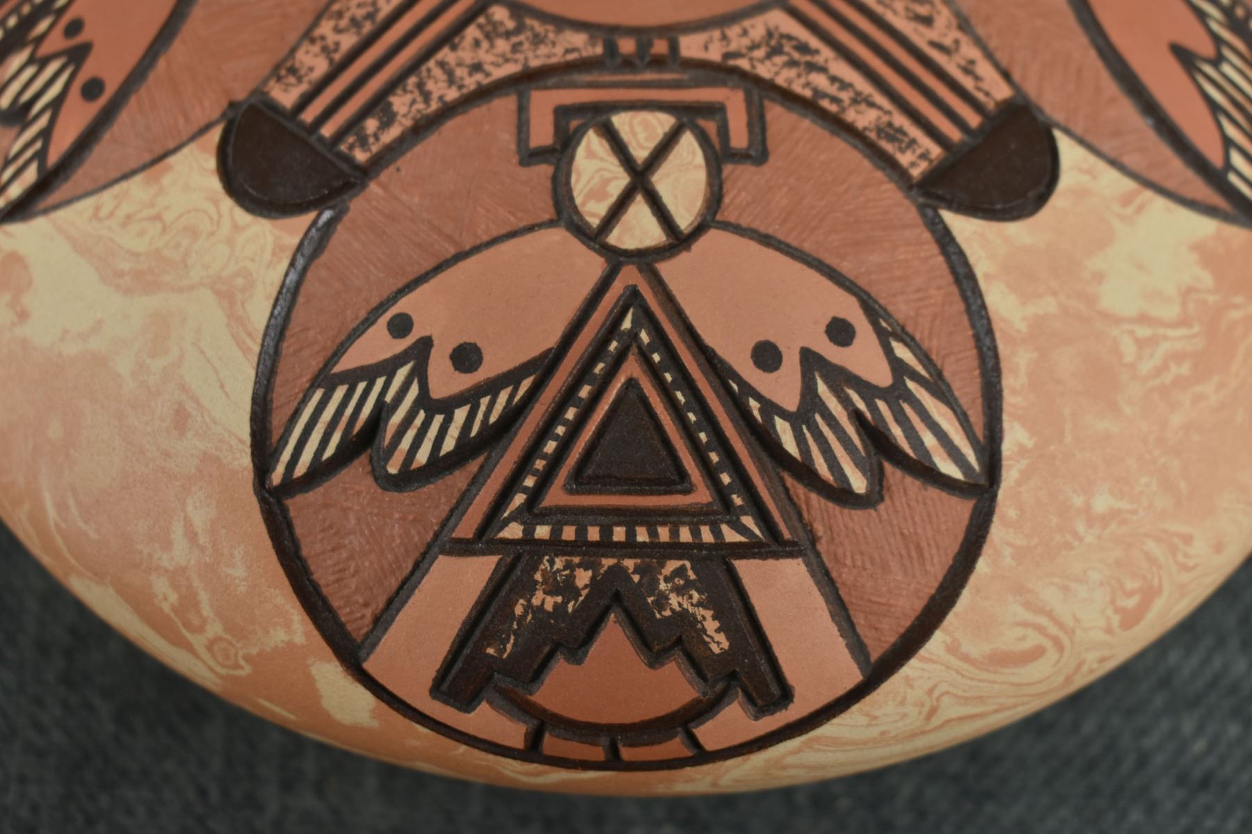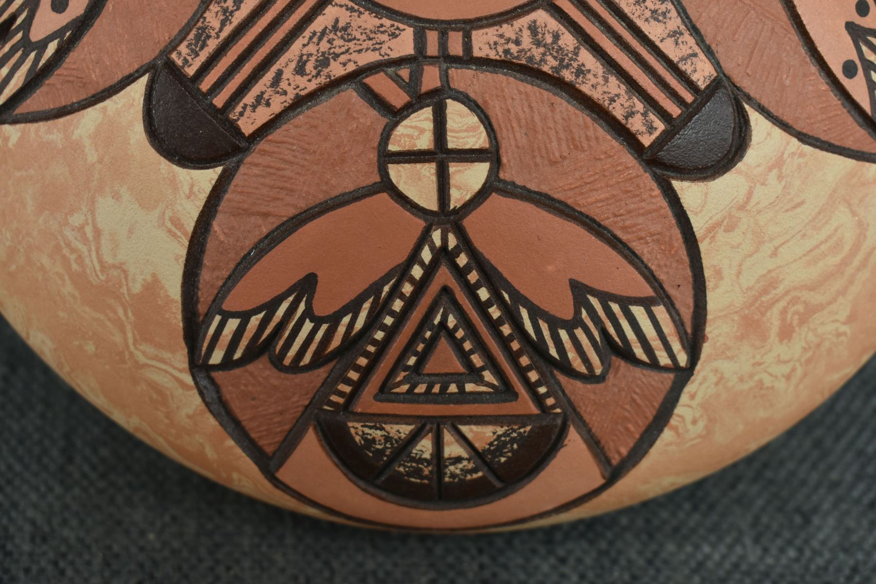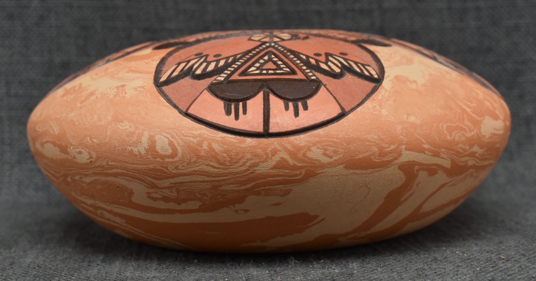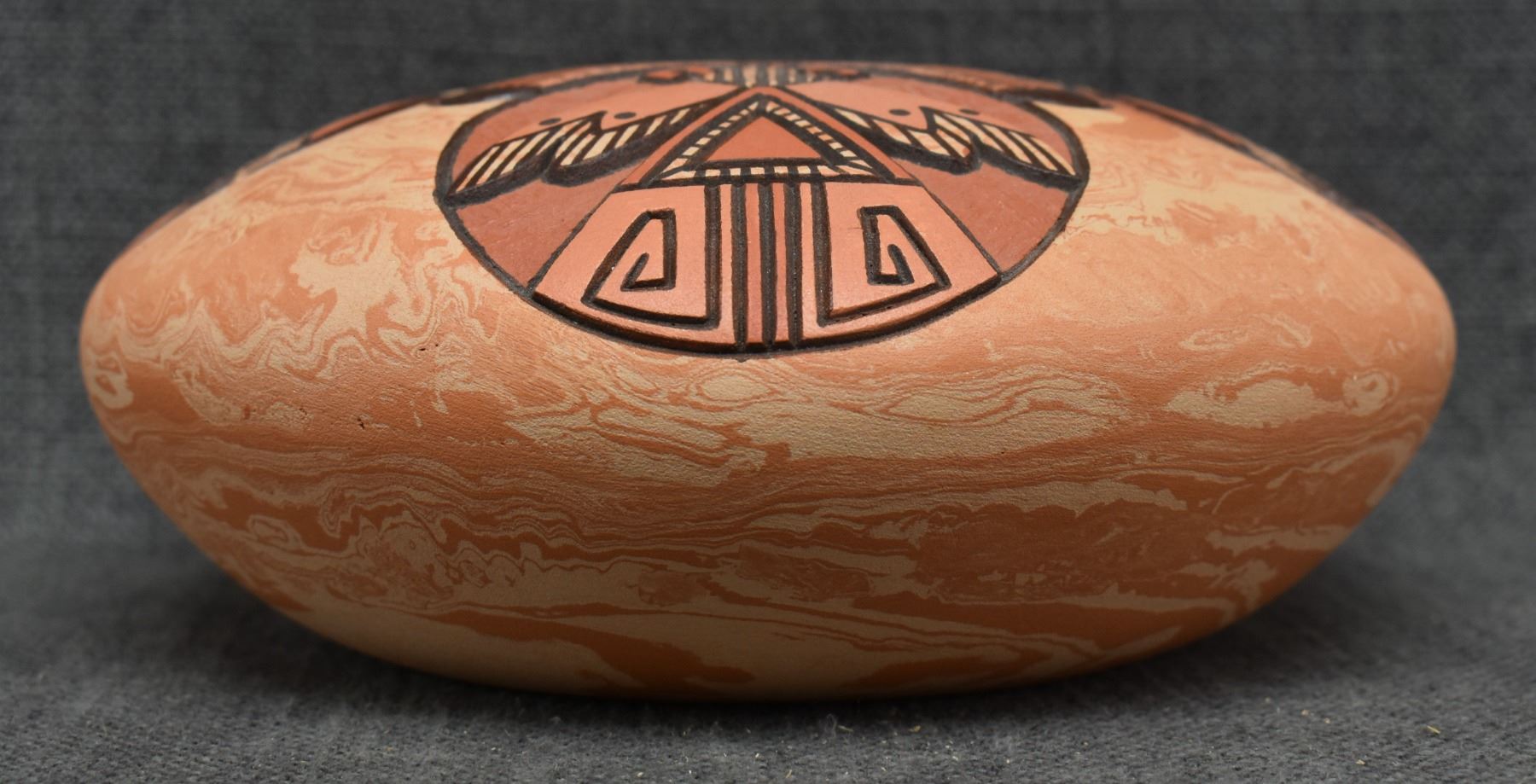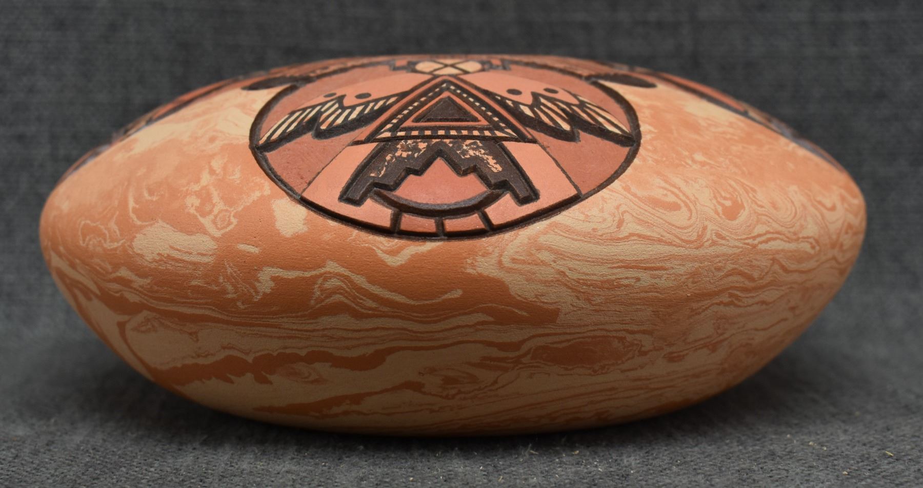 1990's Hopi, hand coiled with carved and painted humming bird design. signed Delmar Polacca Nampeyo. 3'' x 8''