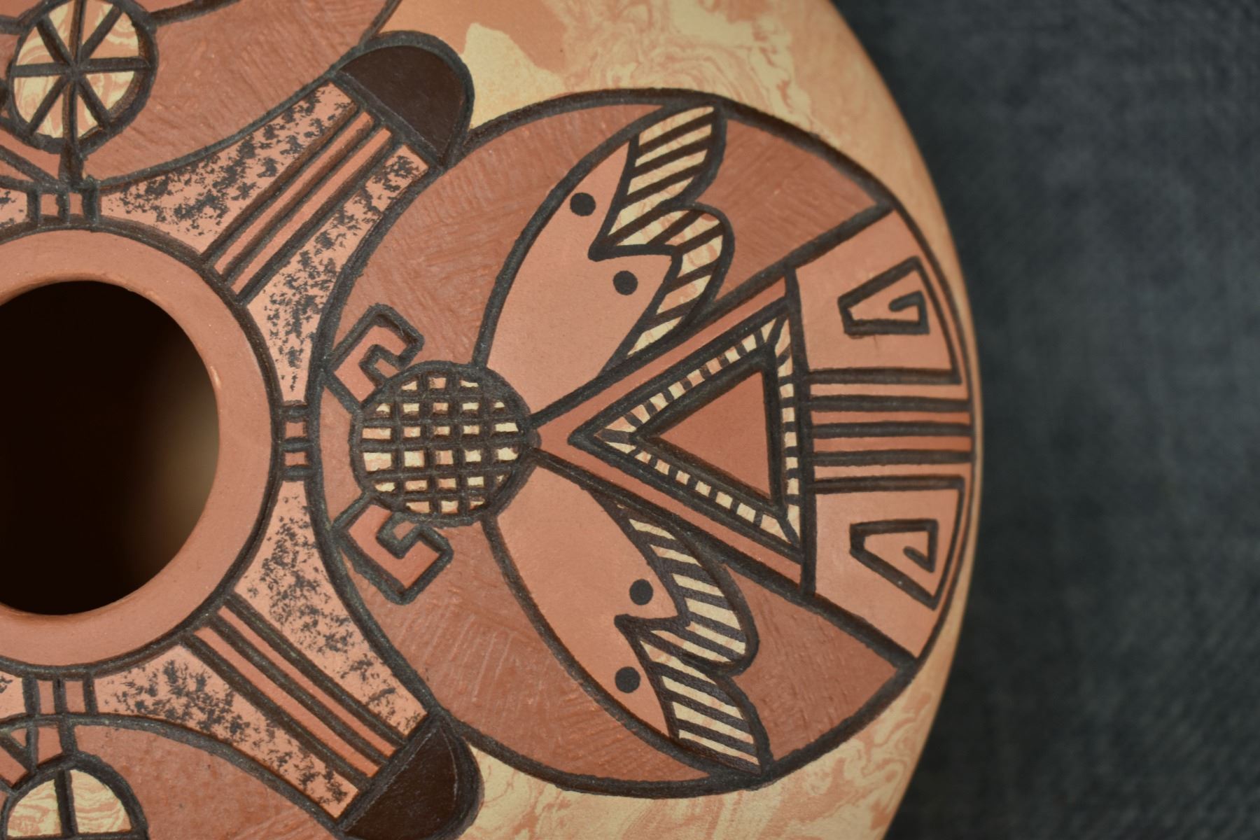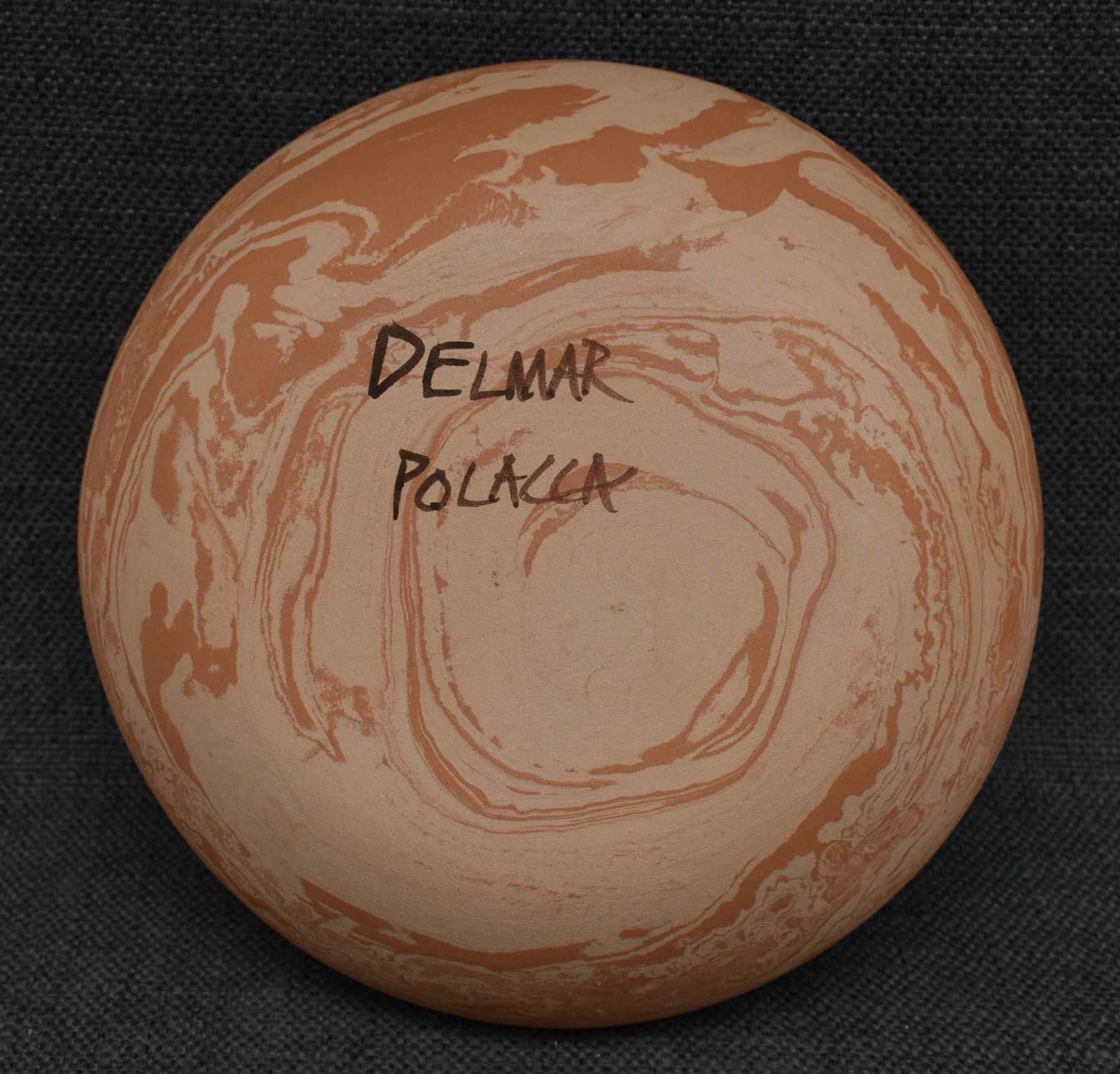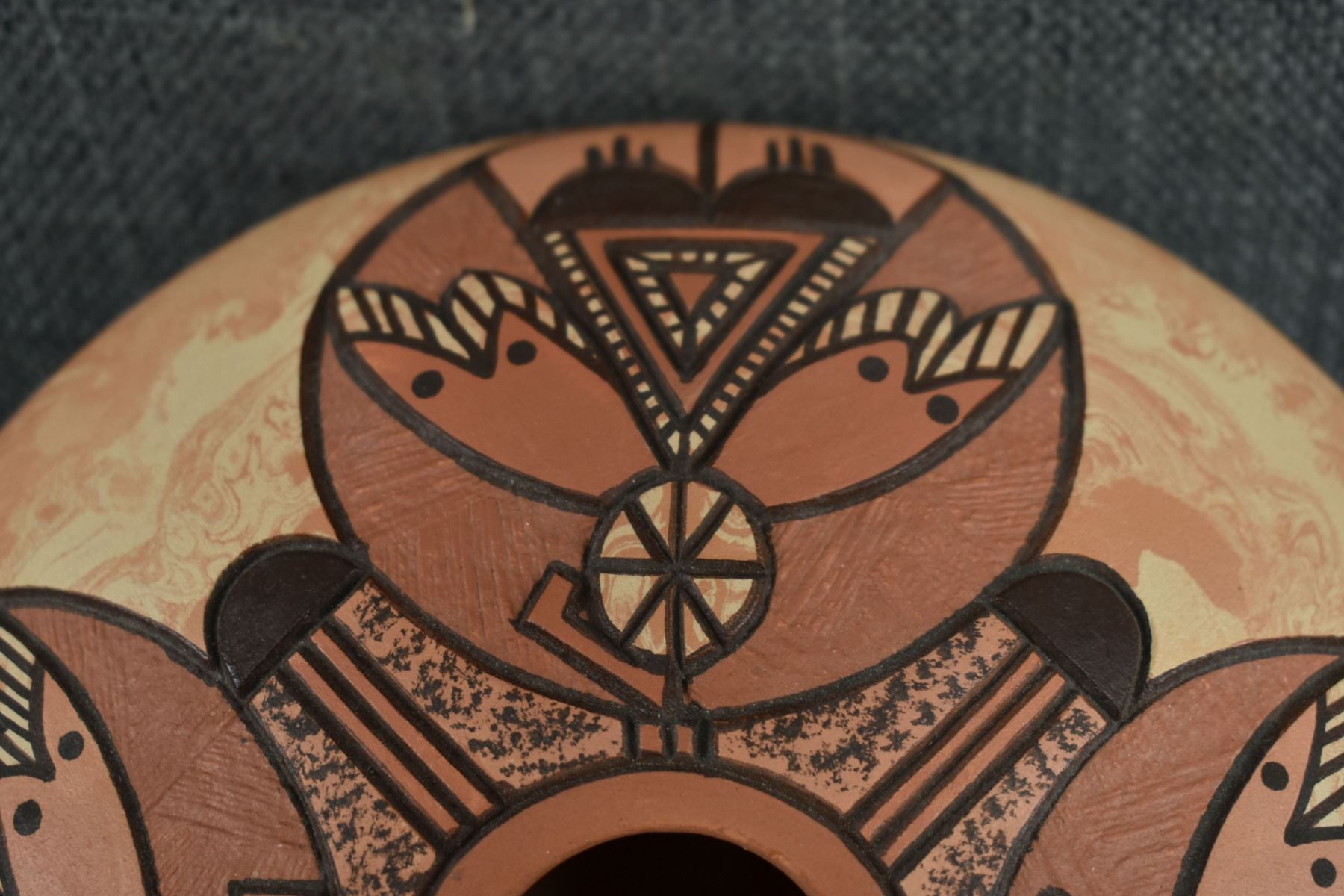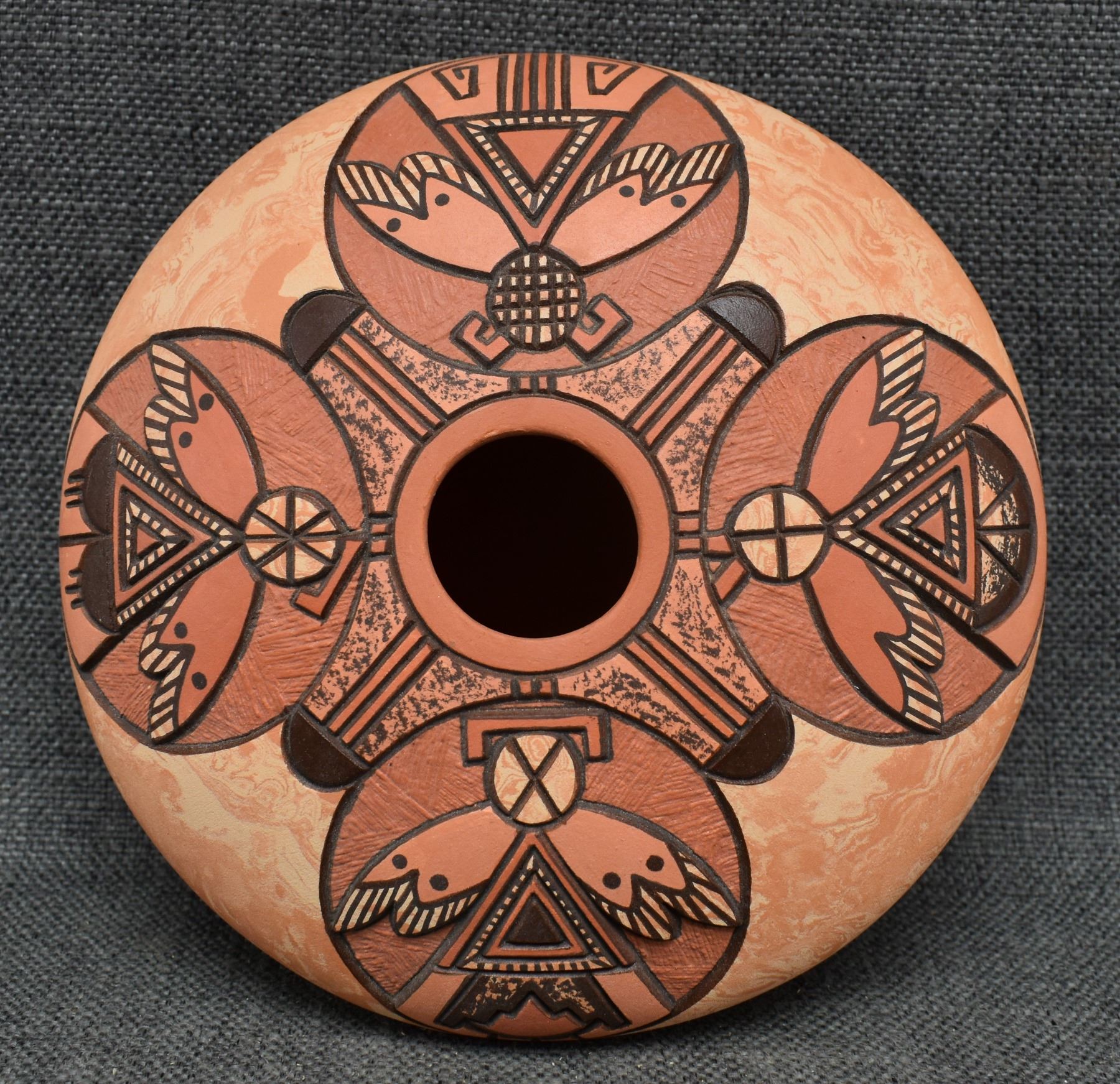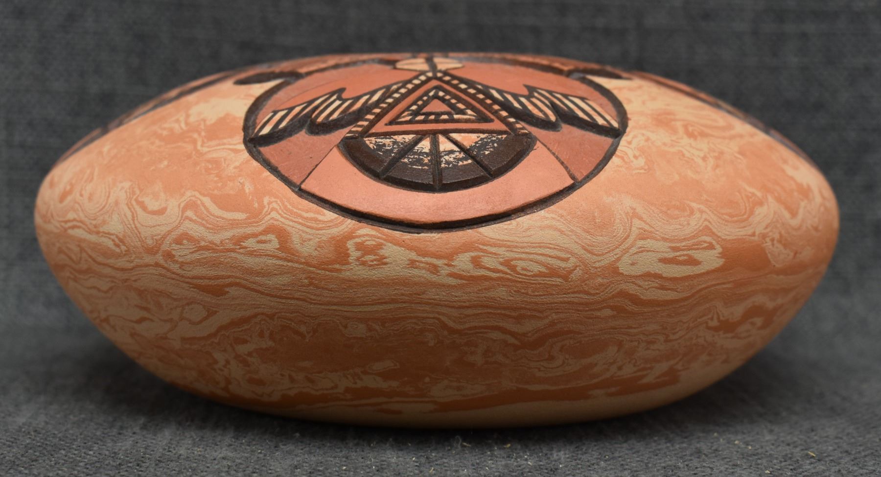 1990's Hopi, hand coiled with carved and painted humming bird design. signed Delmar Polacca Nampeyo. 3'' x 8''