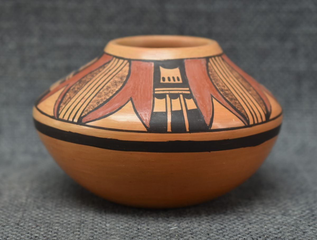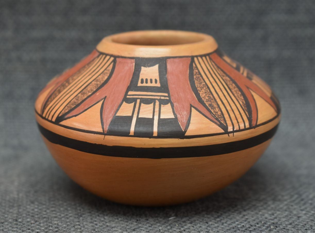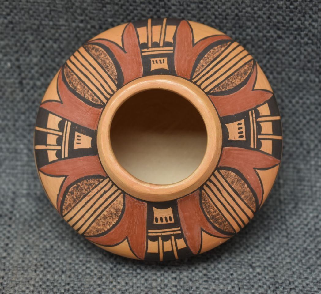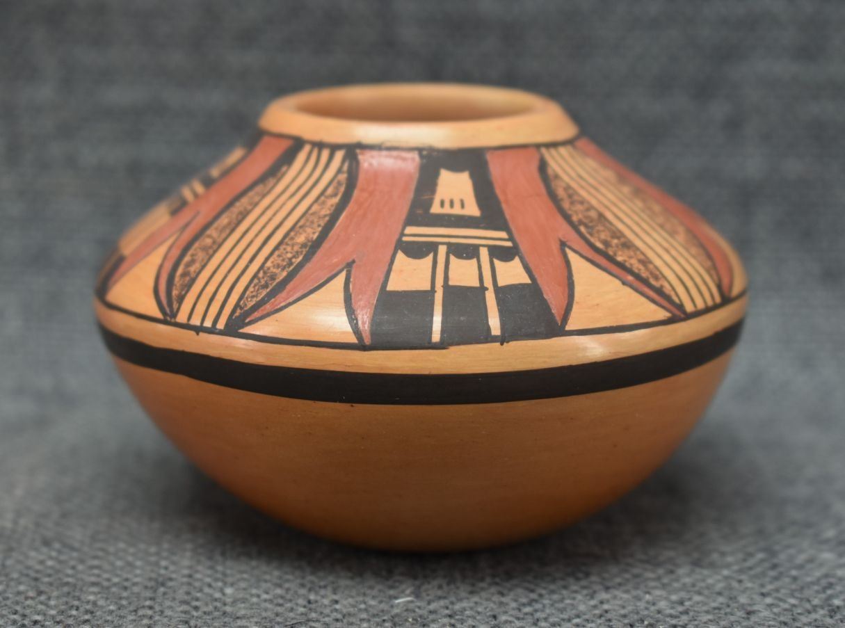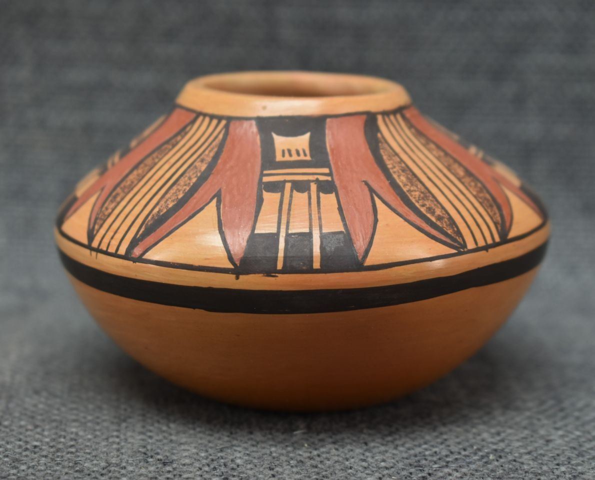 1980's Hopi, hand coiled with polychrome painted design 2.25" x 3.5"