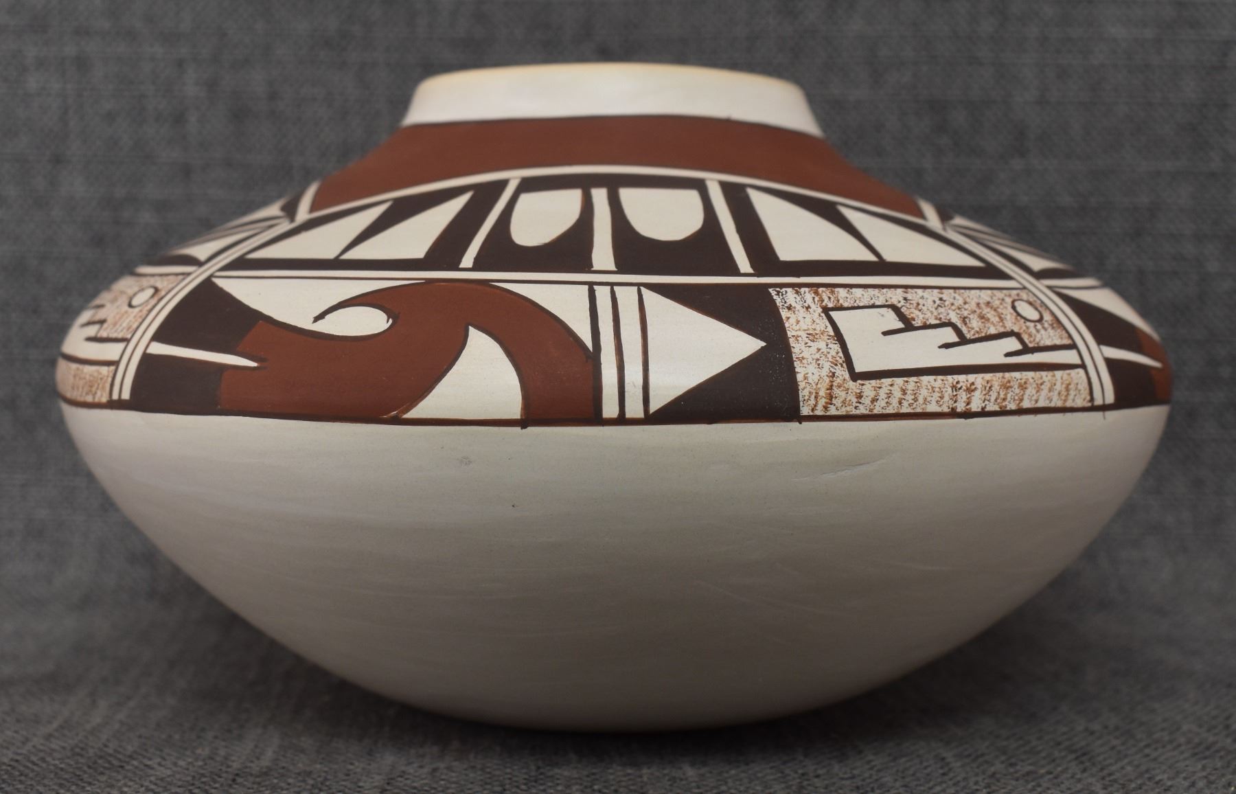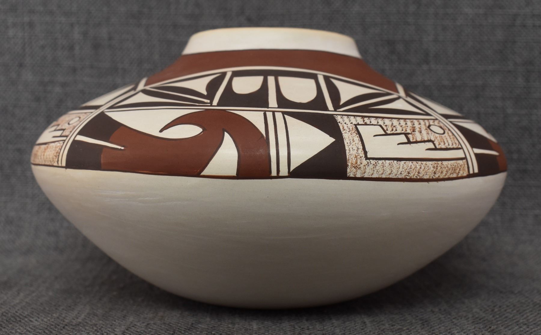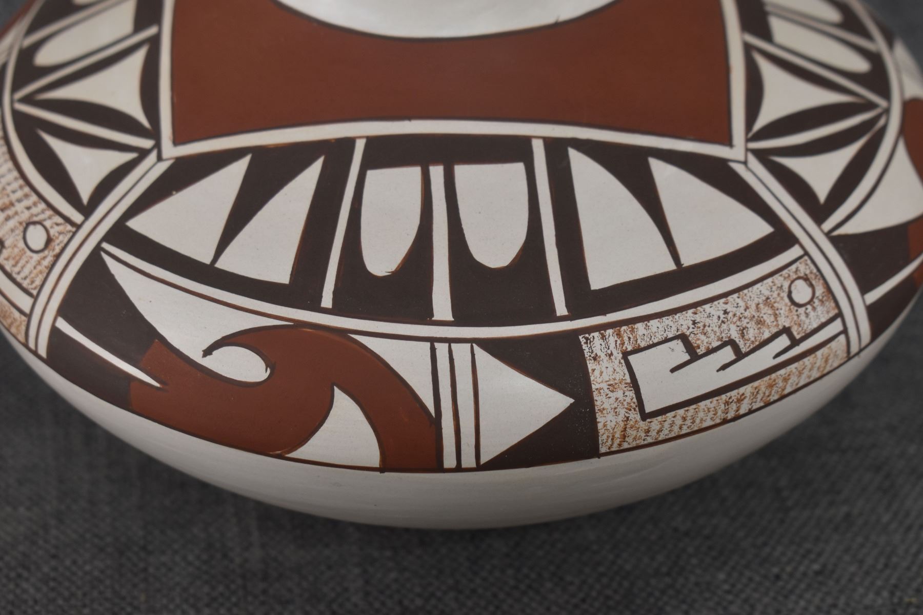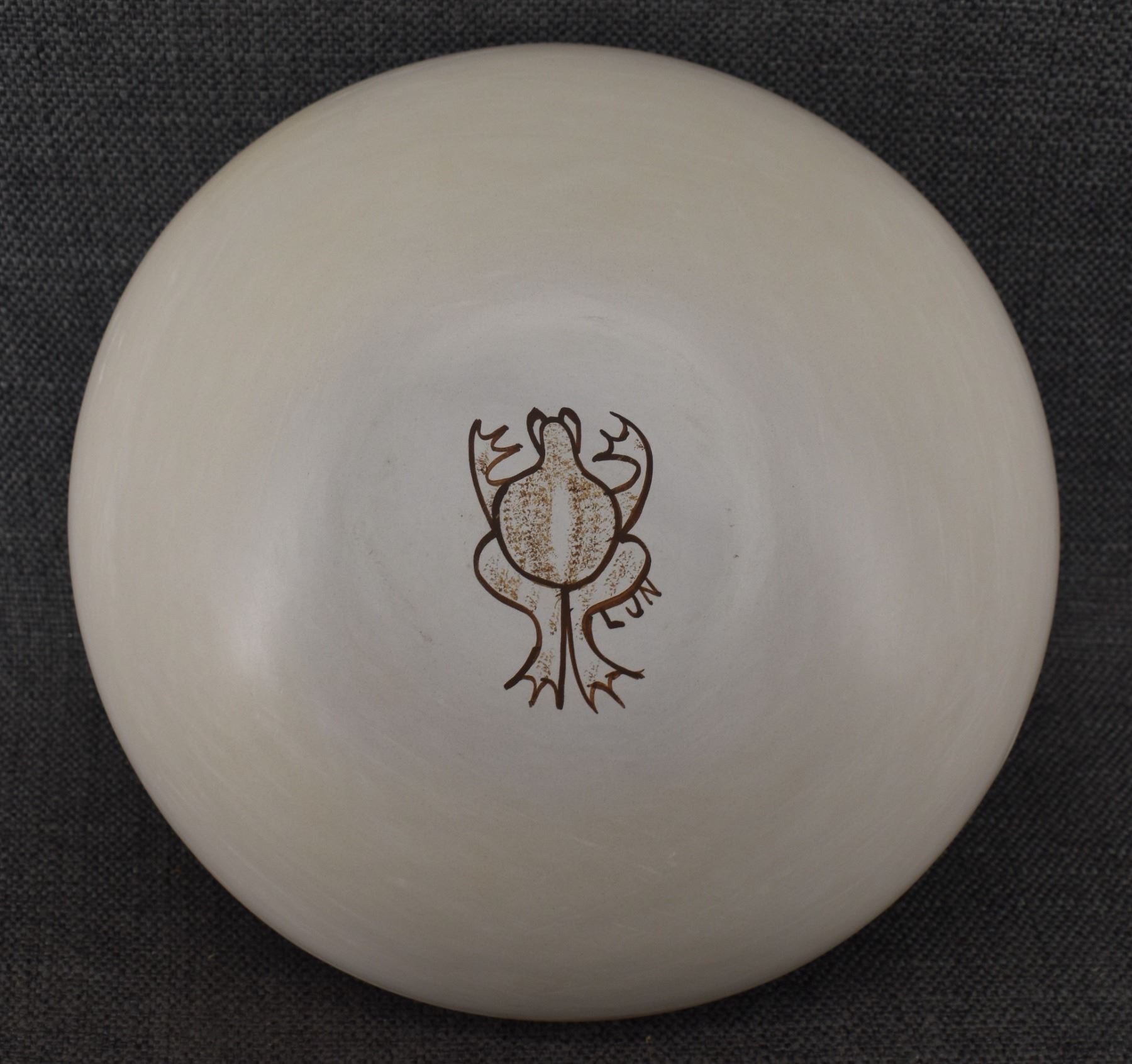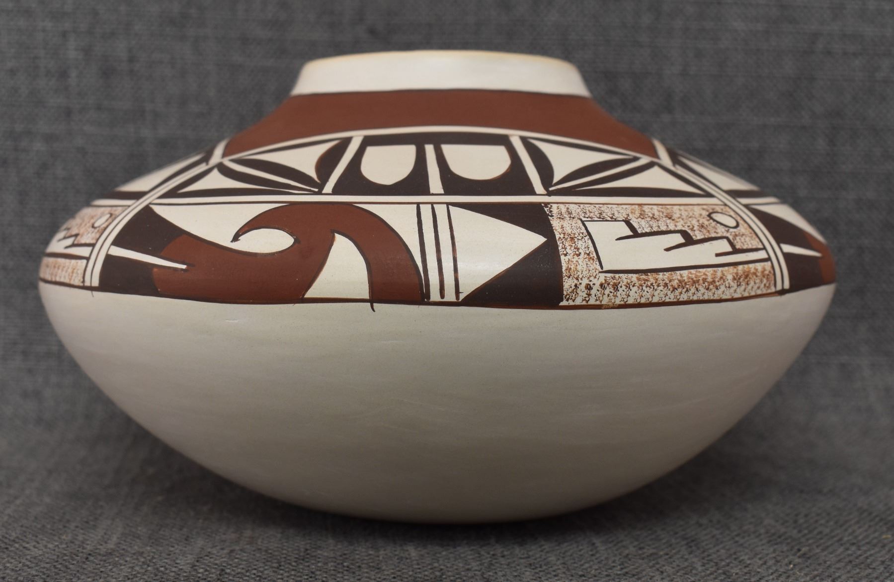 1970-80's Hopi hand coiled and polychrome painted design signed with frog logo for Joy Navasie. 5'' x 9''