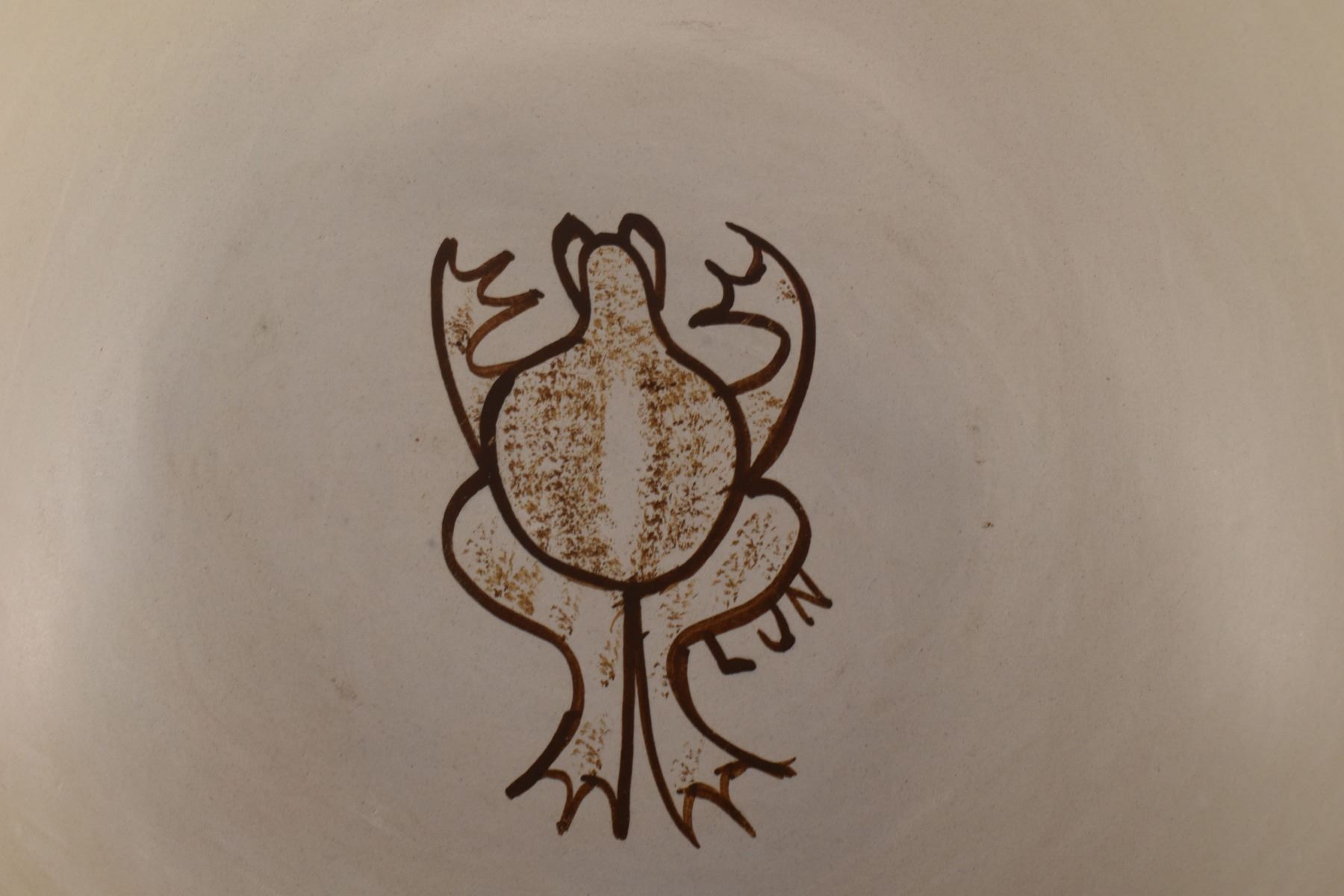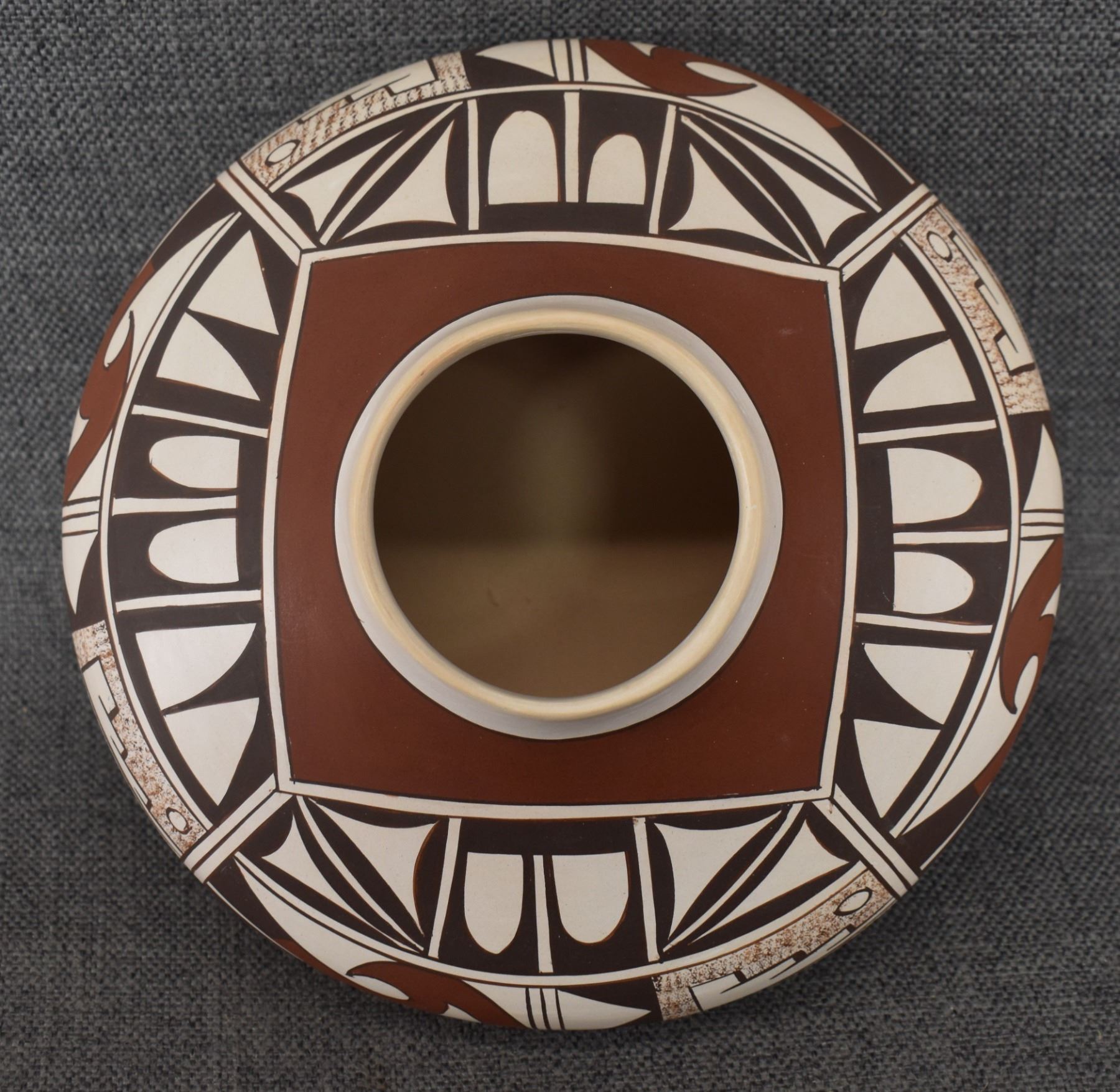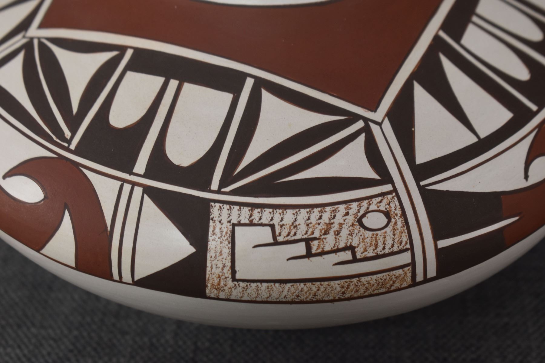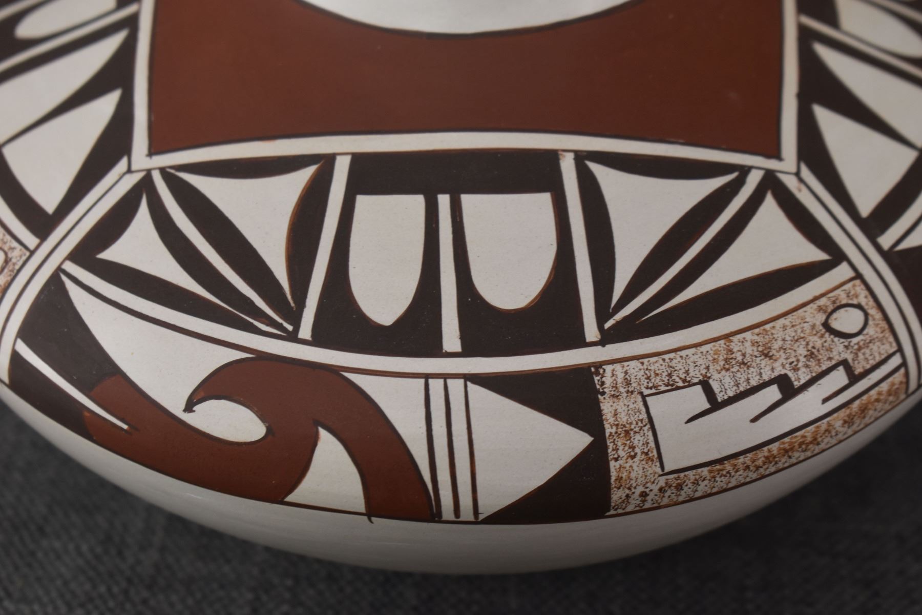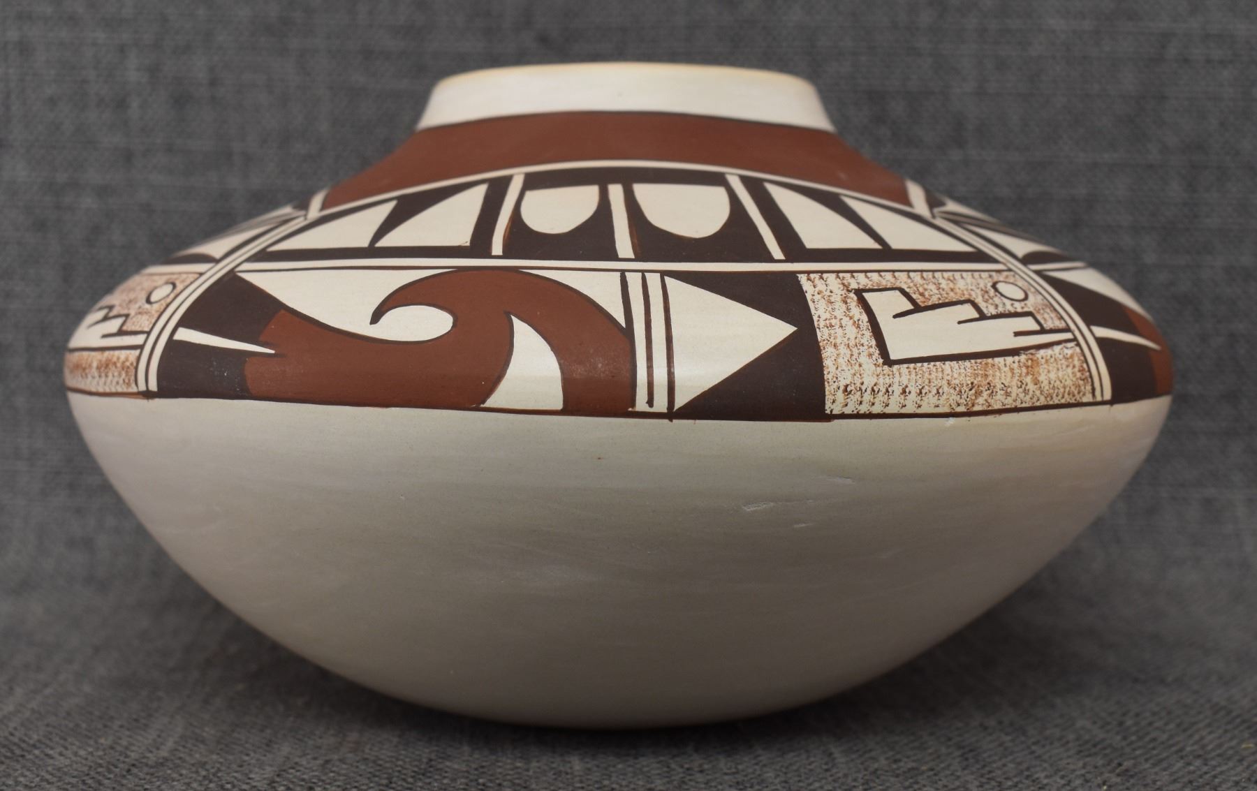 1970-80's Hopi hand coiled and polychrome painted design signed with frog logo for Joy Navasie. 5'' x 9''