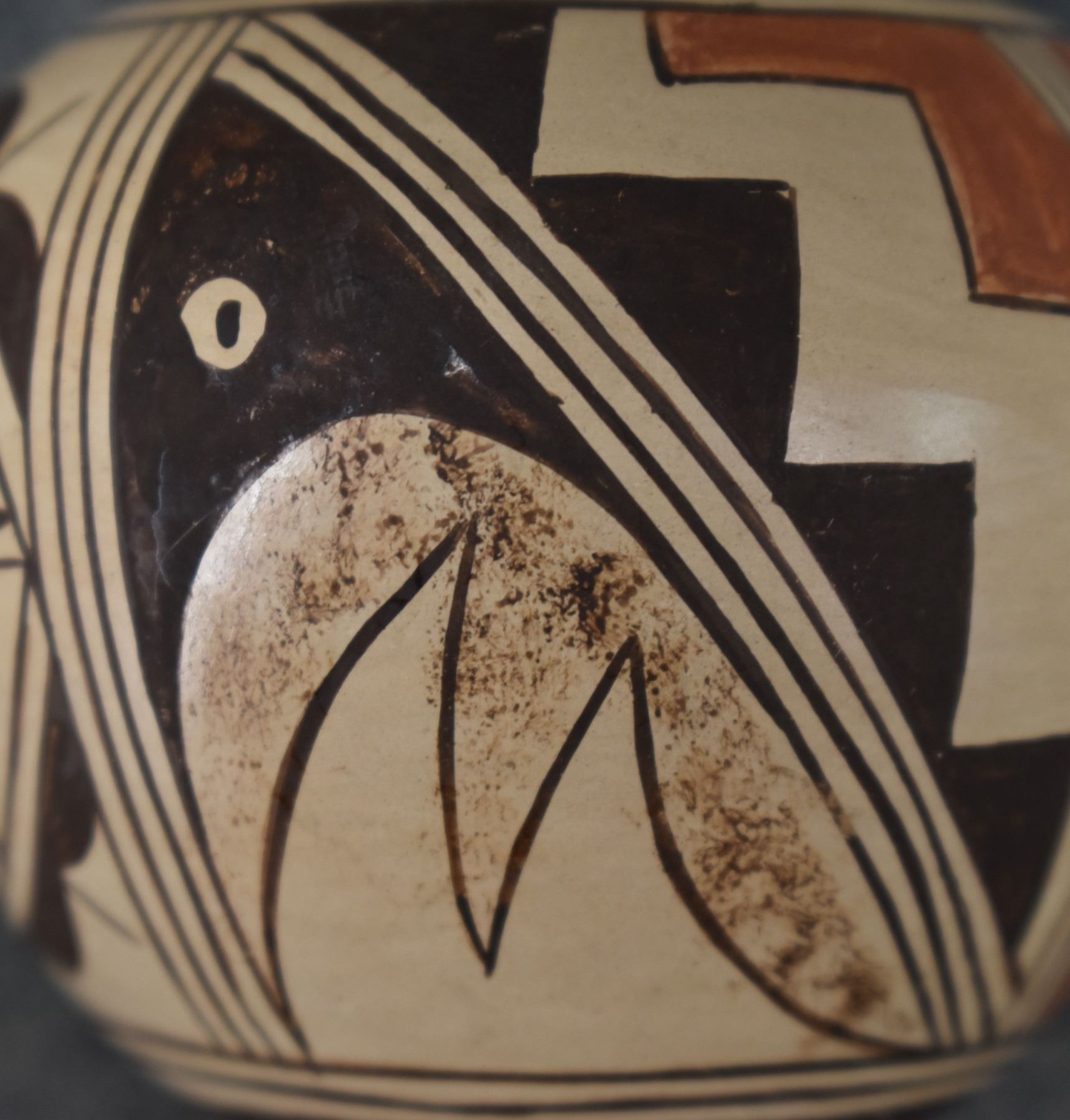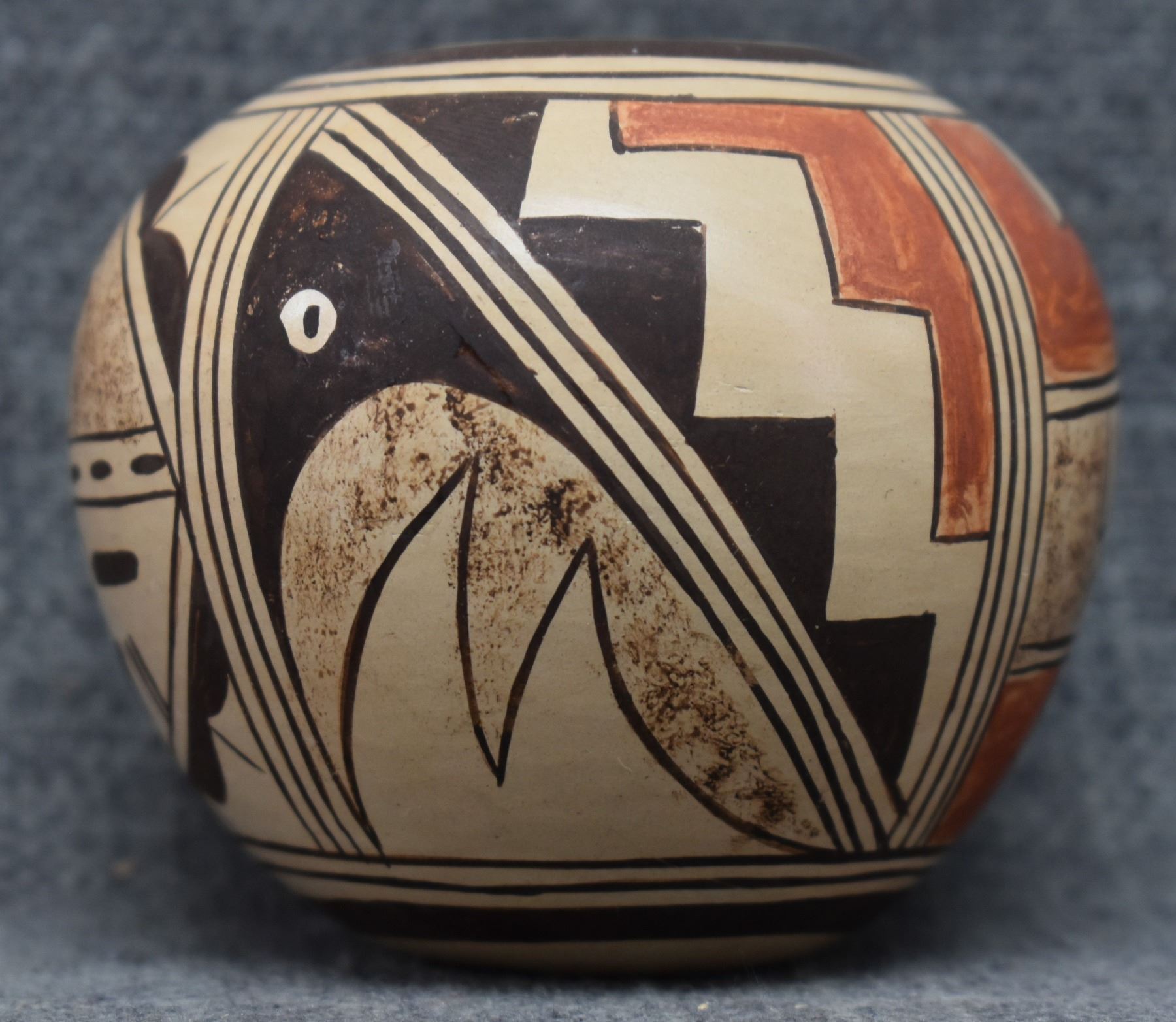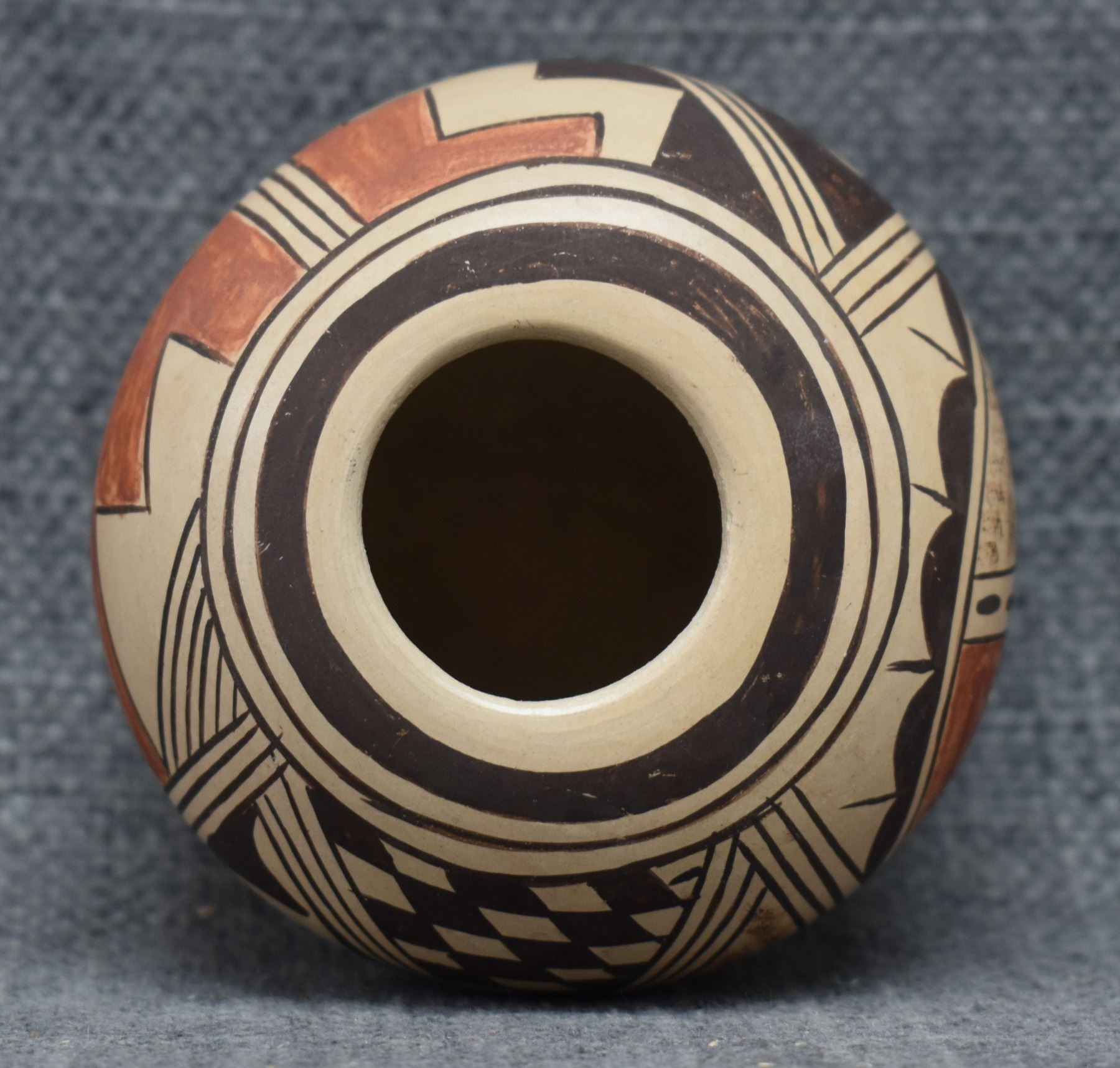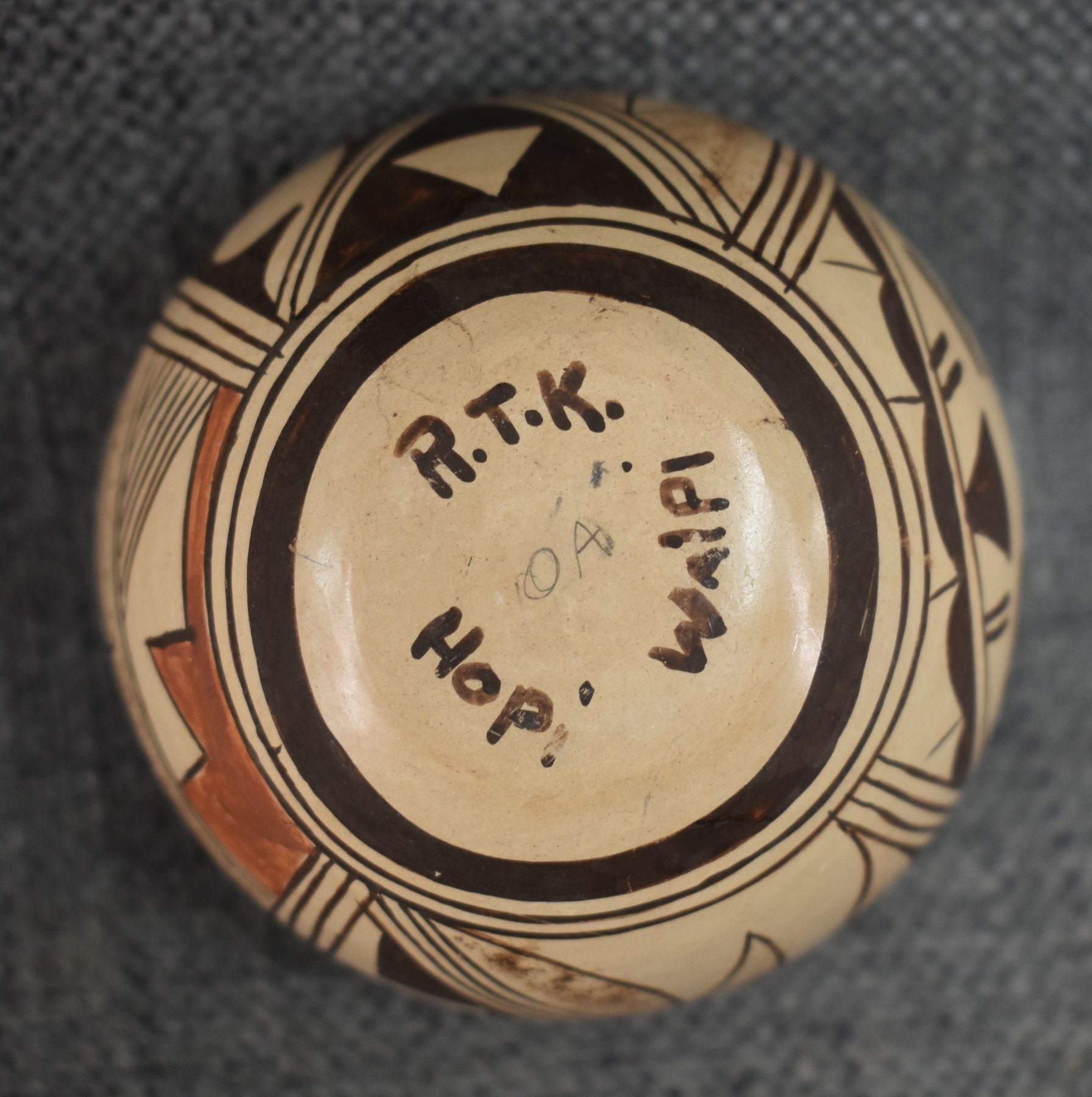 1990-2000's Hopi. hand coiled and polychrome painted design signed R.T.K. 2.5" x 3"