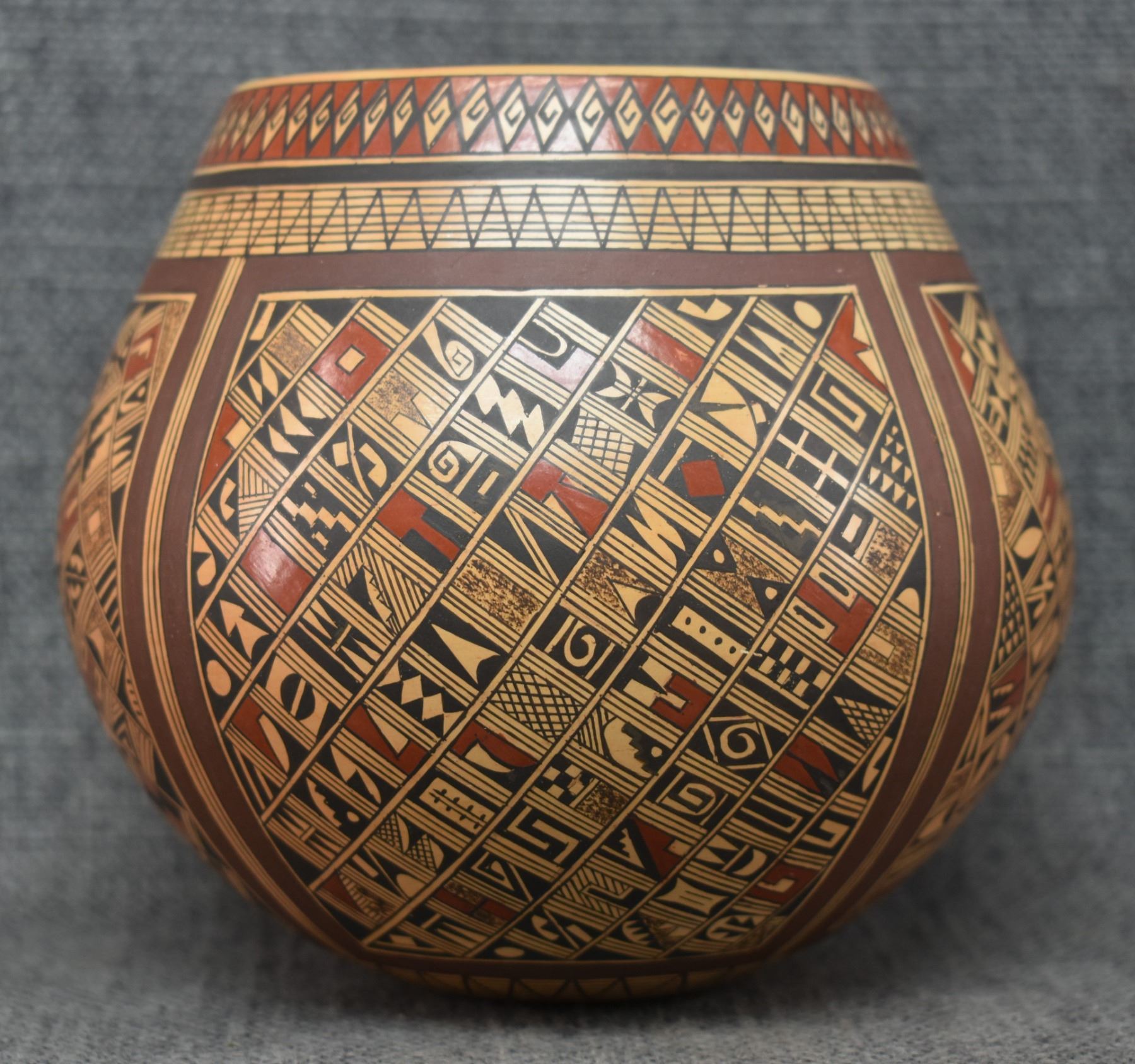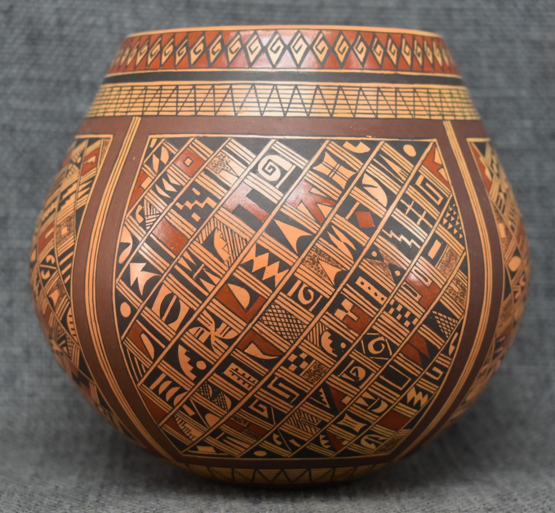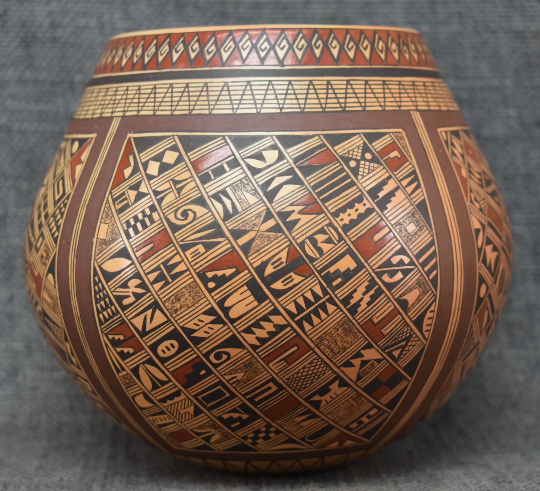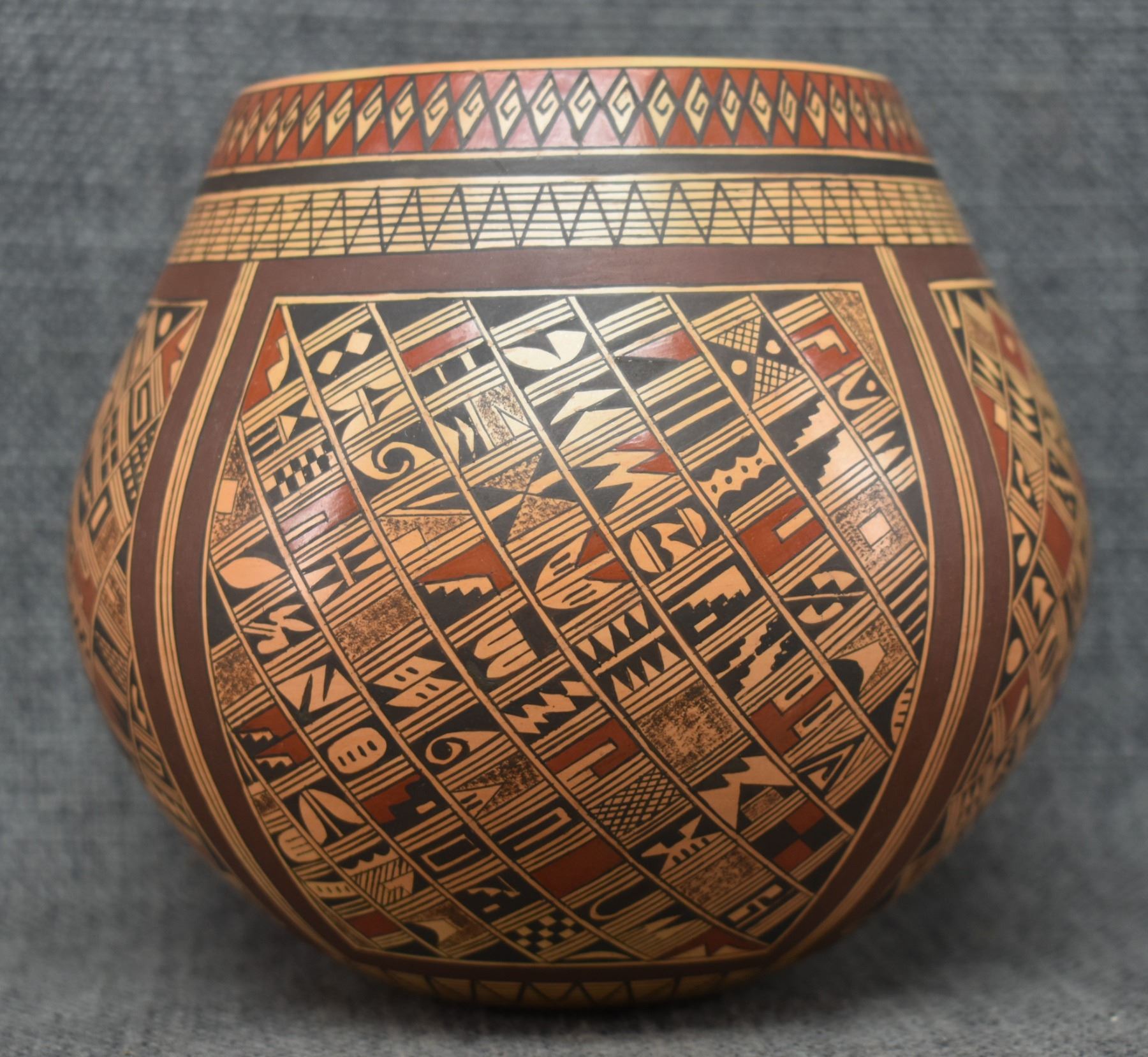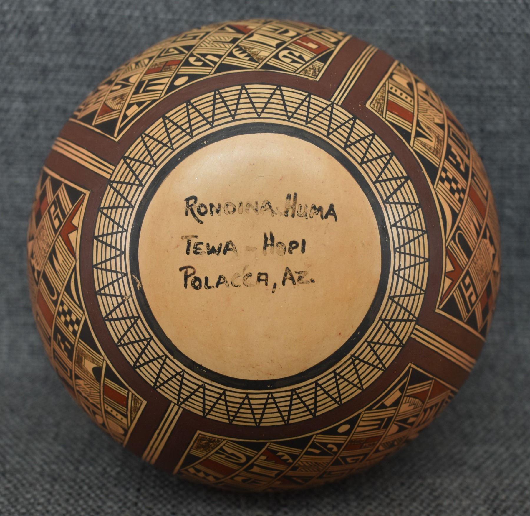 1980's Hopi. Hand coiled and painted busy polychrome design pottery jar, signed Rondina Huma. 5'' x 5''