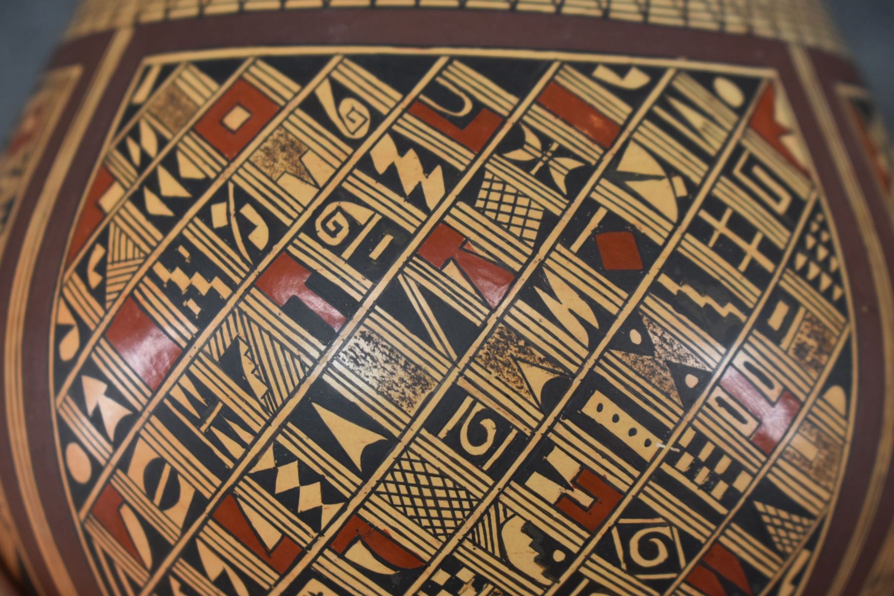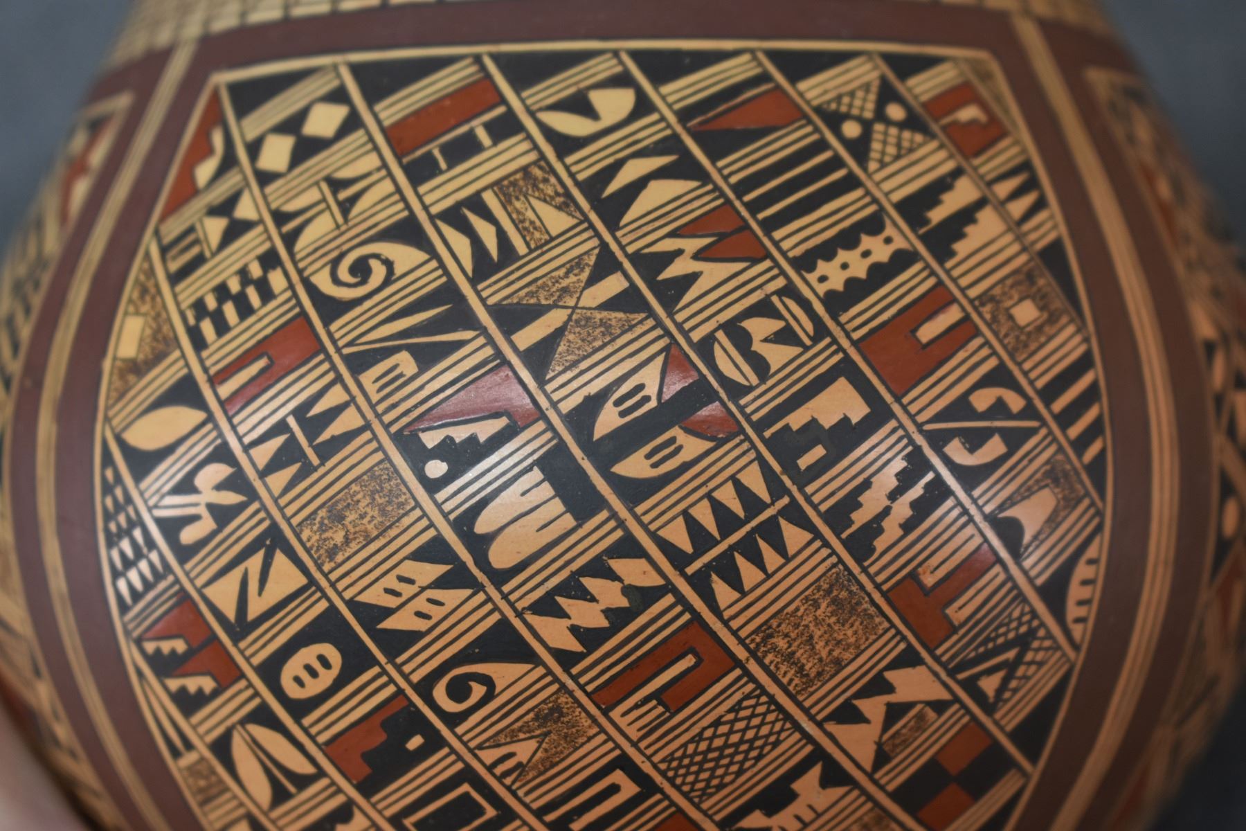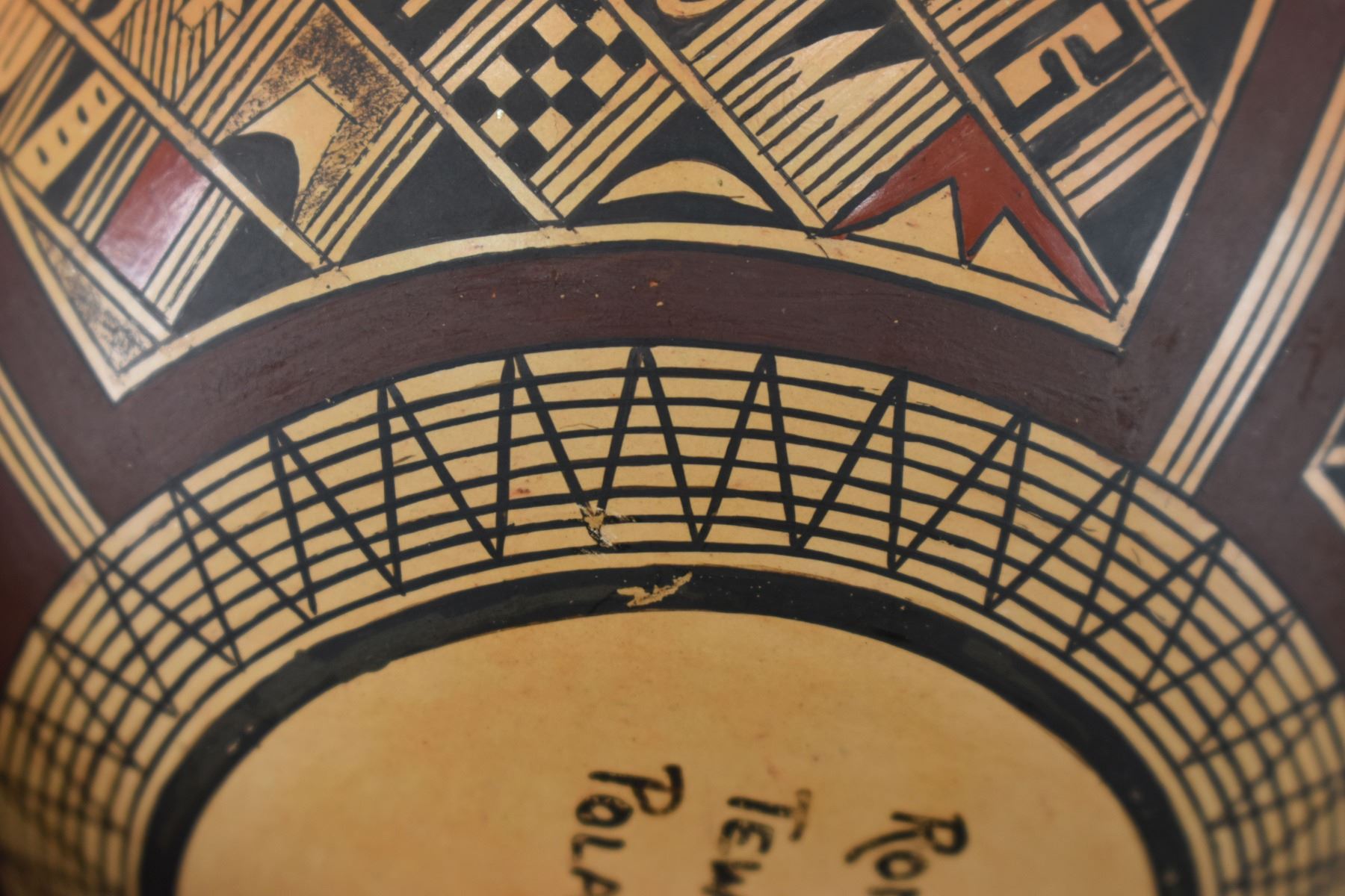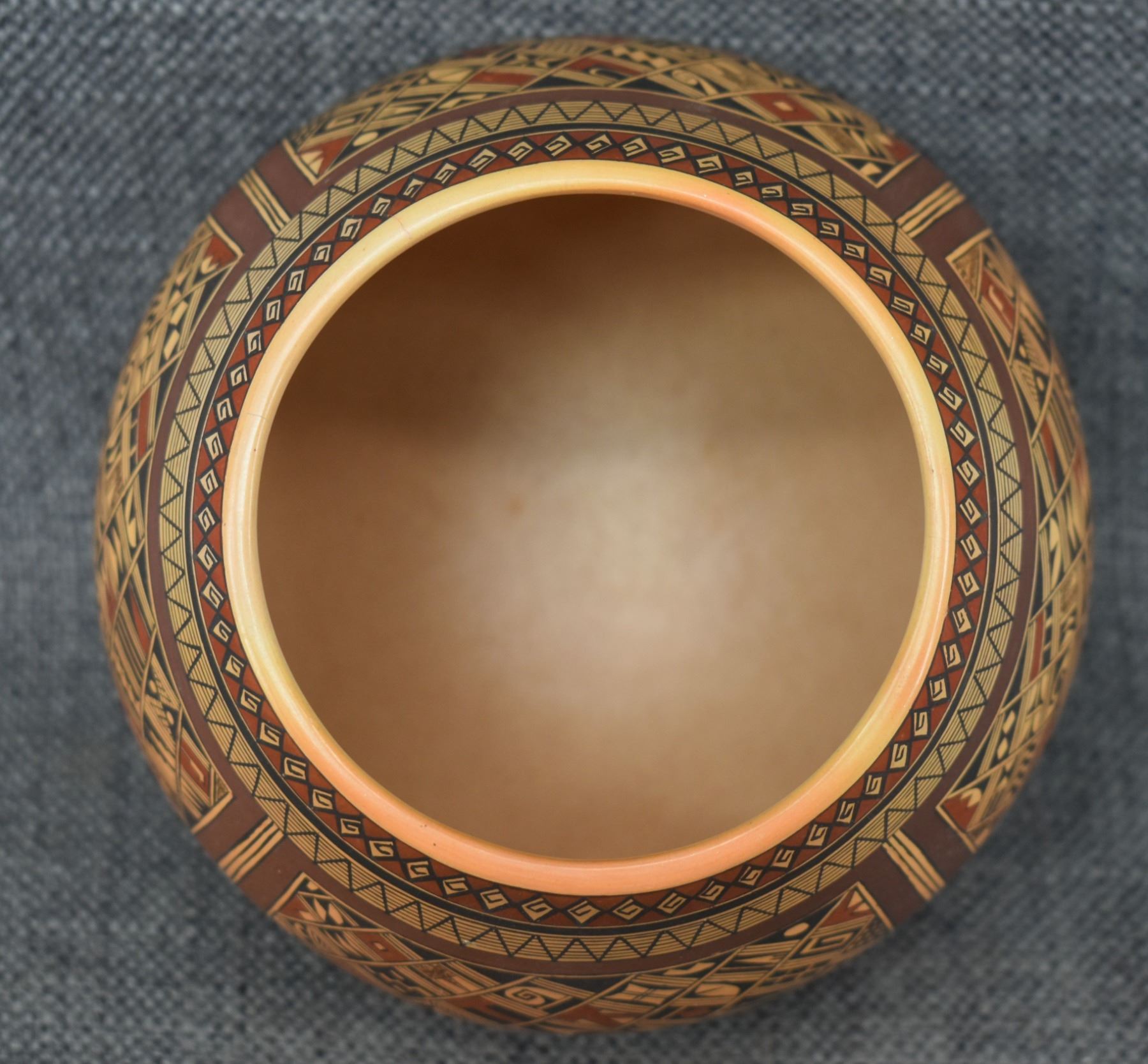 1980's Hopi. Hand coiled and painted busy polychrome design pottery jar, signed Rondina Huma. 5'' x 5''