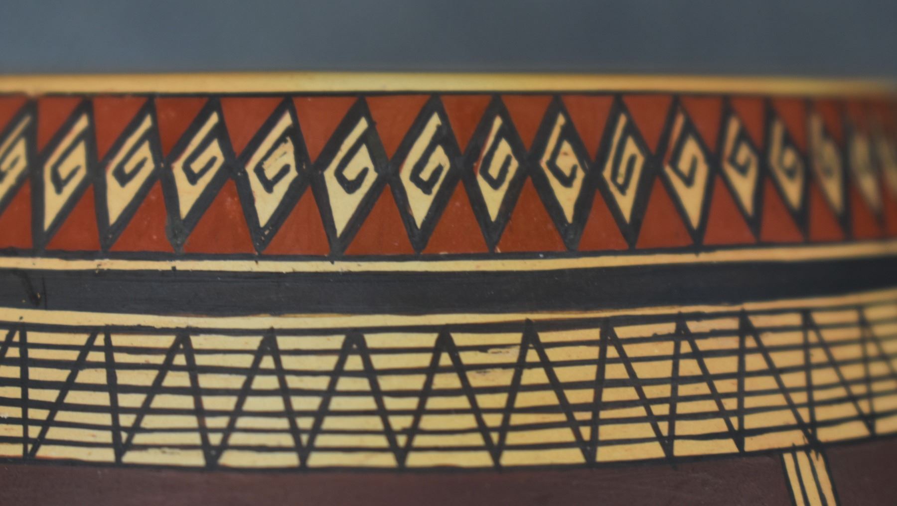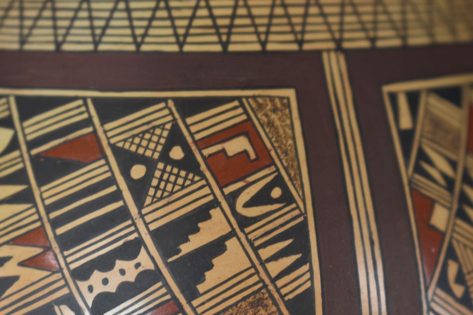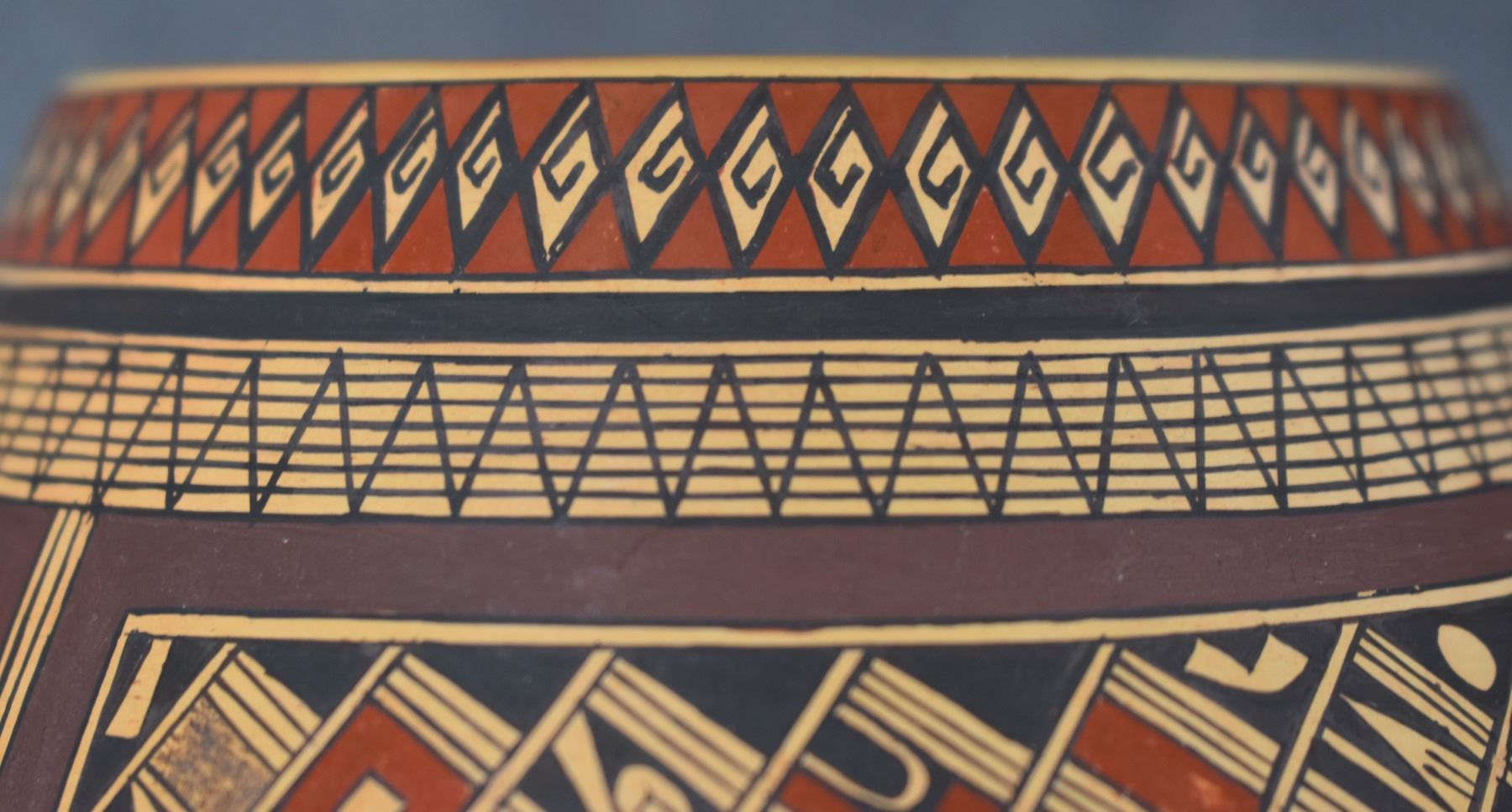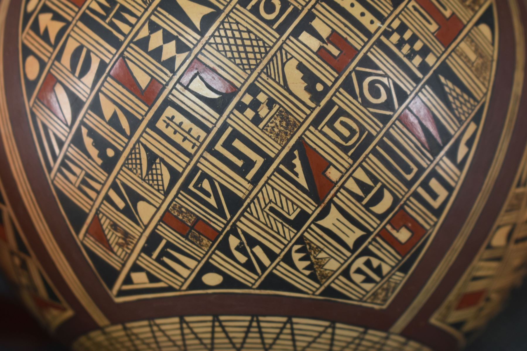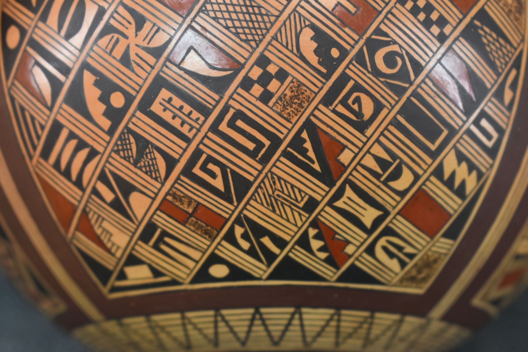 1980's Hopi. Hand coiled and painted busy polychrome design pottery jar, signed Rondina Huma. 5'' x 5''