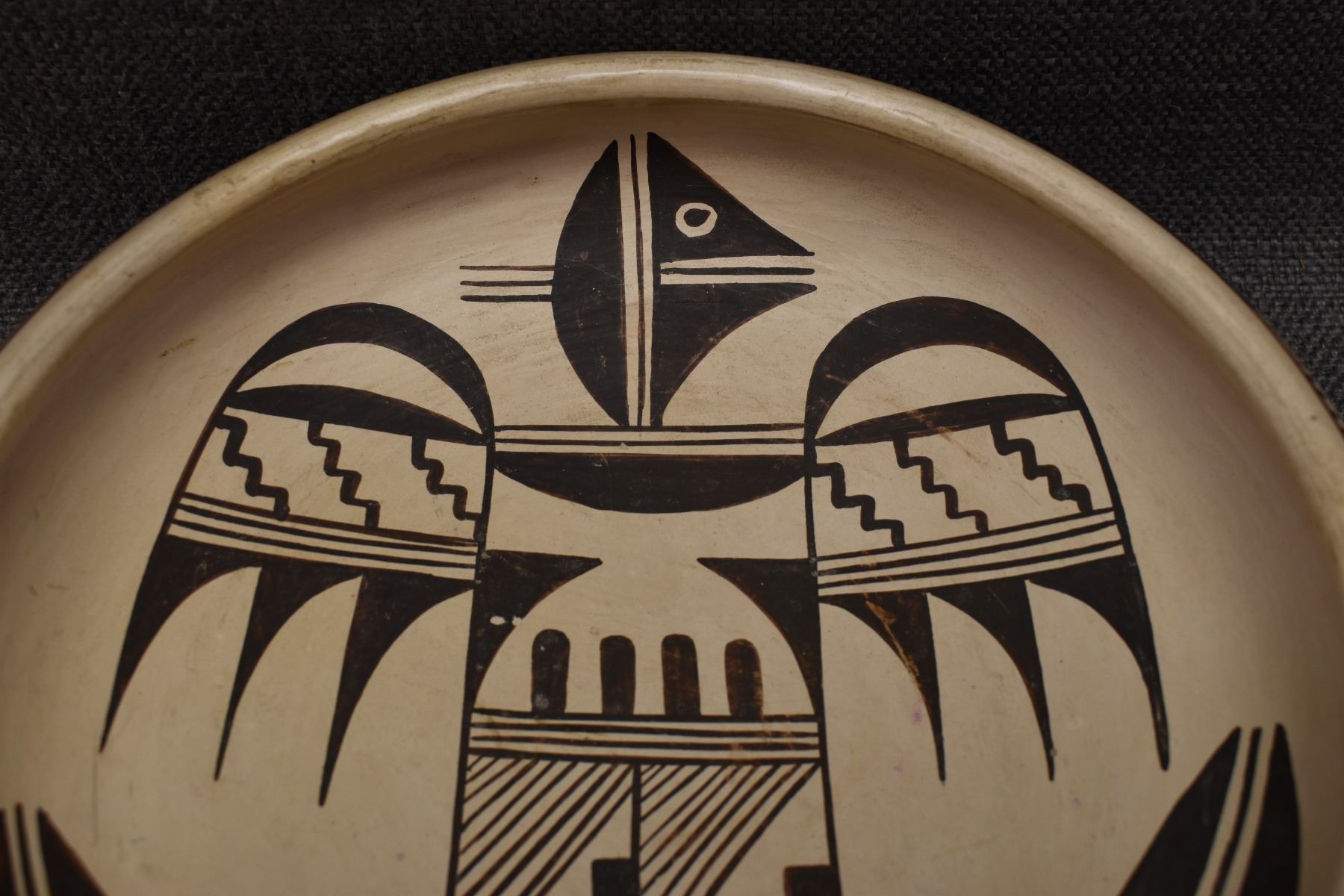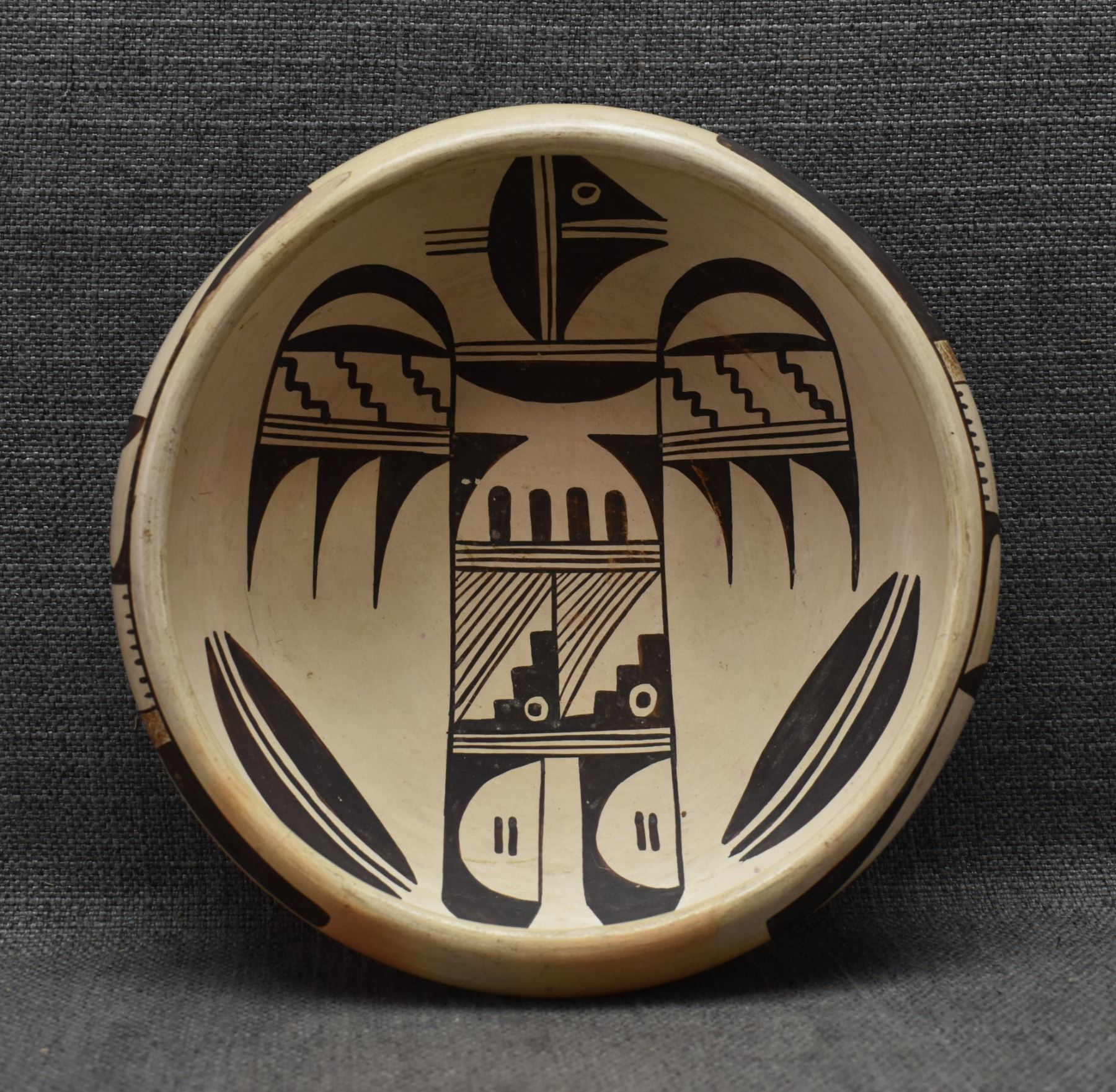 1940's Hopi . Hand coiled and painted thunder bird design pottery bowl, signed with hall mark for Sadie Adams.2.25'' x 9''