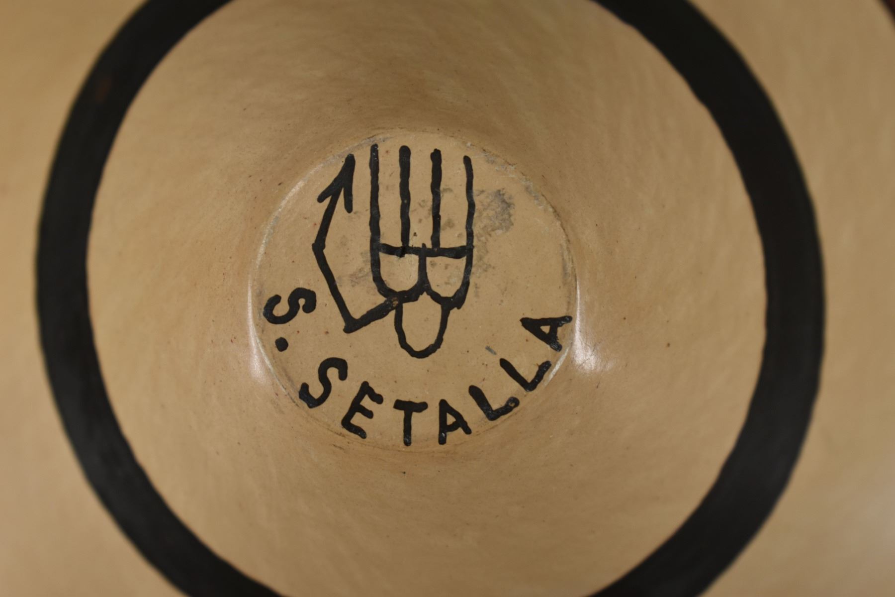1990's Hopi. hand coiled and polychrome painted design , signed S. Setalla with hallmark. 6'' x 9''