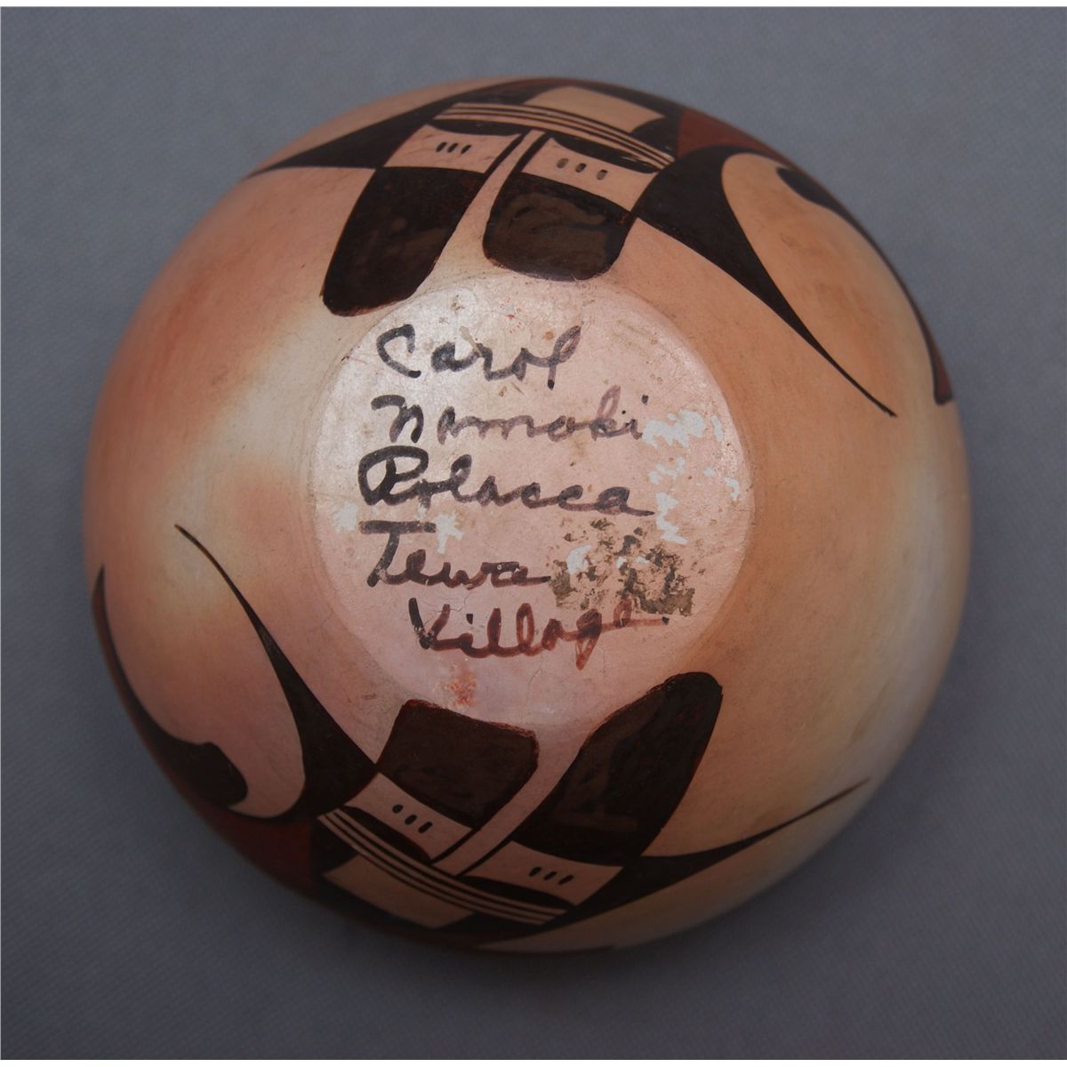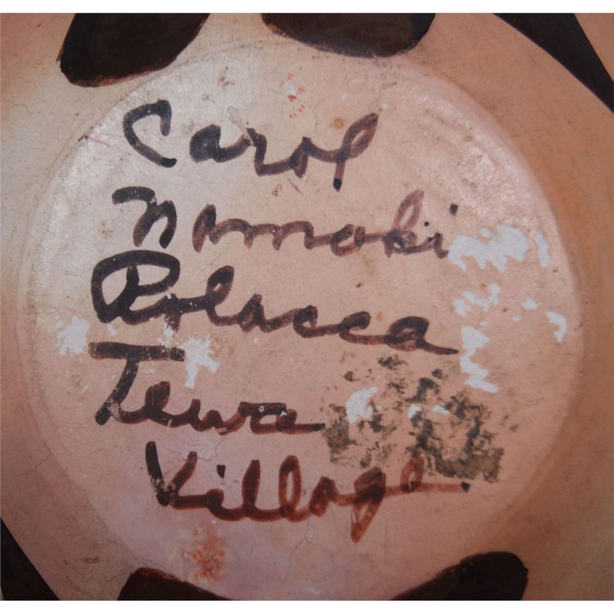 1960s 70s polychrome stylized bird has chips and cracks with minor paint loss and repaint signed Carl Namoki, 4" 4.75"