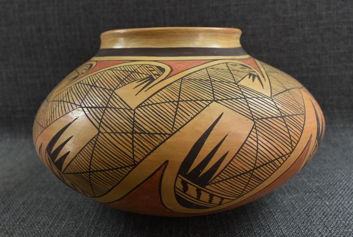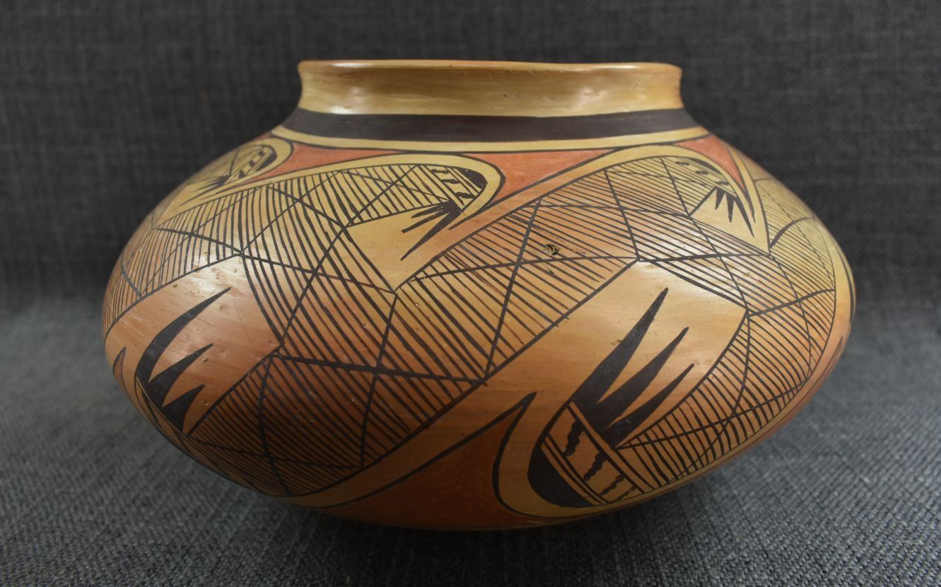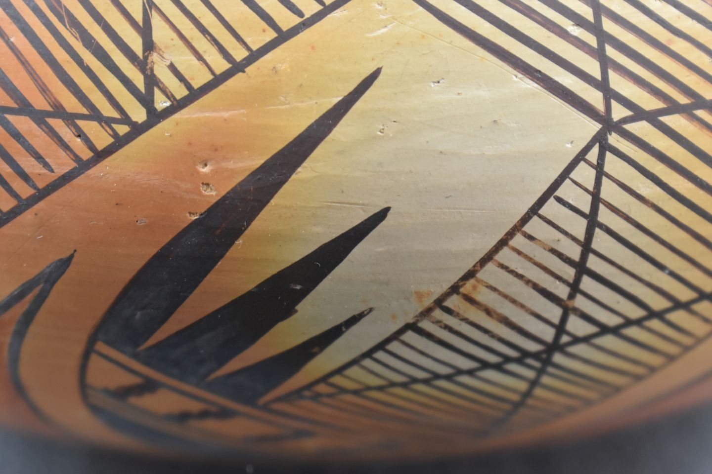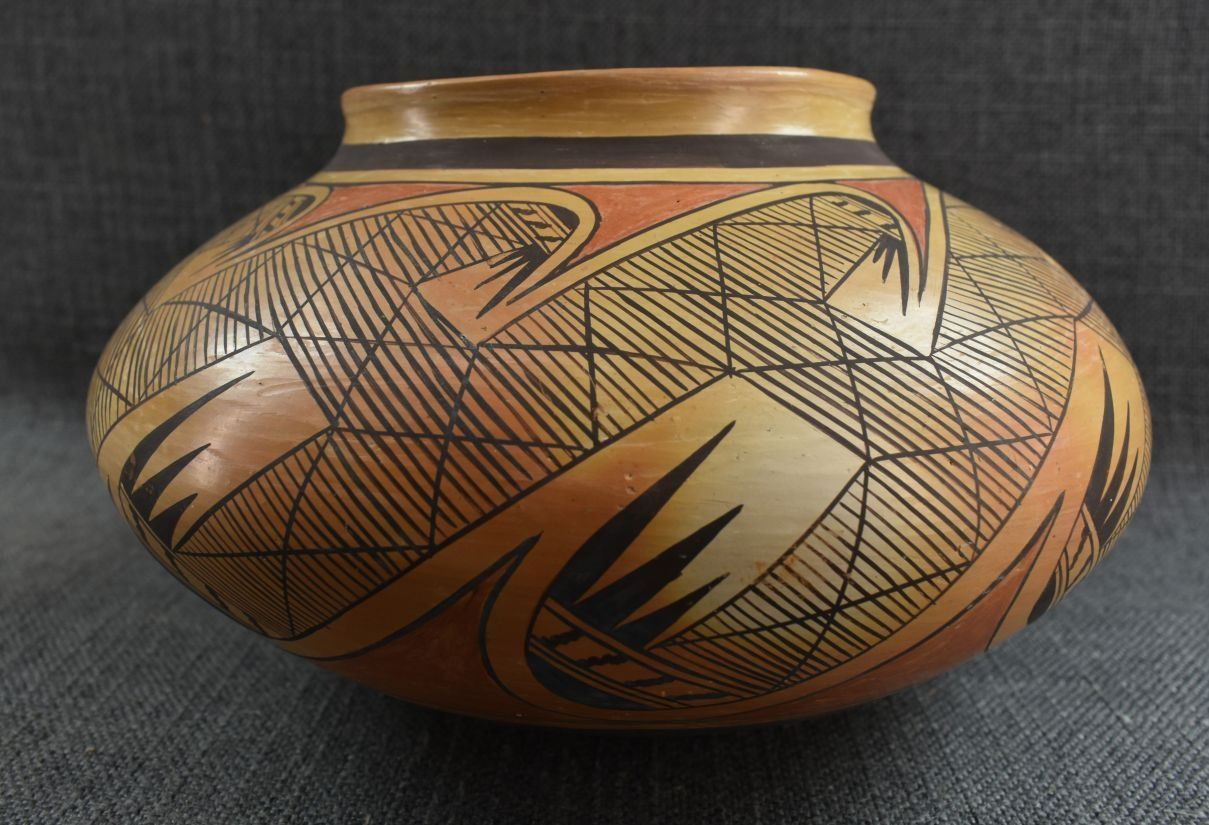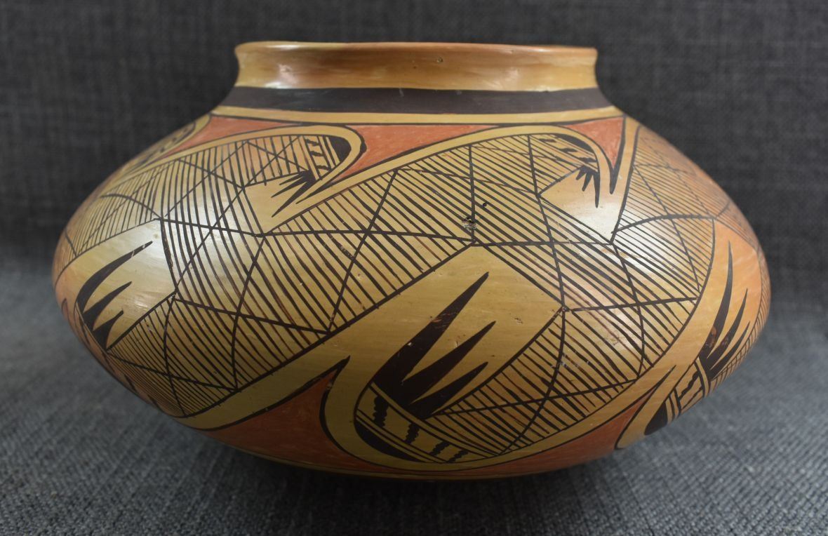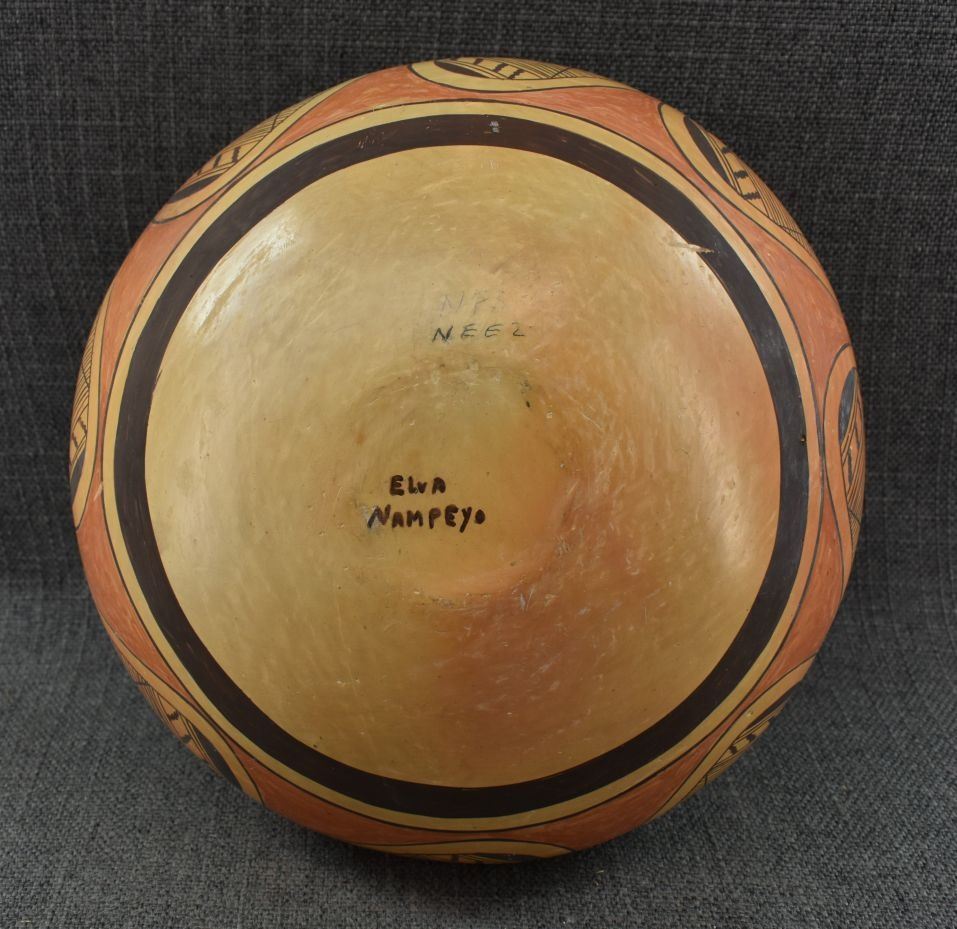 1970's Hopi. hand coiled and painted polychrome migration design, signed Elva Nampeyo. 6'' x 10''