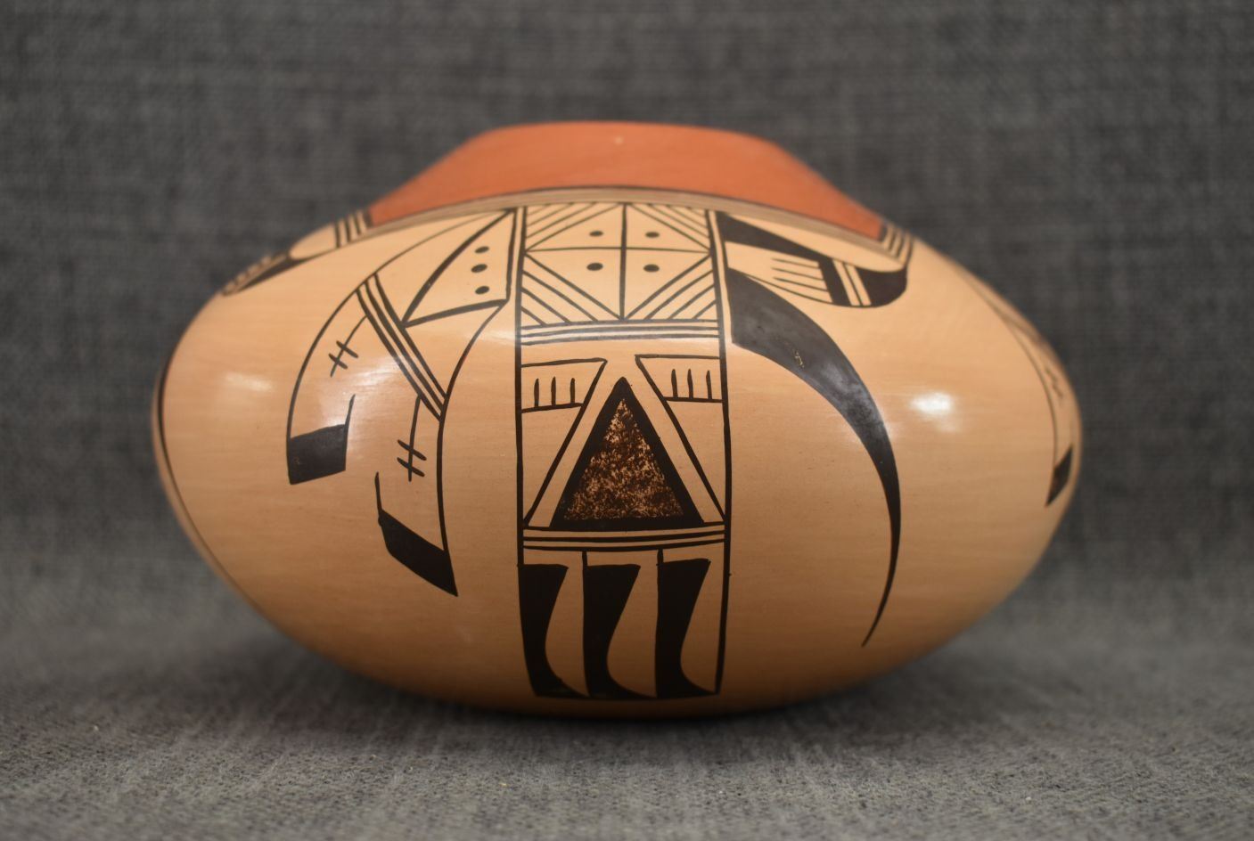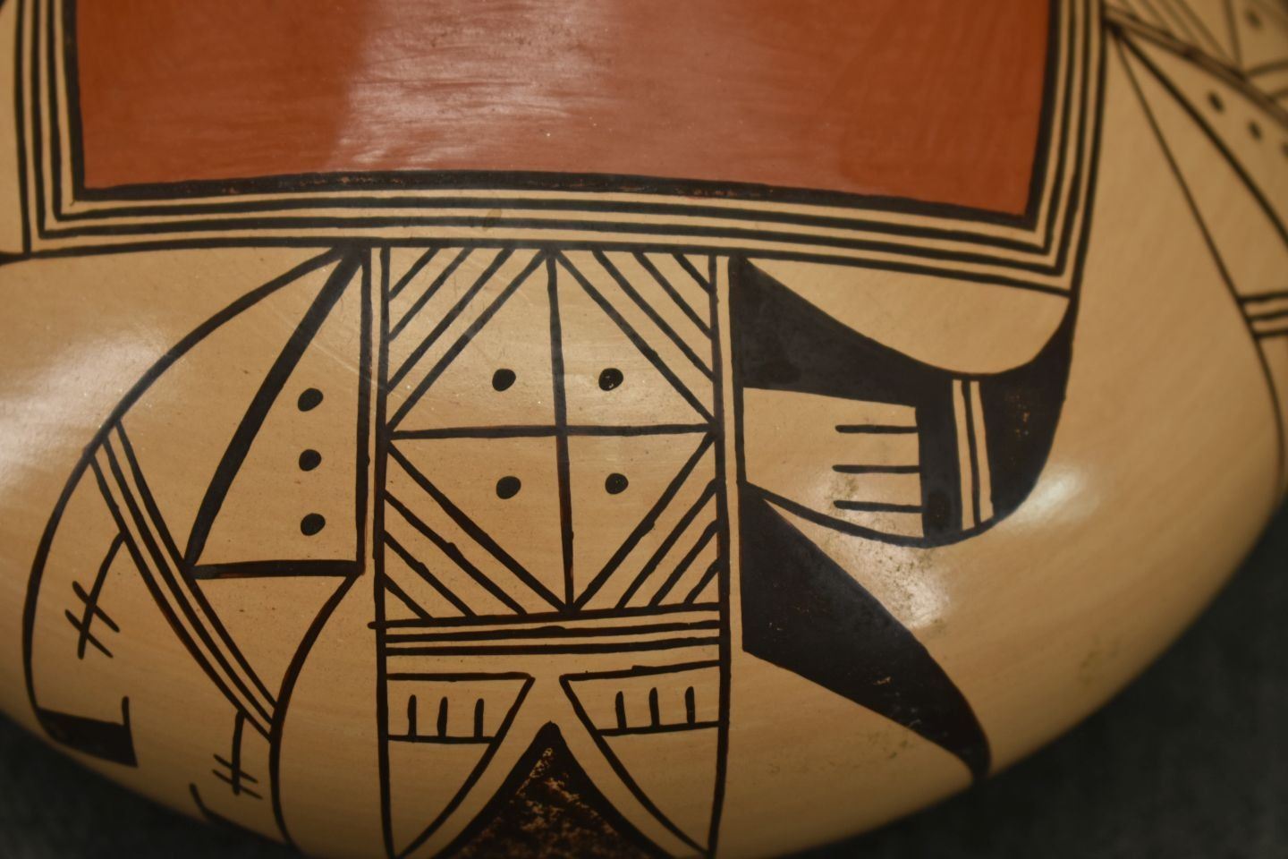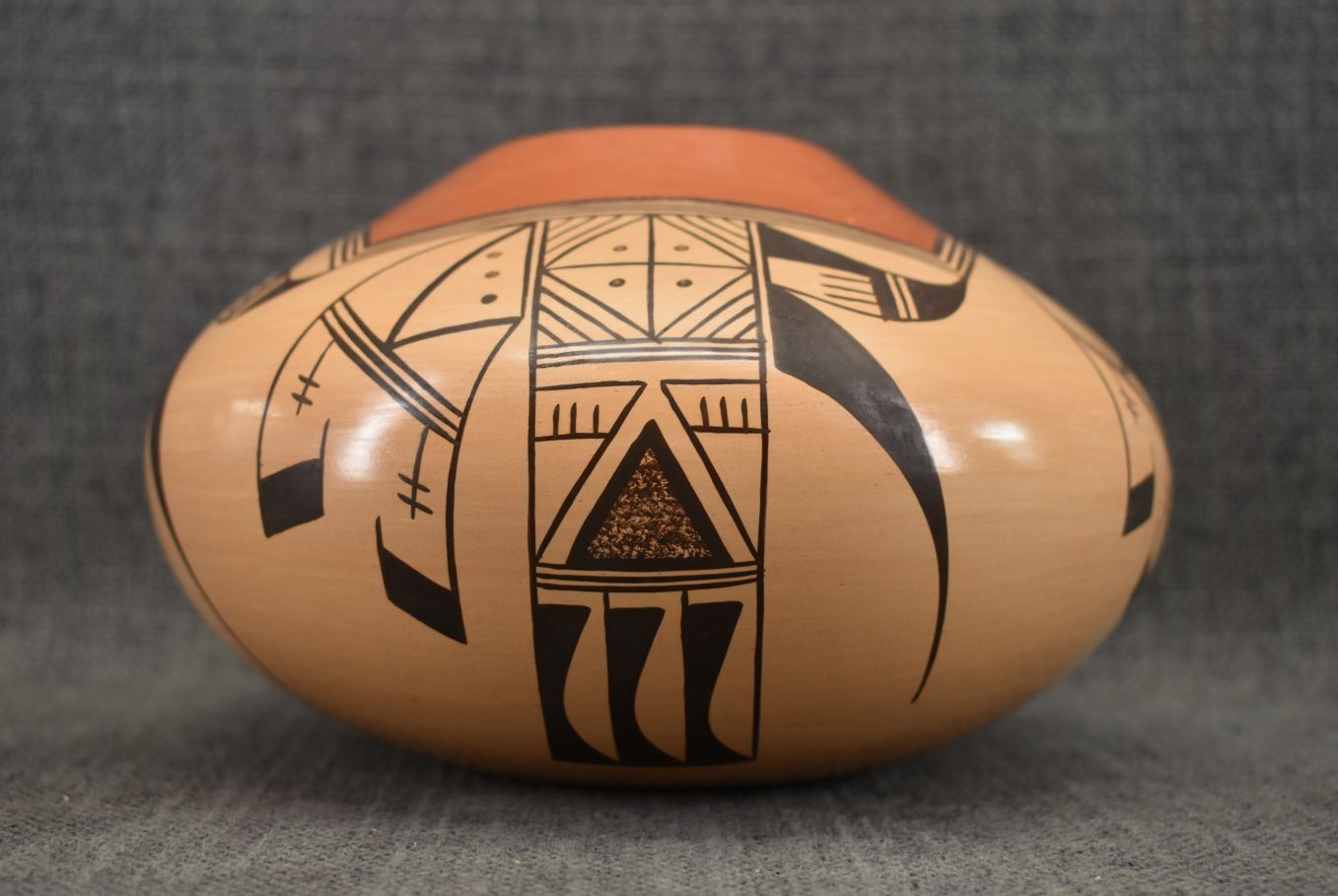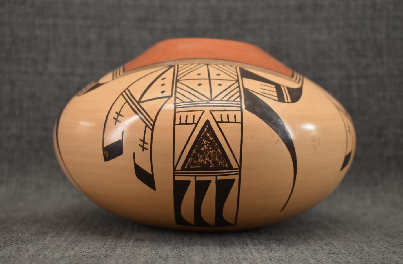 1980-90's Hopi, hand coiled with polychrome painted stylized parrot design signed Fannie L Polacca 4.25" x 7"