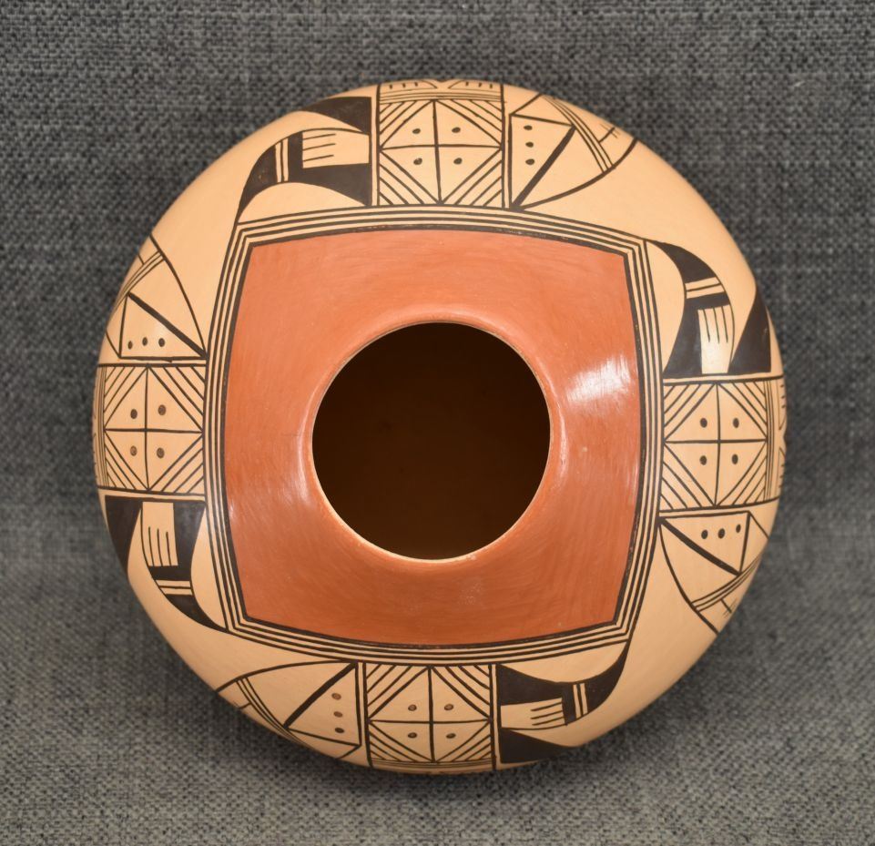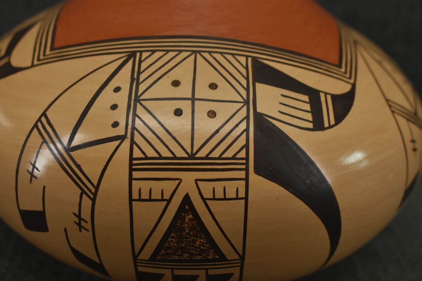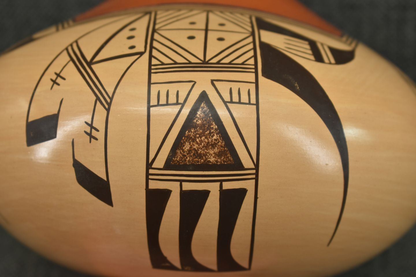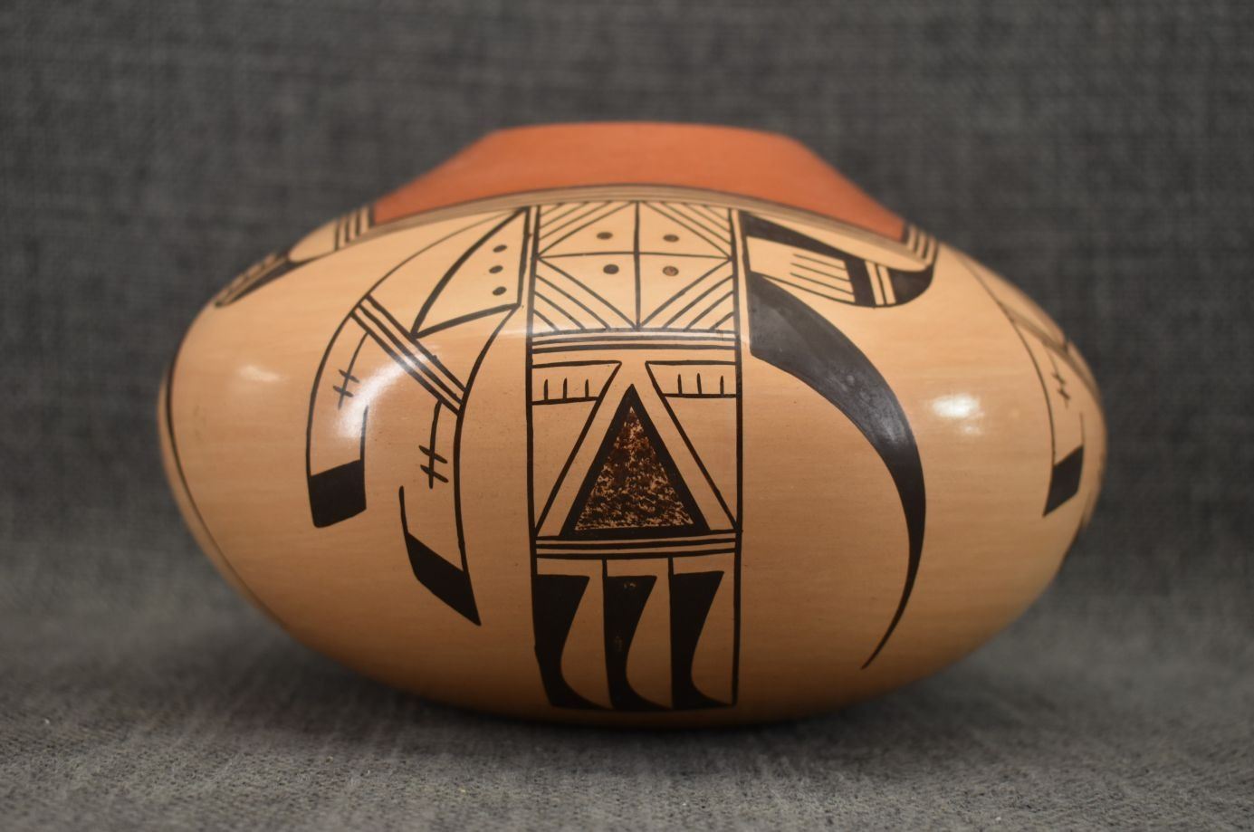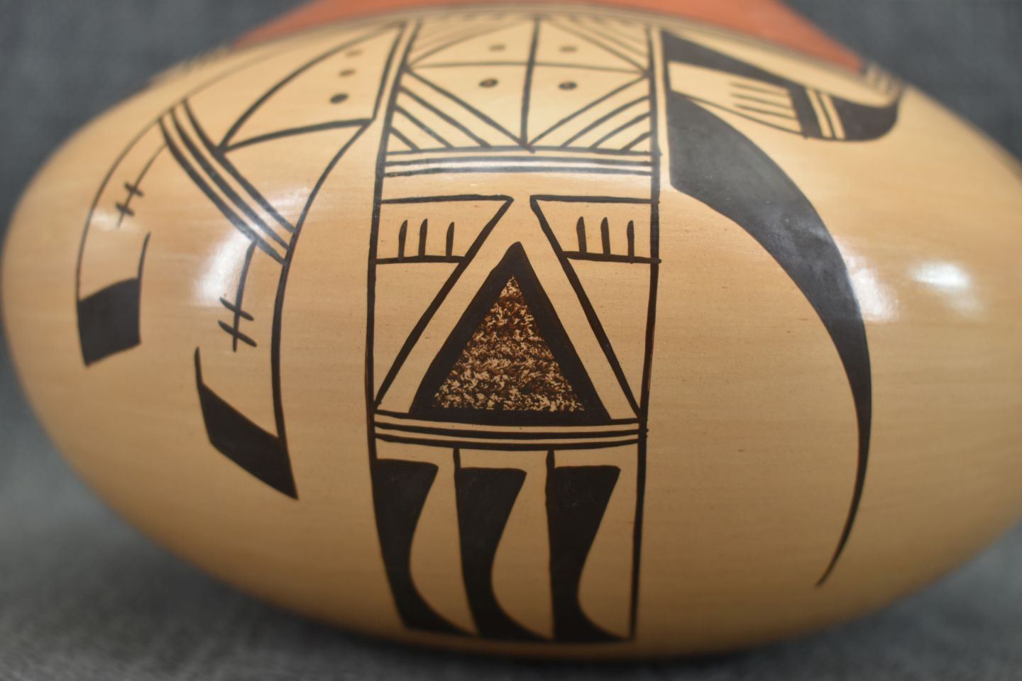 1980-90's Hopi, hand coiled with polychrome painted stylized parrot design signed Fannie L Polacca 4.25" x 7"