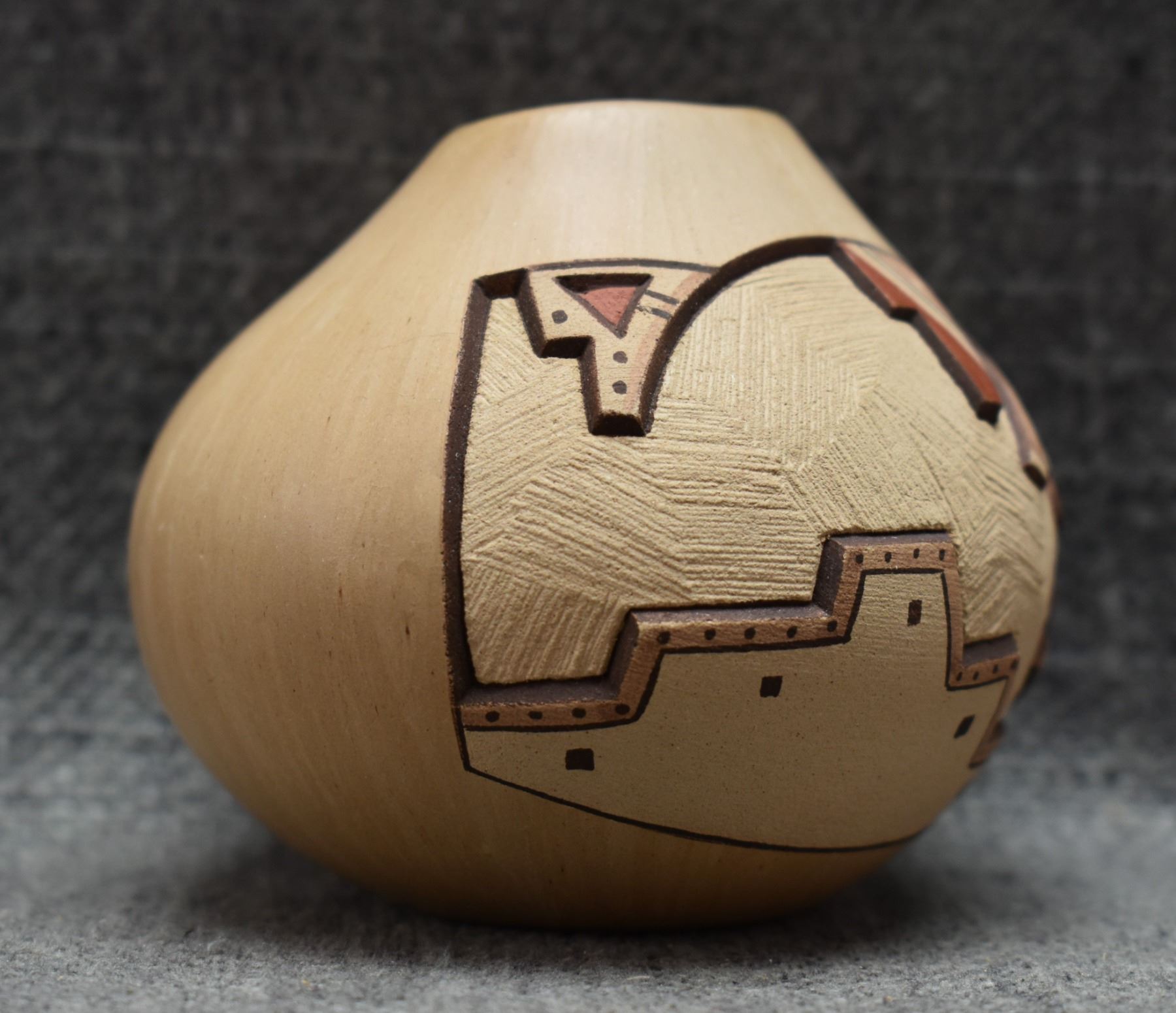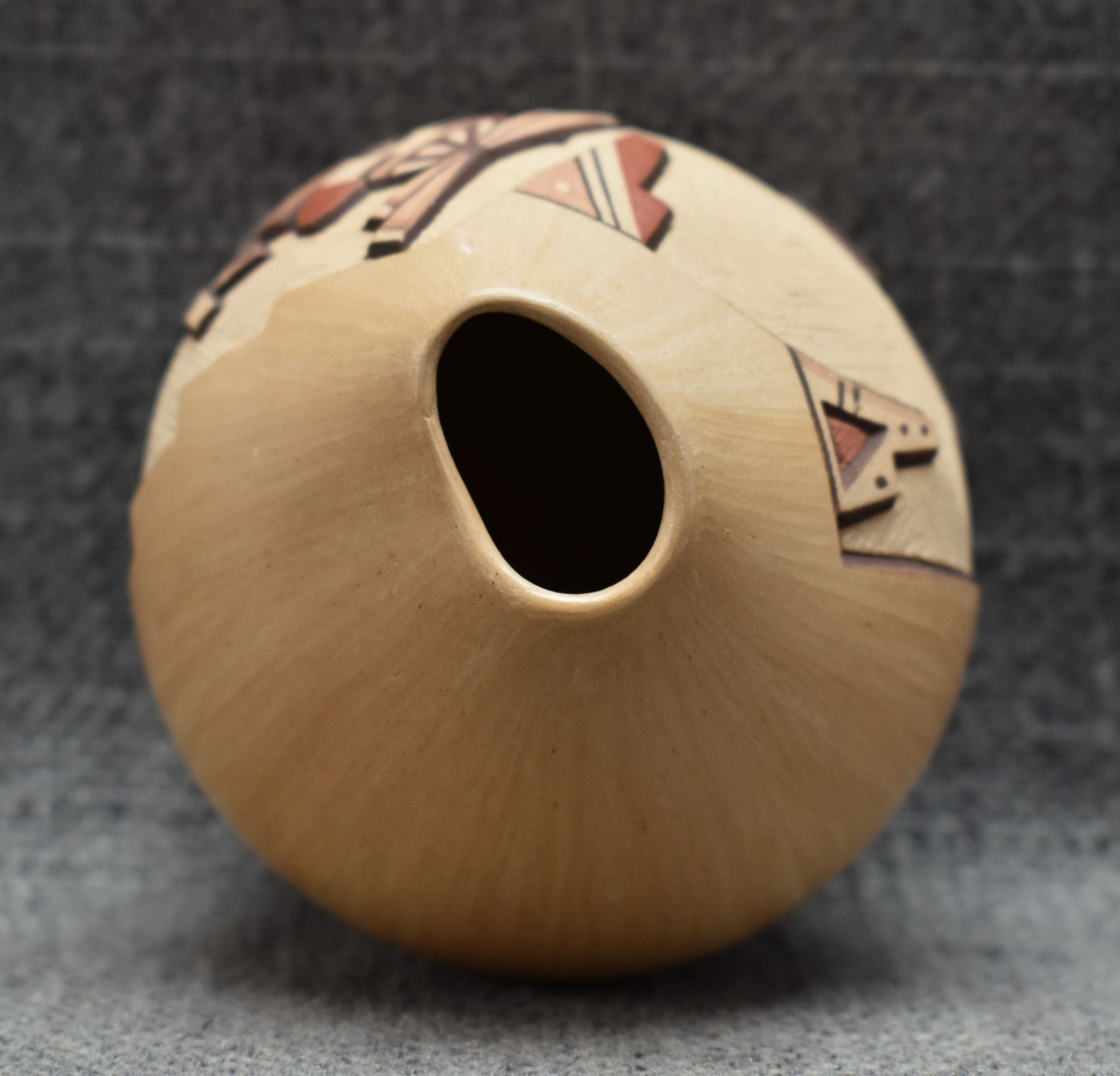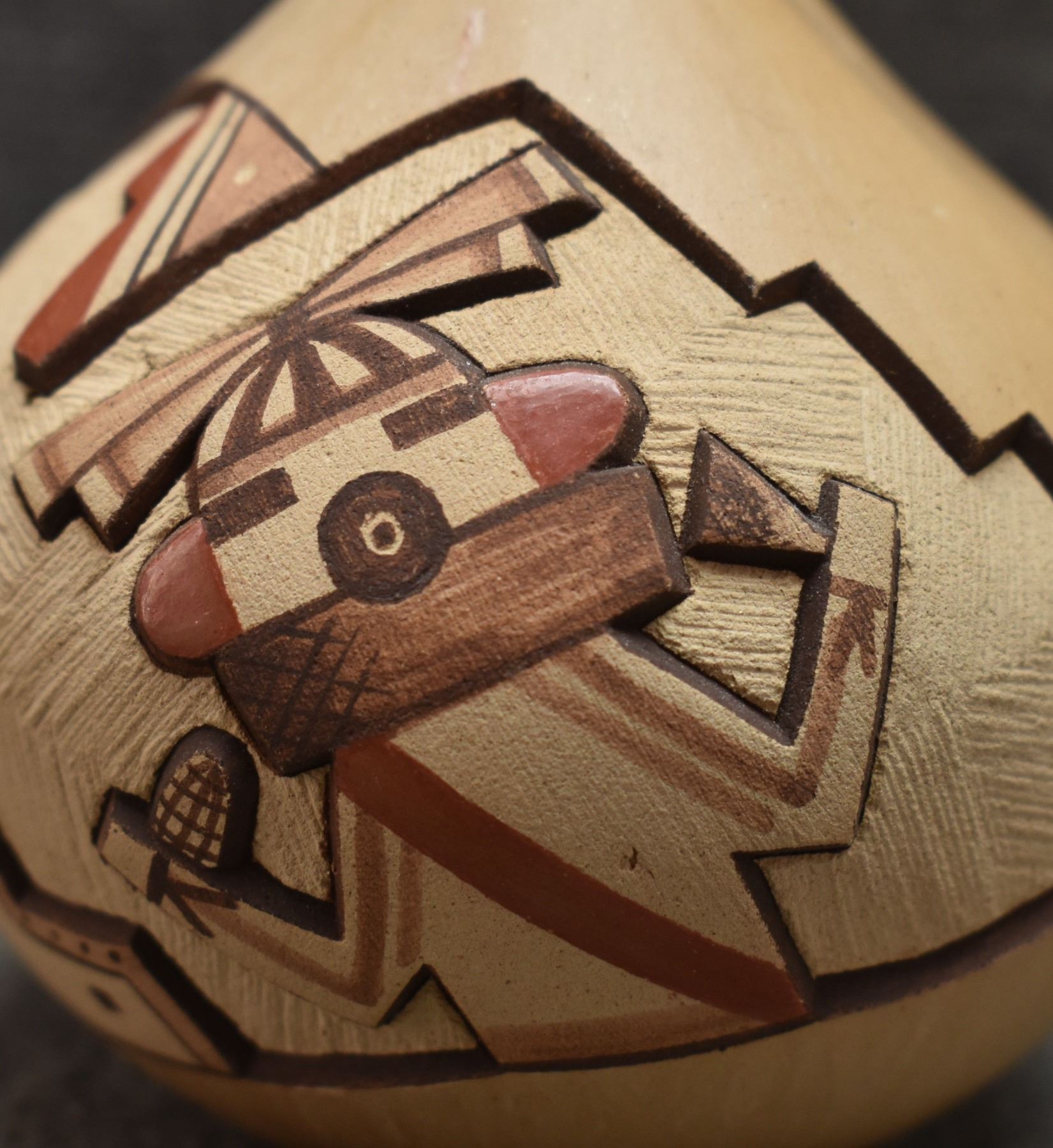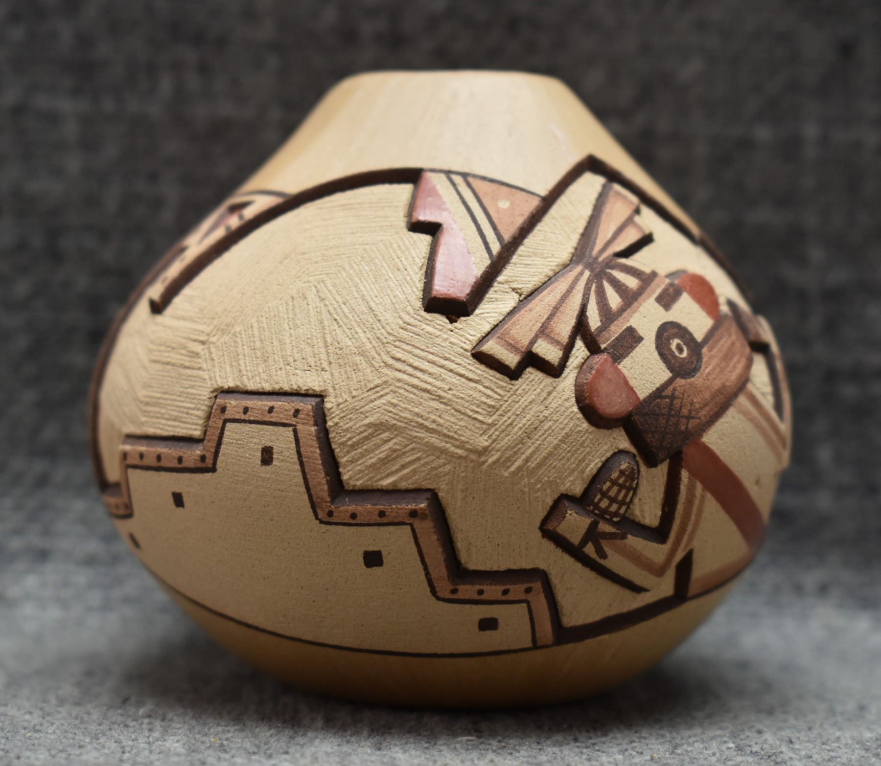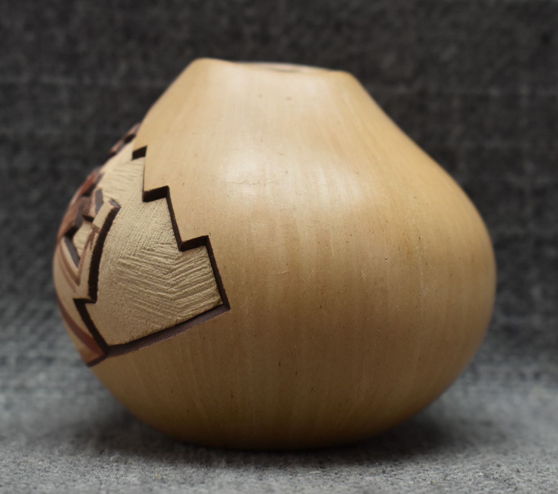 1990-2000's Hopi, hand coiled with carved and painted pueblo and kachina design signed Loren H Nampeyo 2.5" x 2.75"