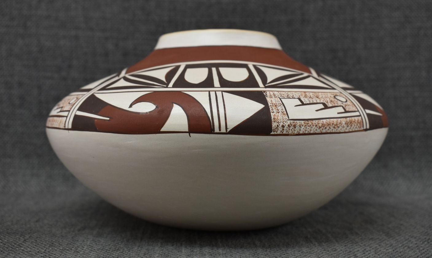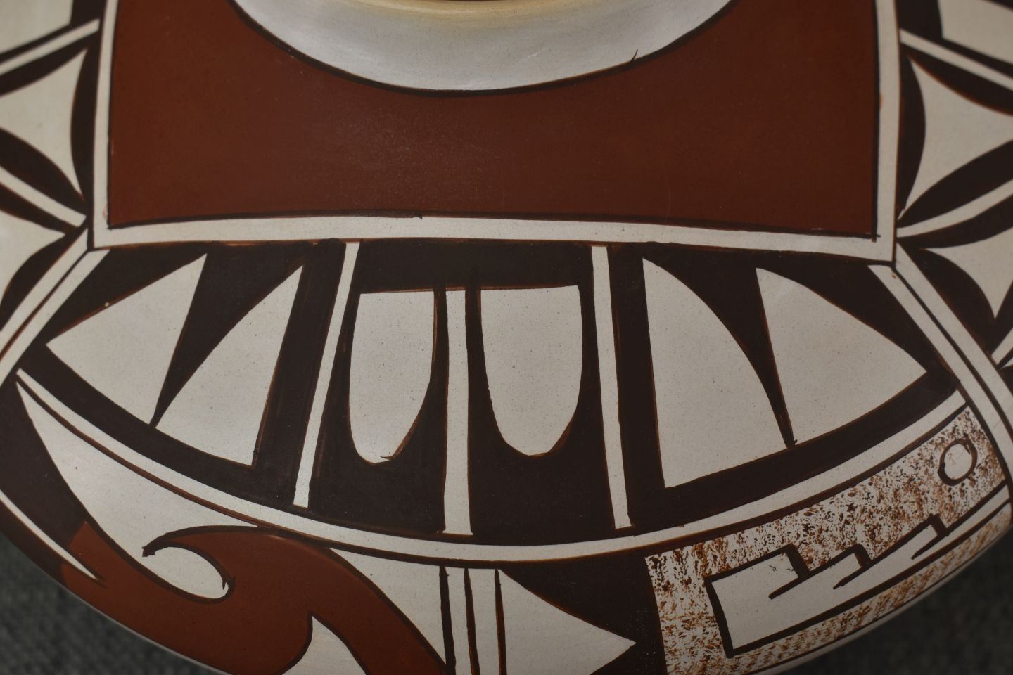 1970-80's Hopi hand coiled and polychrome painted design signed with frog logo and initials LJN for Loretta Joy Navasie. 5'' x 9''