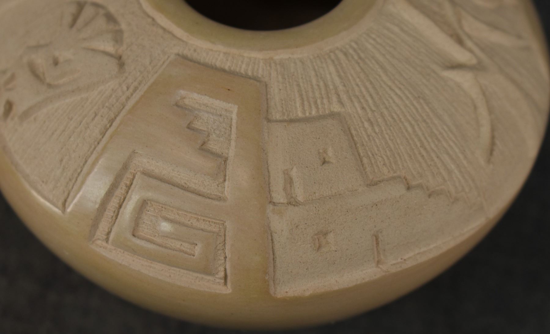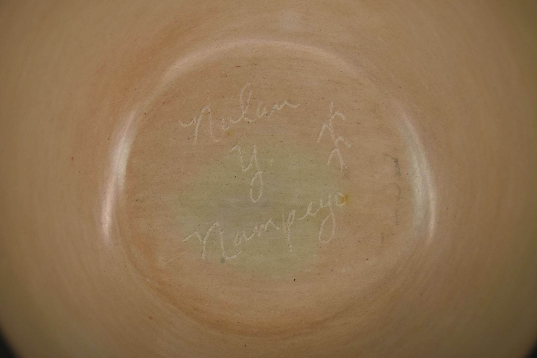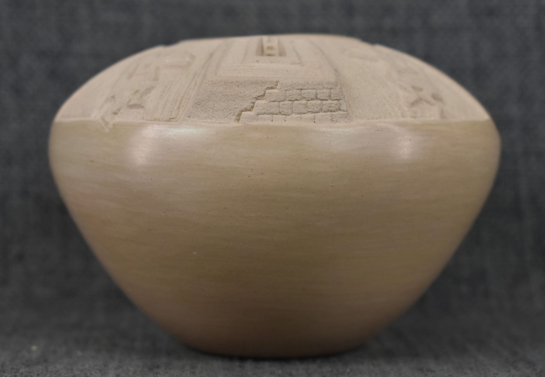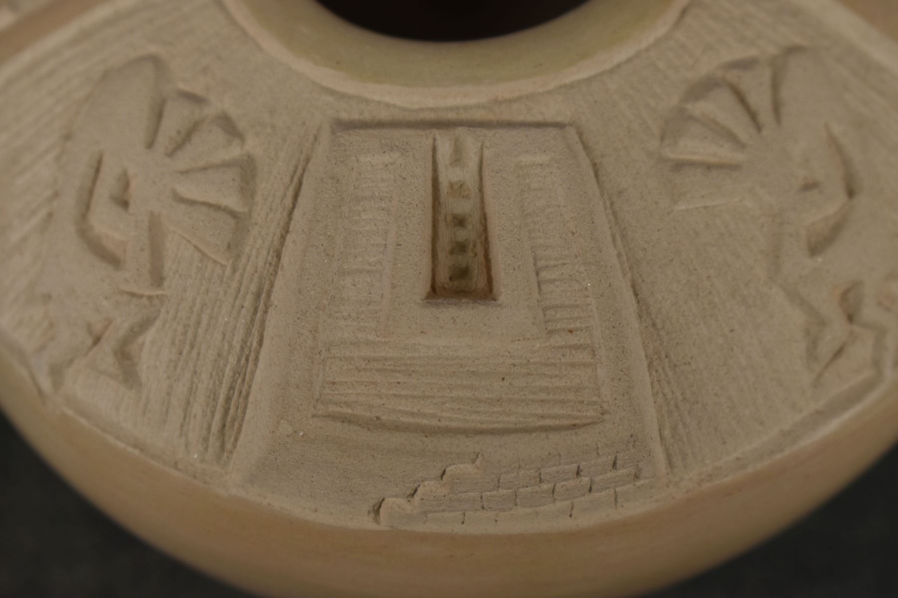 2000's Hopi, hand coiled with carved kachina and kiva scene signed Nolan Y Nampeyo with corn stalk logo. 3" x 4.5"