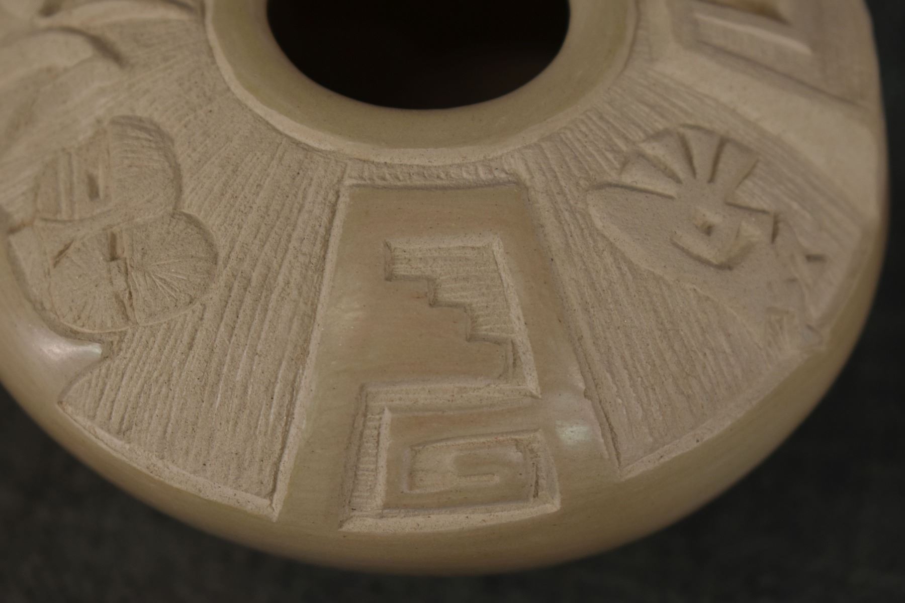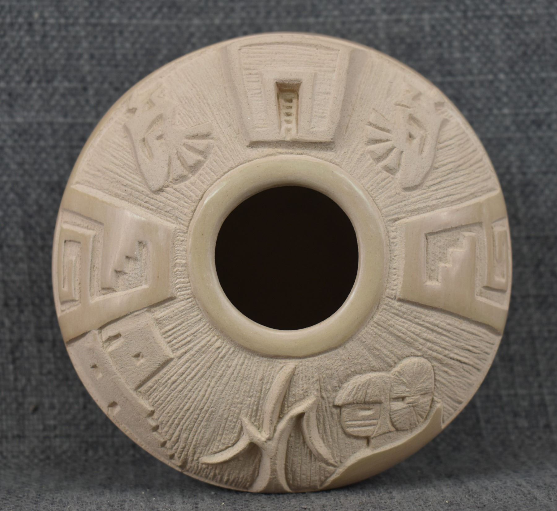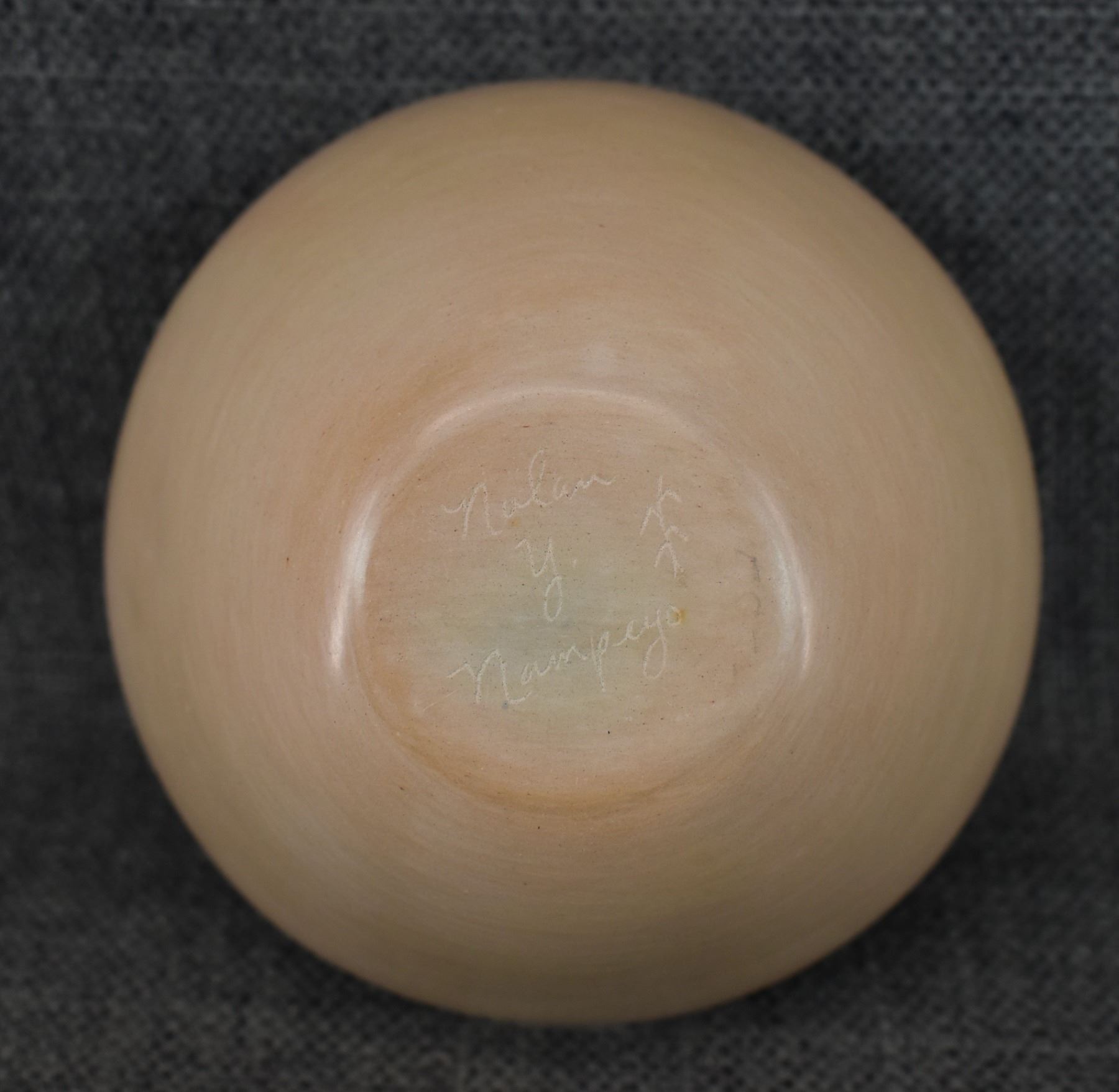 2000's Hopi, hand coiled with carved kachina and kiva scene signed Nolan Y Nampeyo with corn stalk logo. 3" x 4.5"