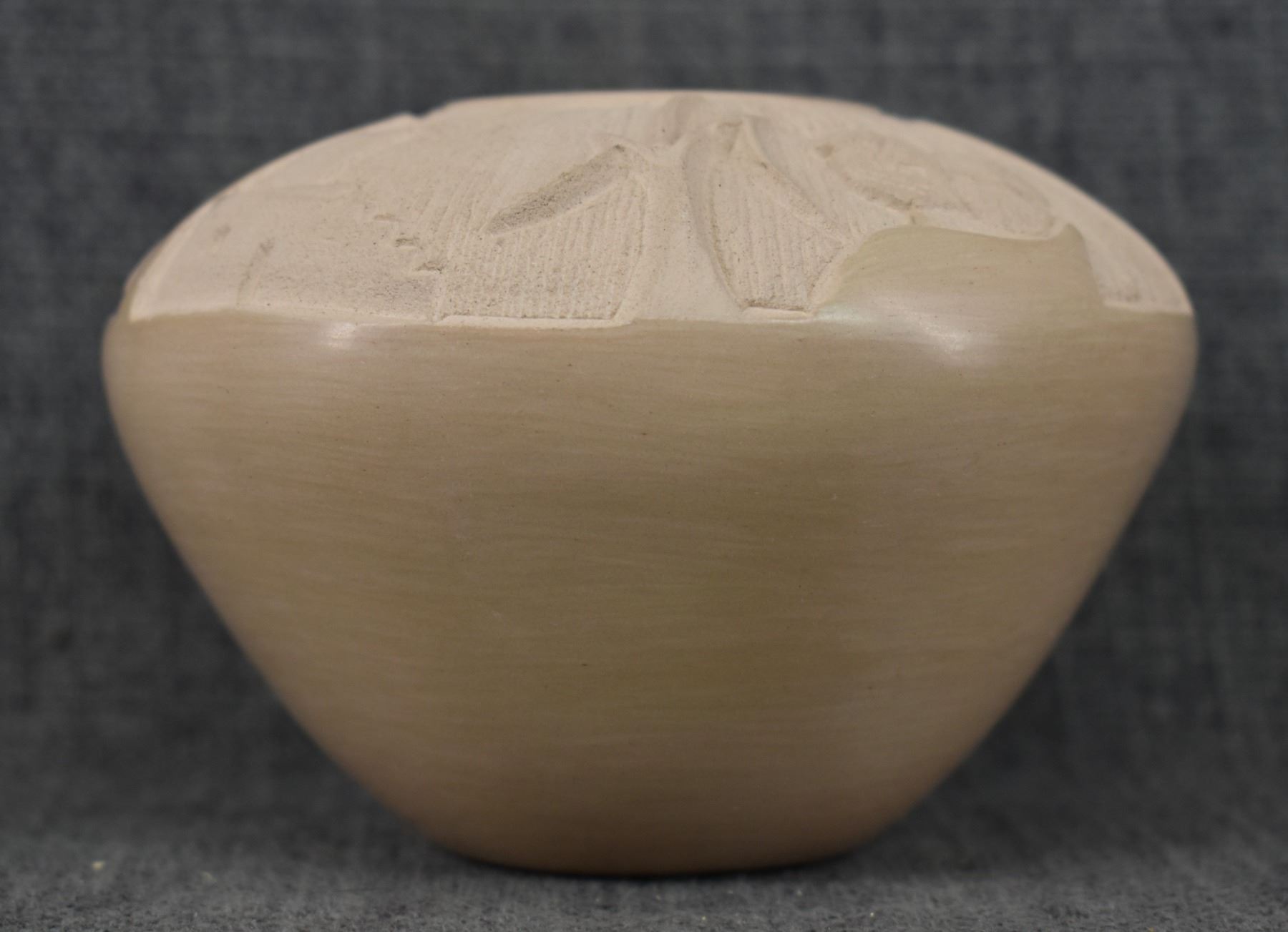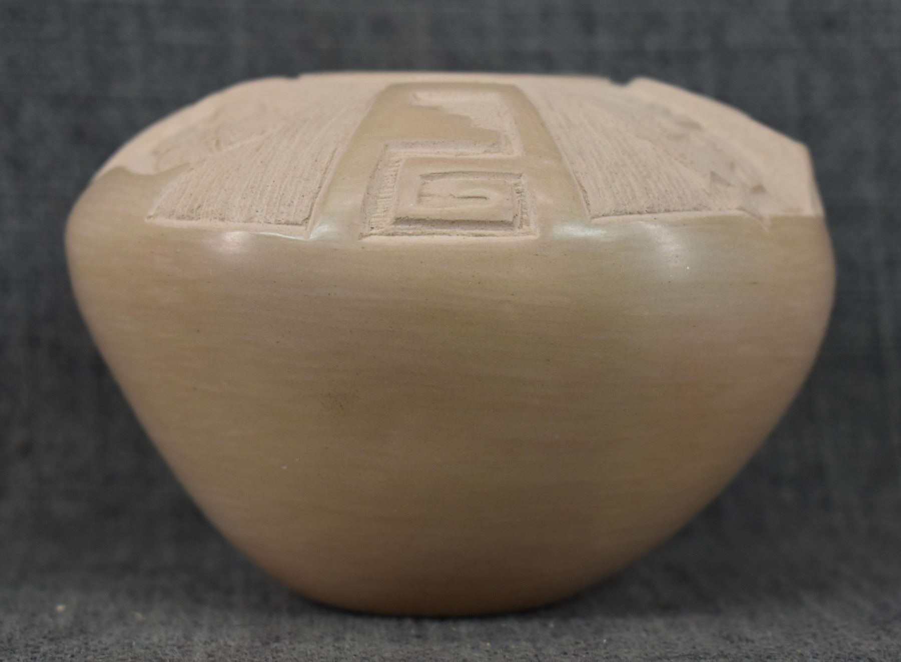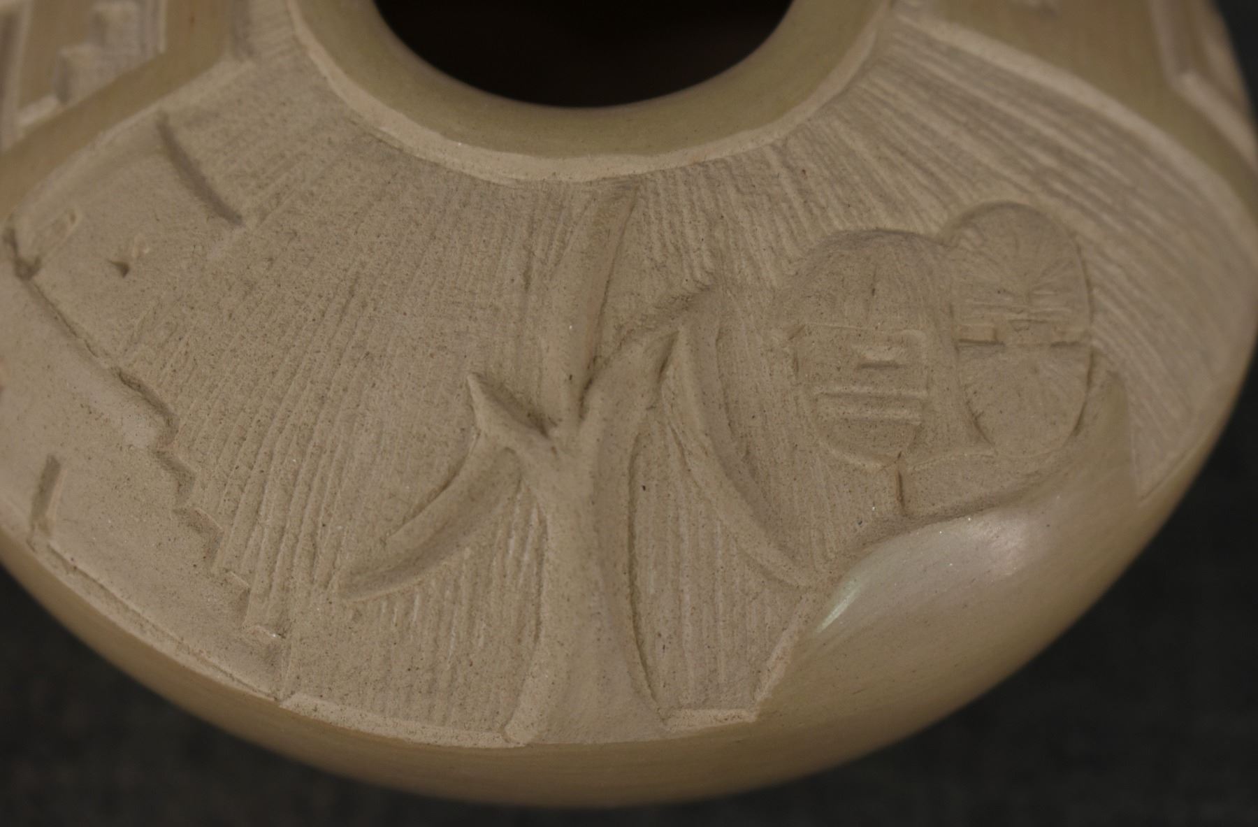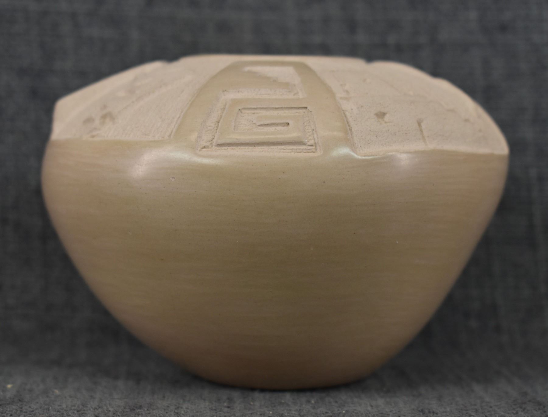 2000's Hopi, hand coiled with carved kachina and kiva scene signed Nolan Y Nampeyo with corn stalk logo. 3" x 4.5"