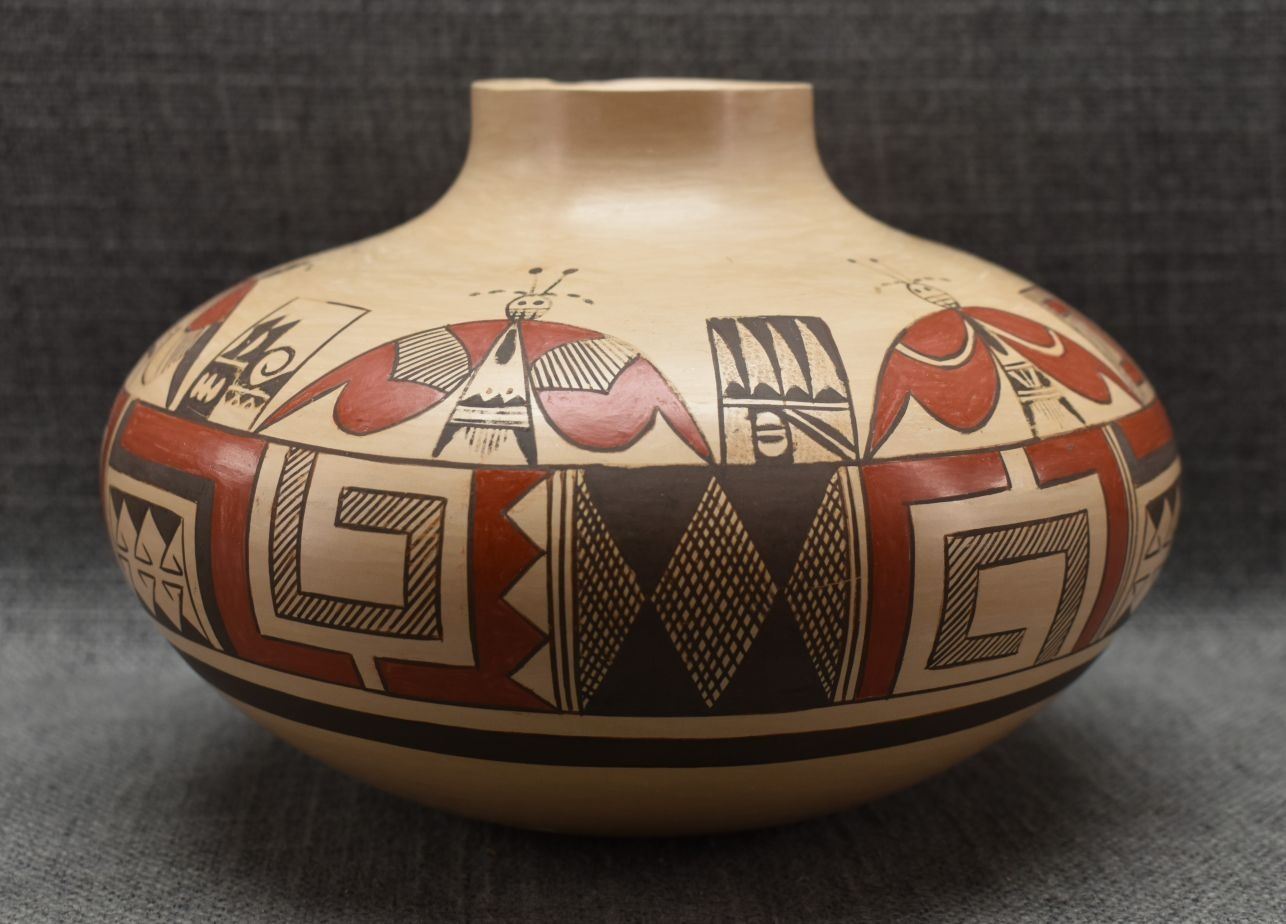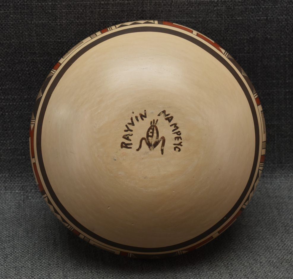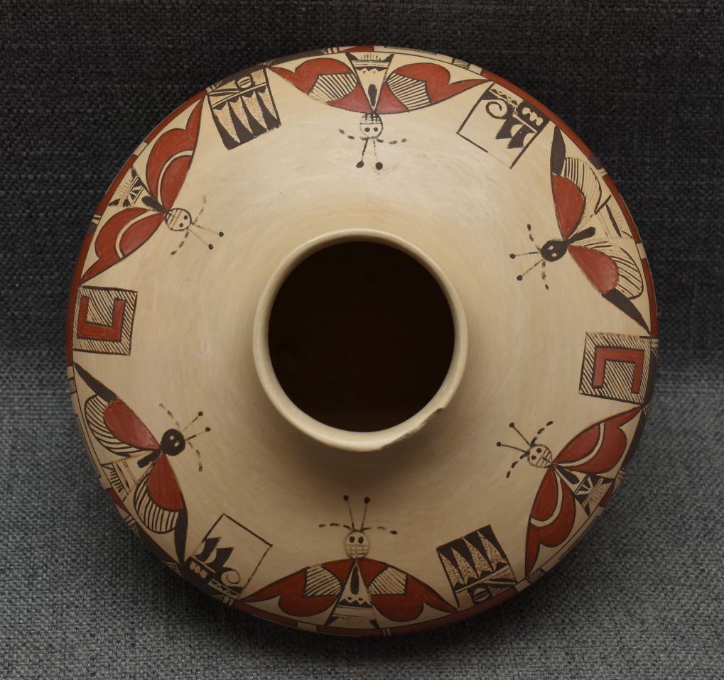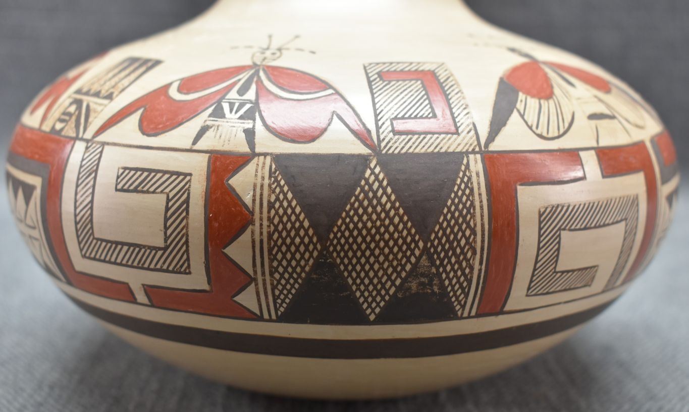 1990's Hopi. Hand coiled and polychrome hand painted pottery jar with butterfly's and geometric design signed Rayvin Nampeyo with corn logo. 4.75" x 7" has chip in rim