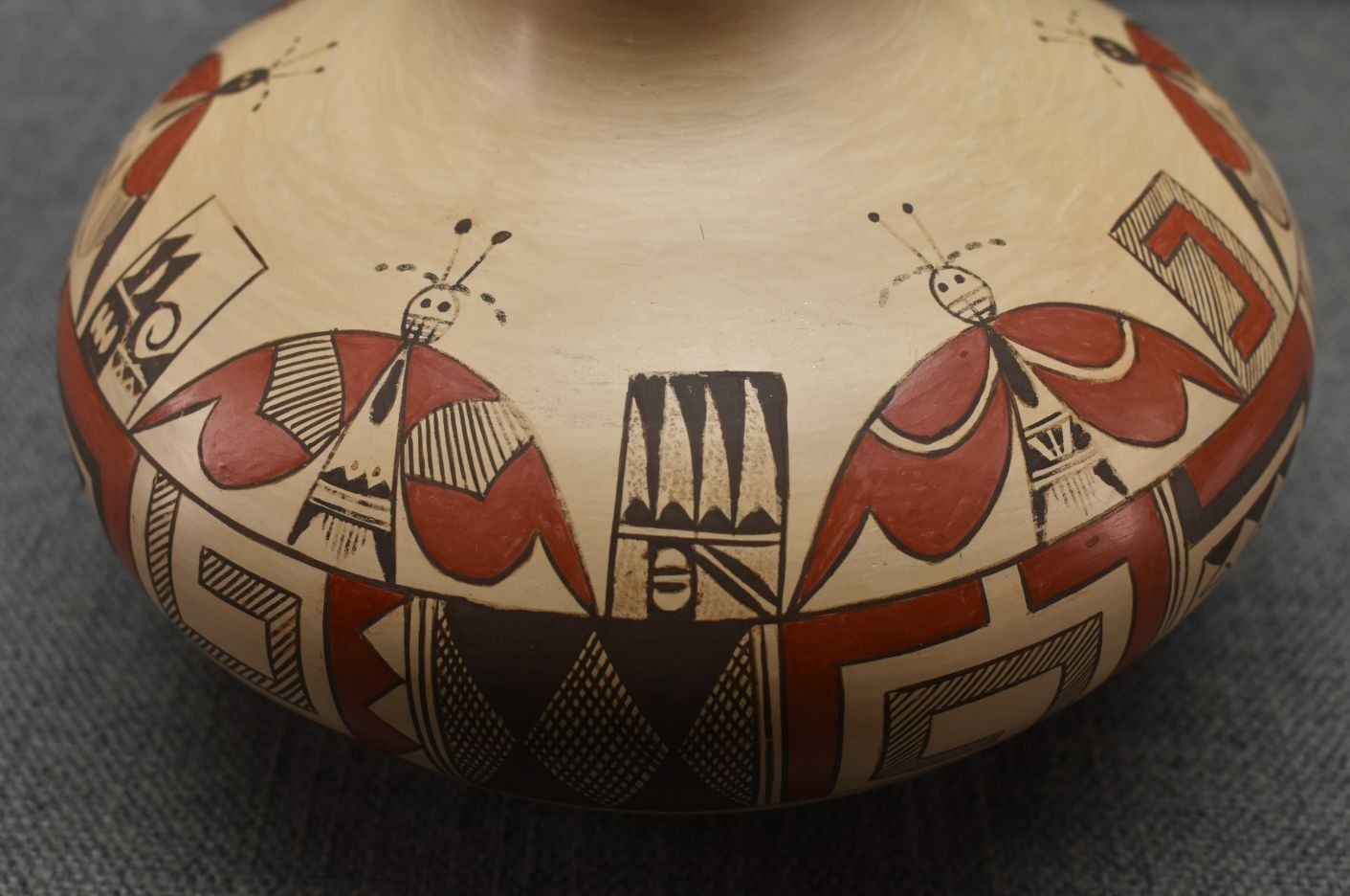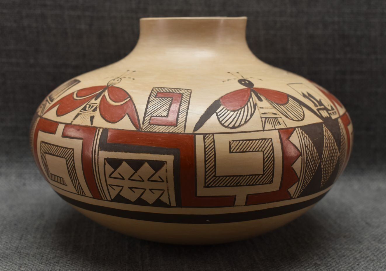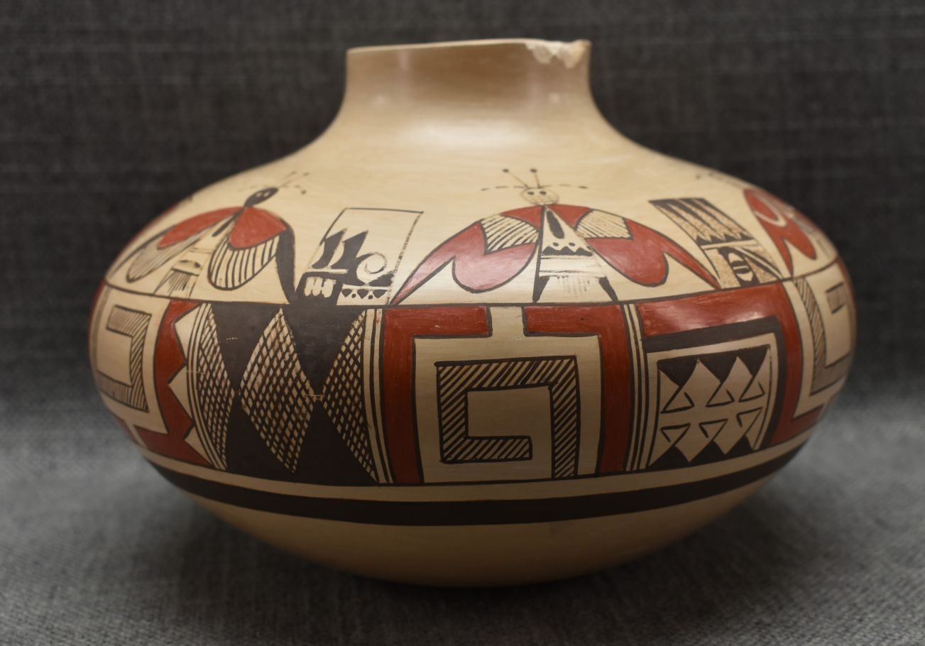 1990's Hopi. Hand coiled and polychrome hand painted pottery jar with butterfly's and geometric design signed Rayvin Nampeyo with corn logo. 4.75" x 7" has chip in rim