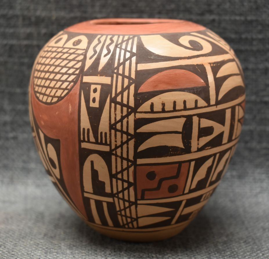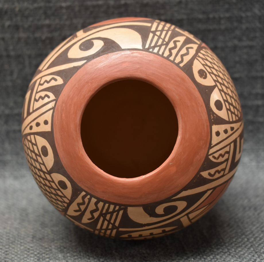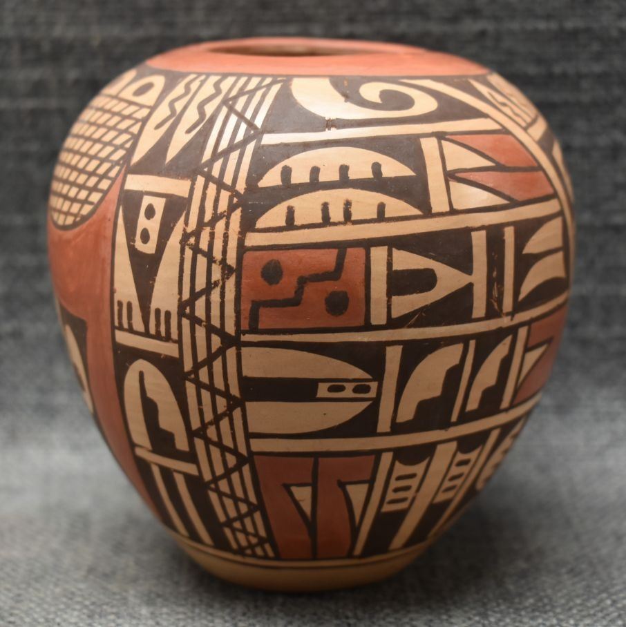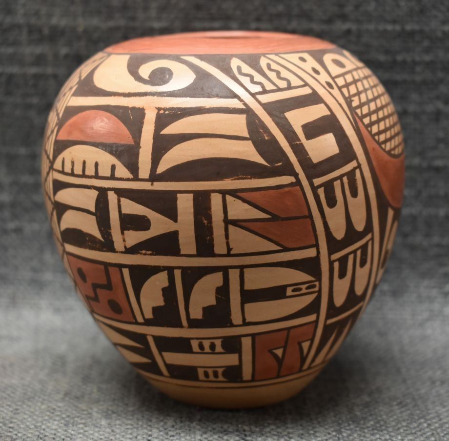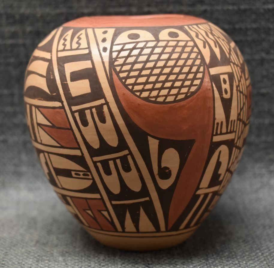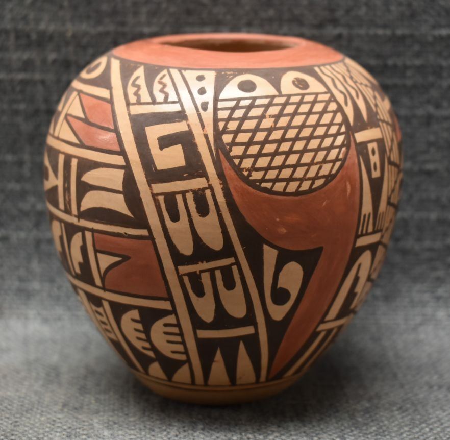 1980's Hopi, hand coiled with busy polychrome painted design by Verla Dewakuku. 4.5" x 4"