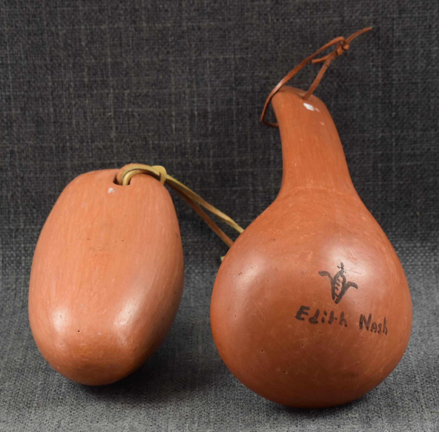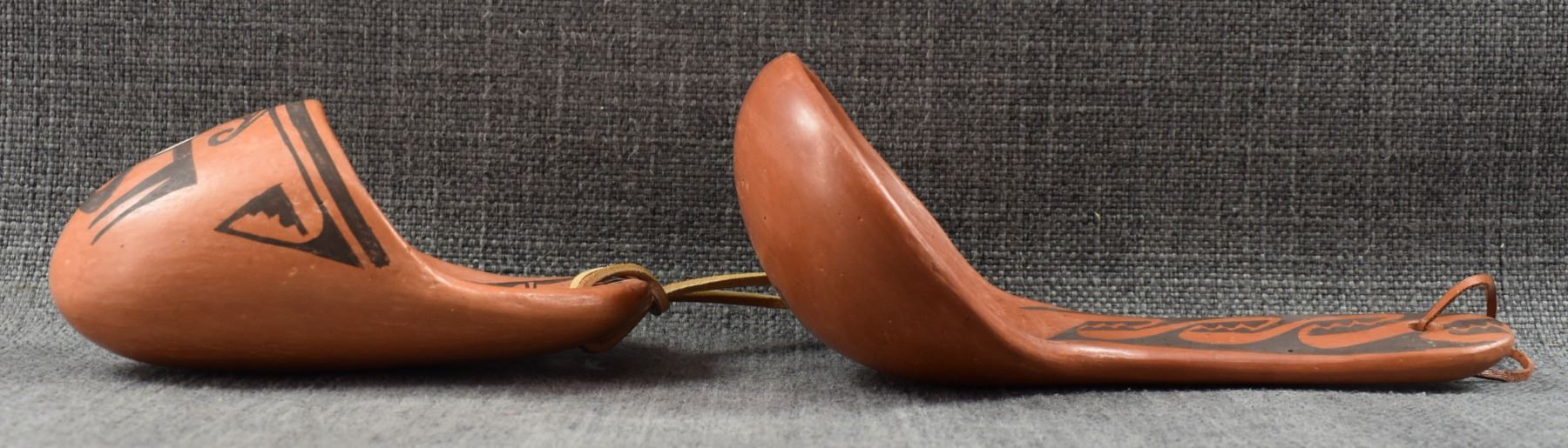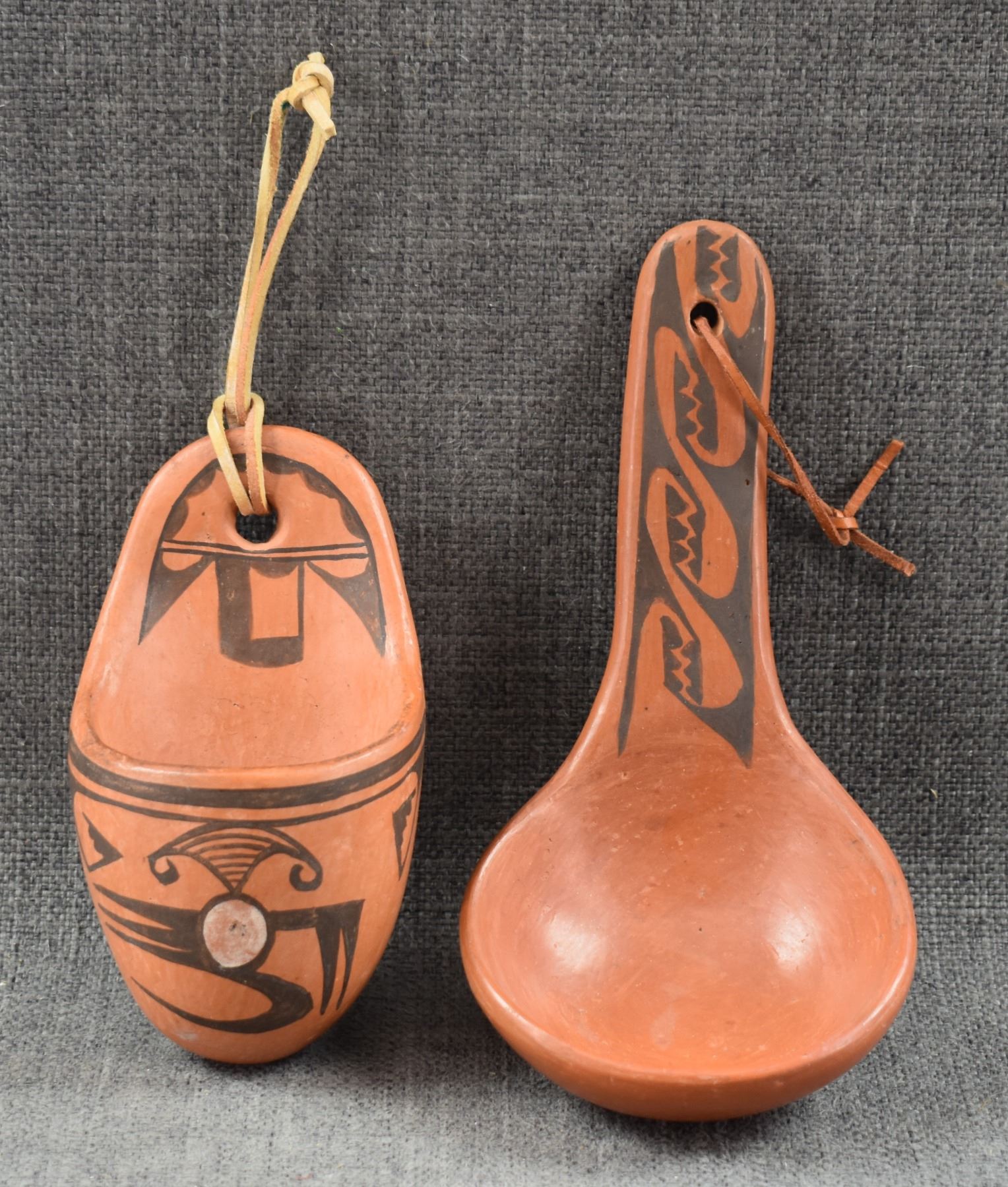Hopi hand coiled ladle and wall pocket. Ladle signed edith Nash with corn logo, Polychrome wall pocket unsigned. Ladle 7" x3.5"