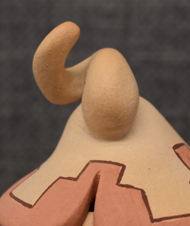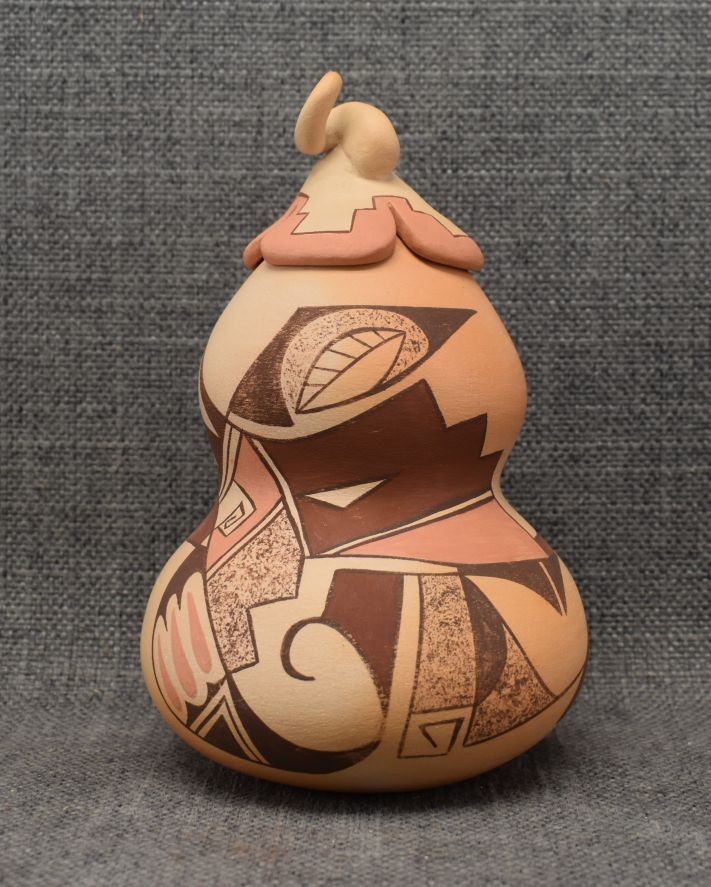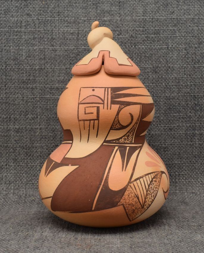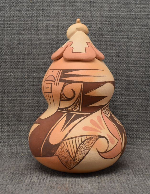 1980-90's Hopi, hand coiled with polychrome painted design, double lobe gourd design with lid signed with pipe hallmark and Tahbo 6.5" x 4"