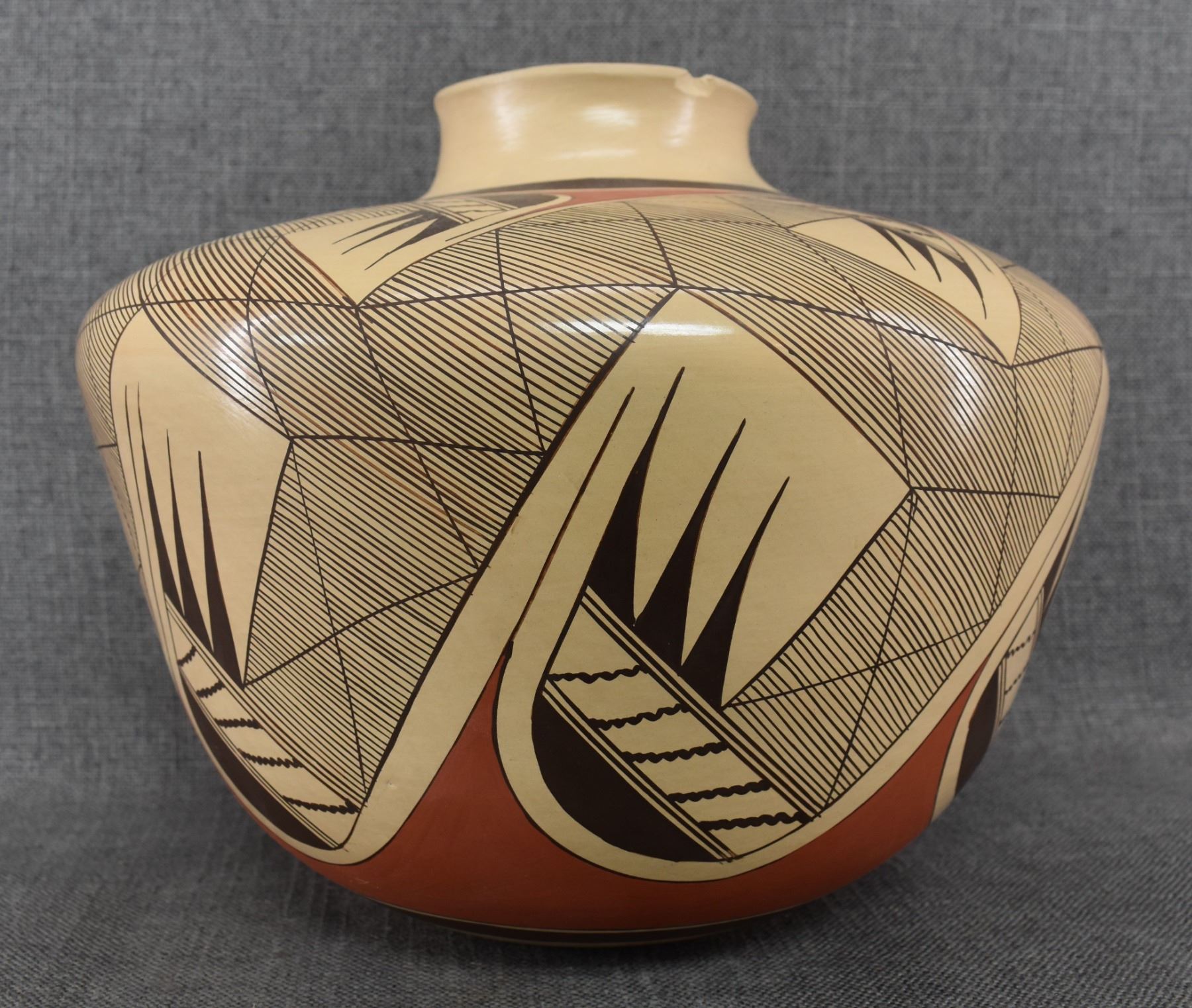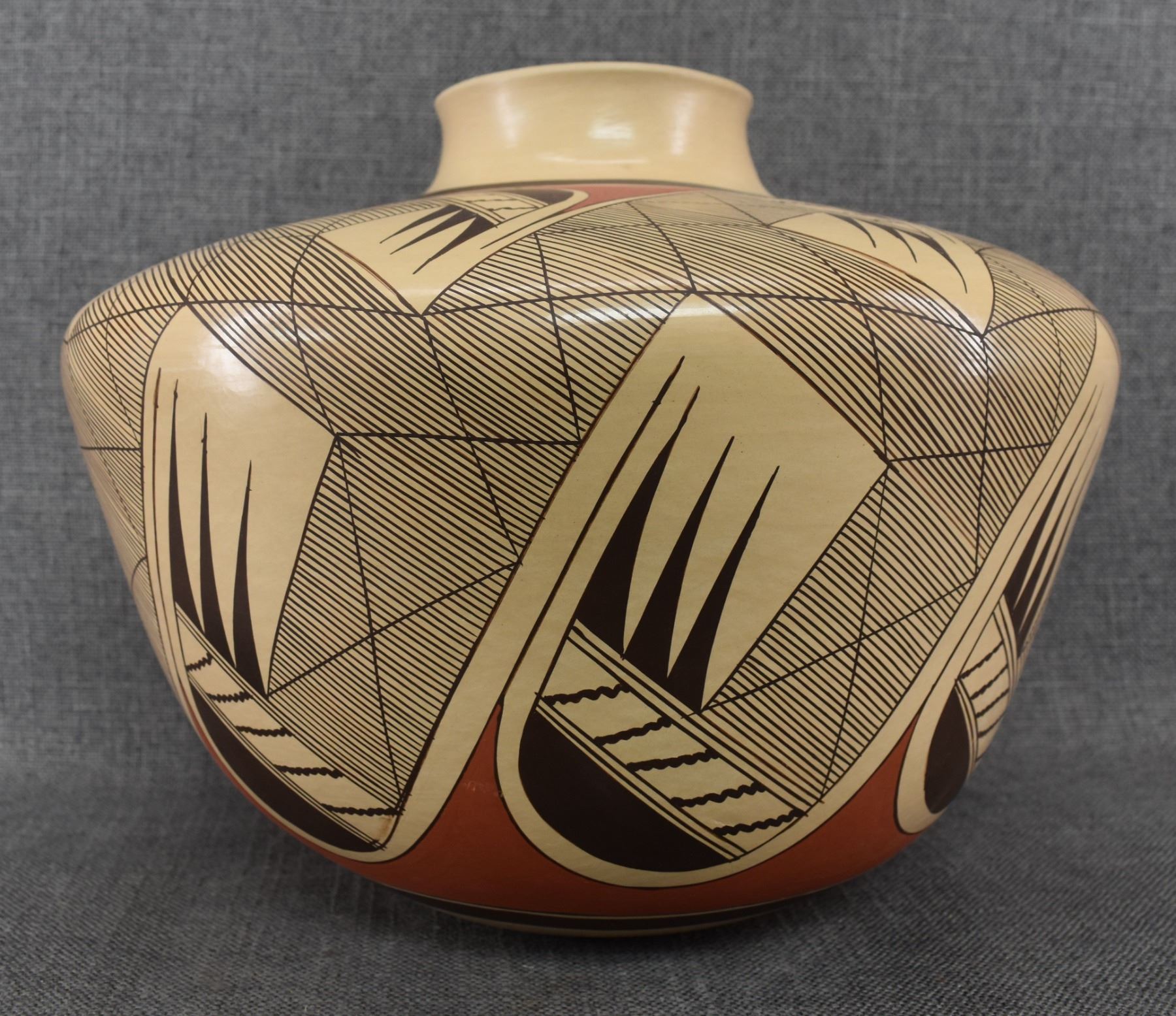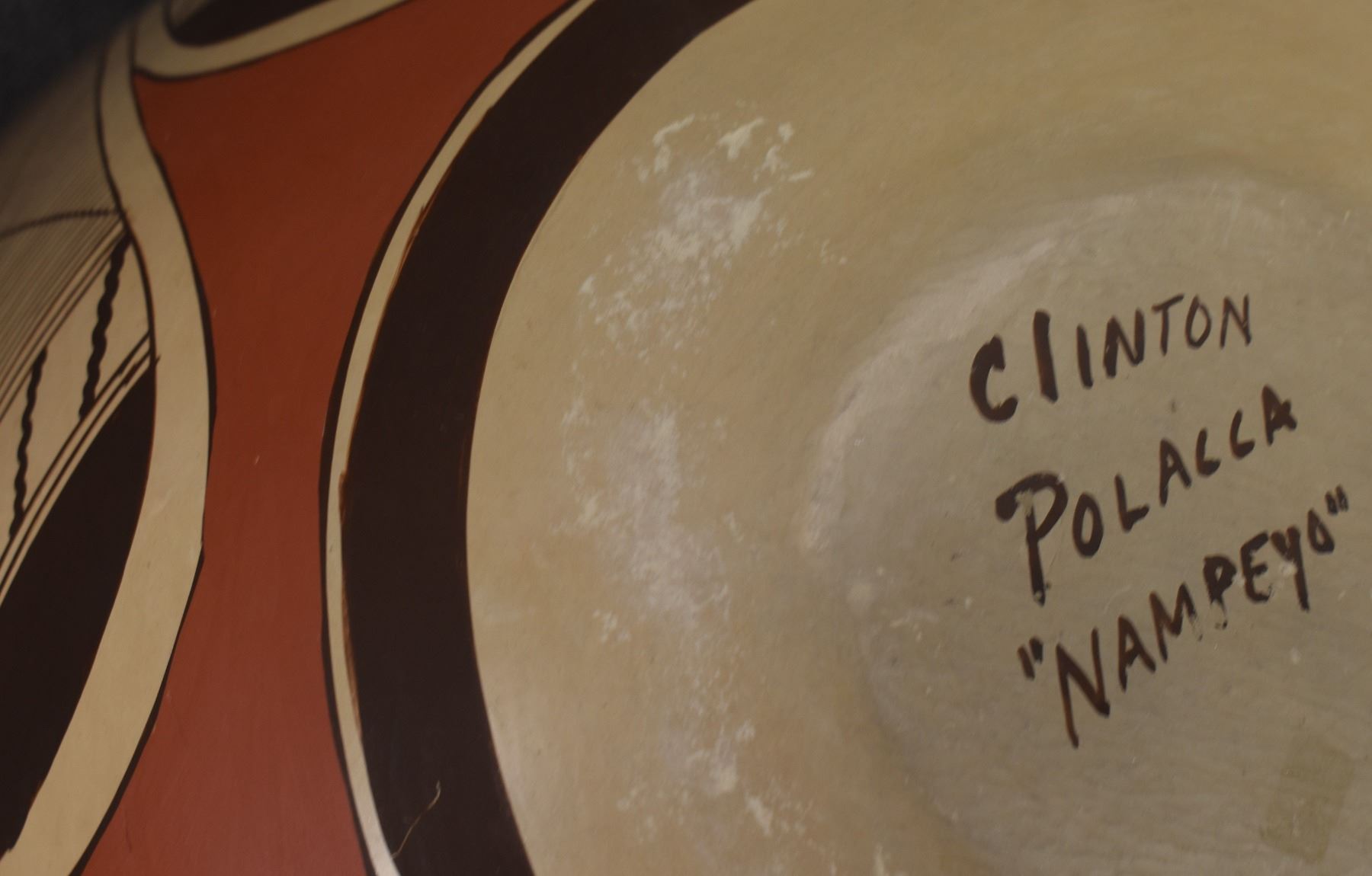 1980-90's Hopi, hand coiled with polychrome painted stylized bird design by Clinton Polacca Nampeyo. 10'' x 12'' has minor rim chip