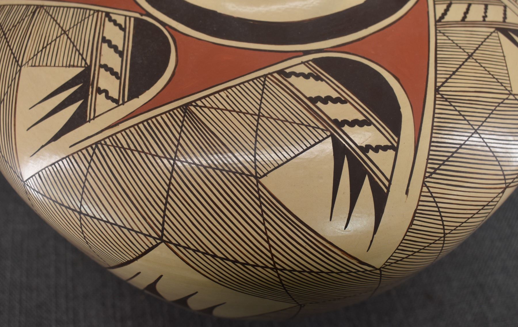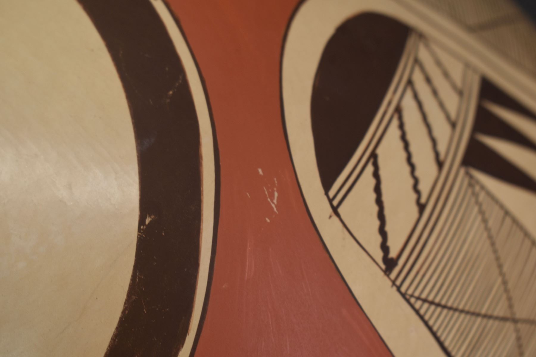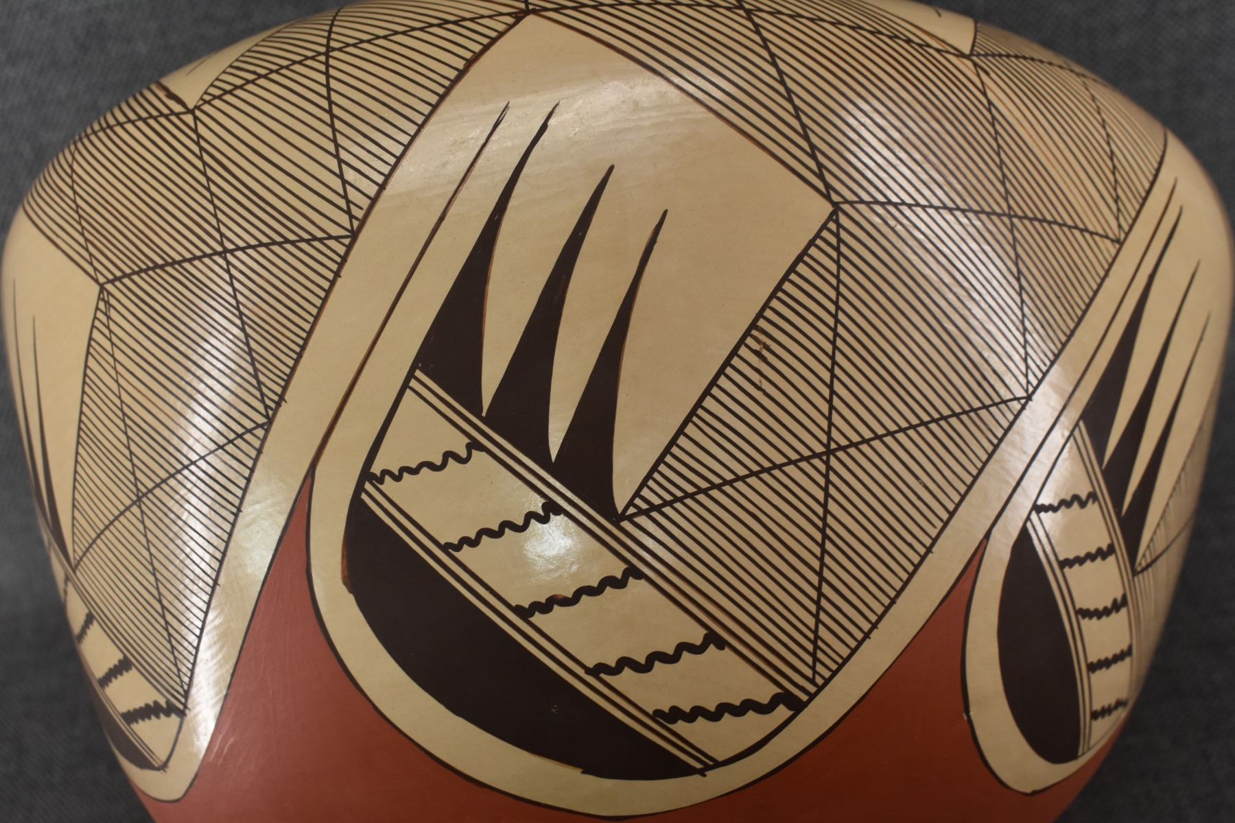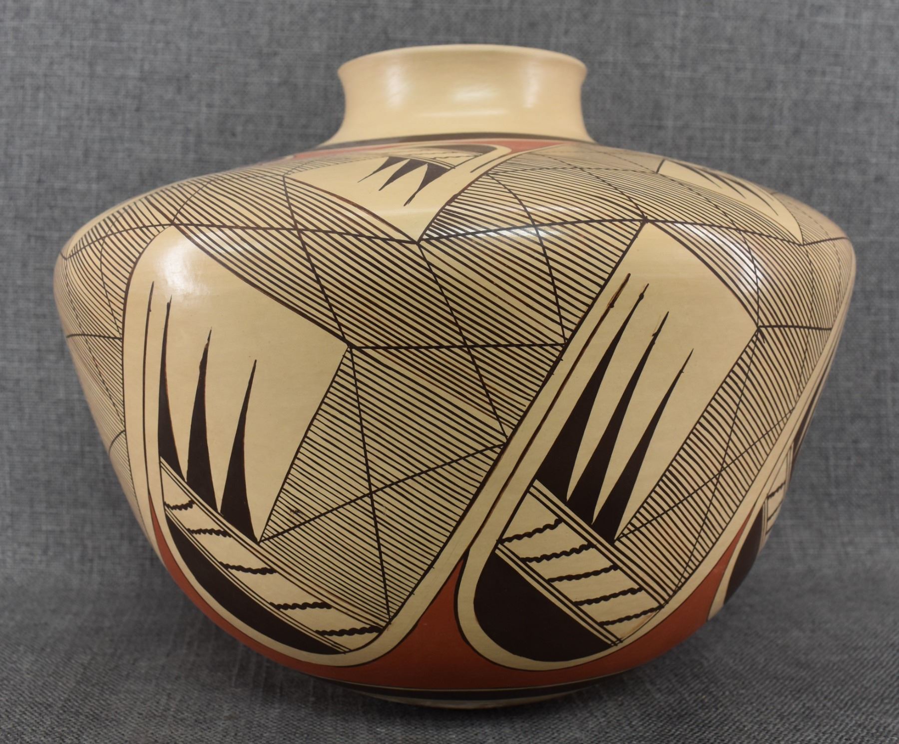 1980-90's Hopi, hand coiled with polychrome painted stylized bird design by Clinton Polacca Nampeyo. 10'' x 12'' has minor rim chip