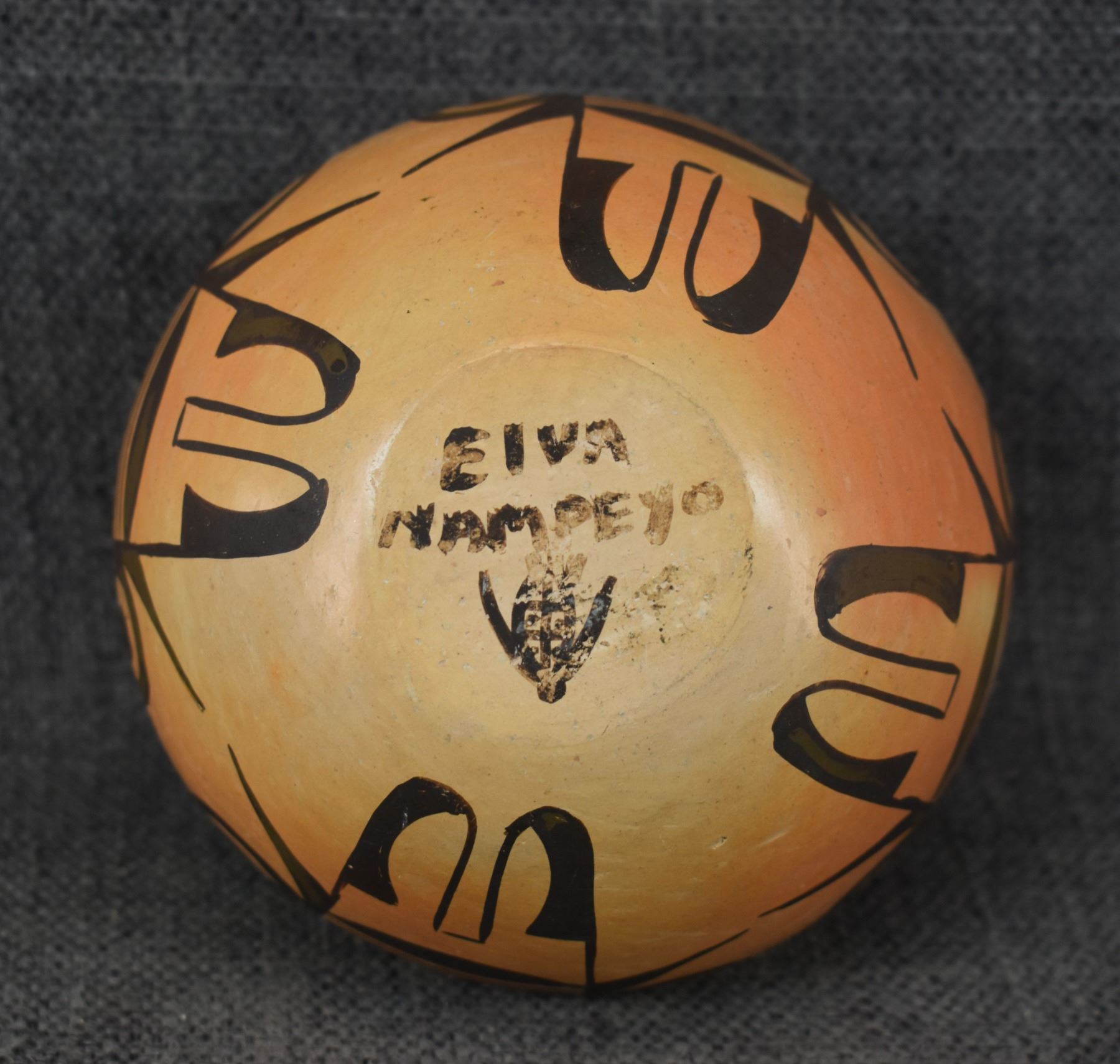 1970's Hopi Hand coiled and painted polychrome painted design pottery jar, signed Elva Nampeyo. Has minor rubs. 3.5'' x 4.25''