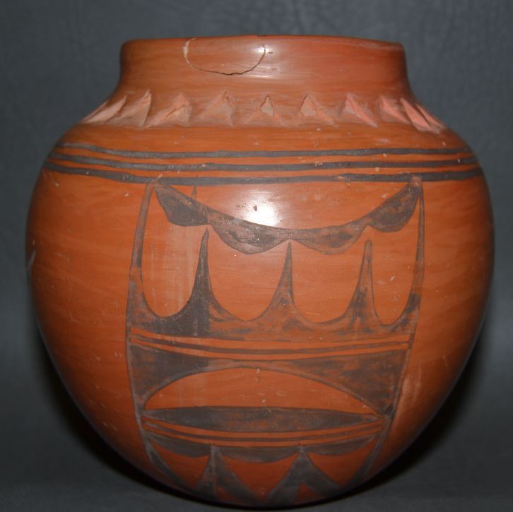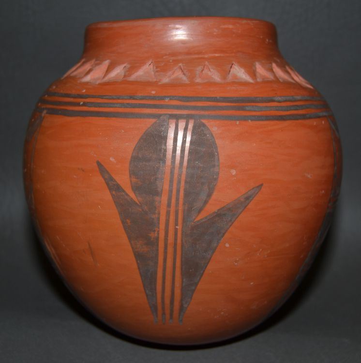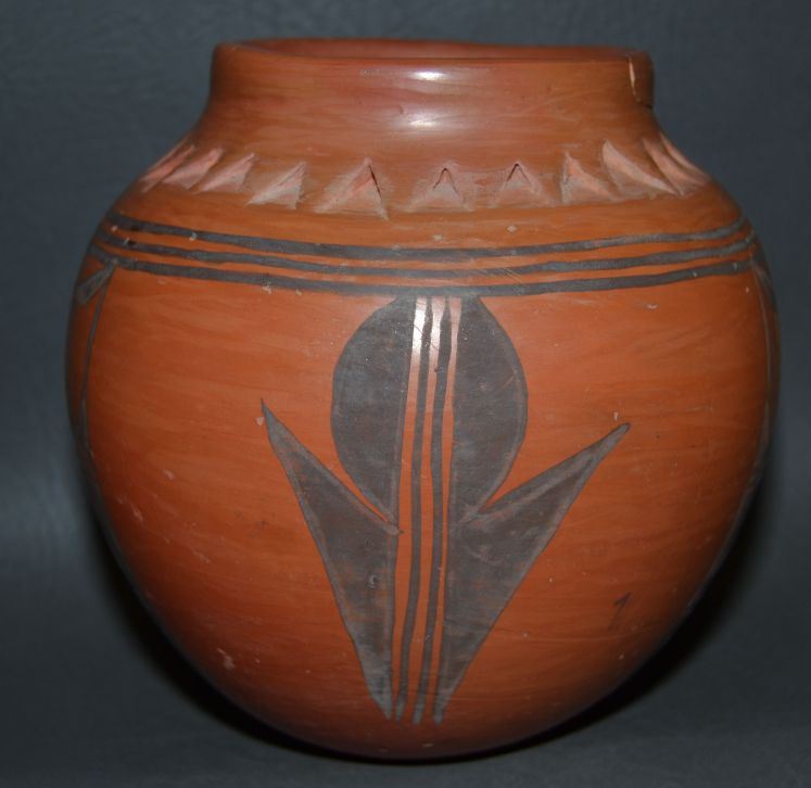 1960's hand made and painted geometric design with corrugated design on shoulder has chip on rim signed Irene Shupla 6" x 5.5"