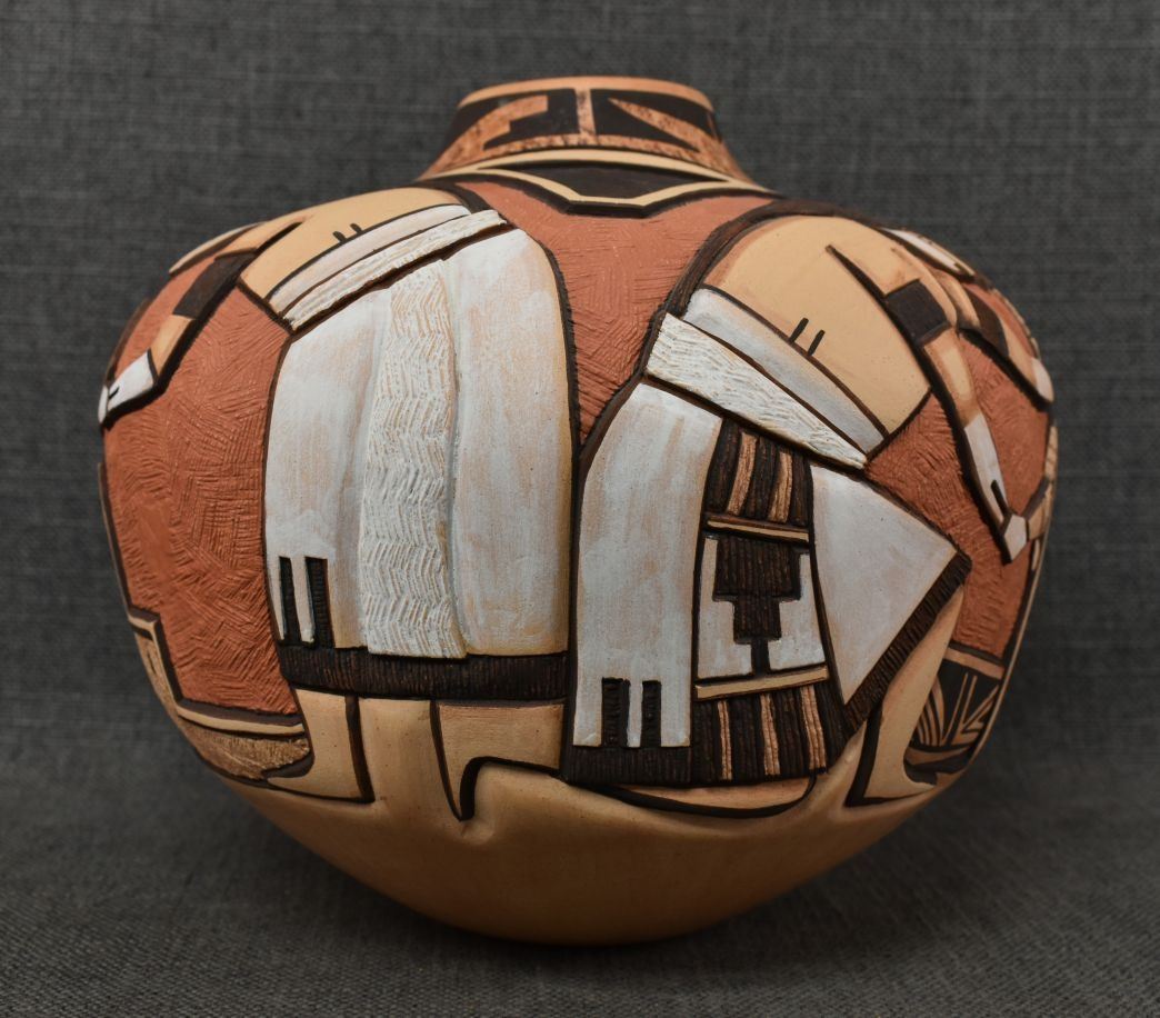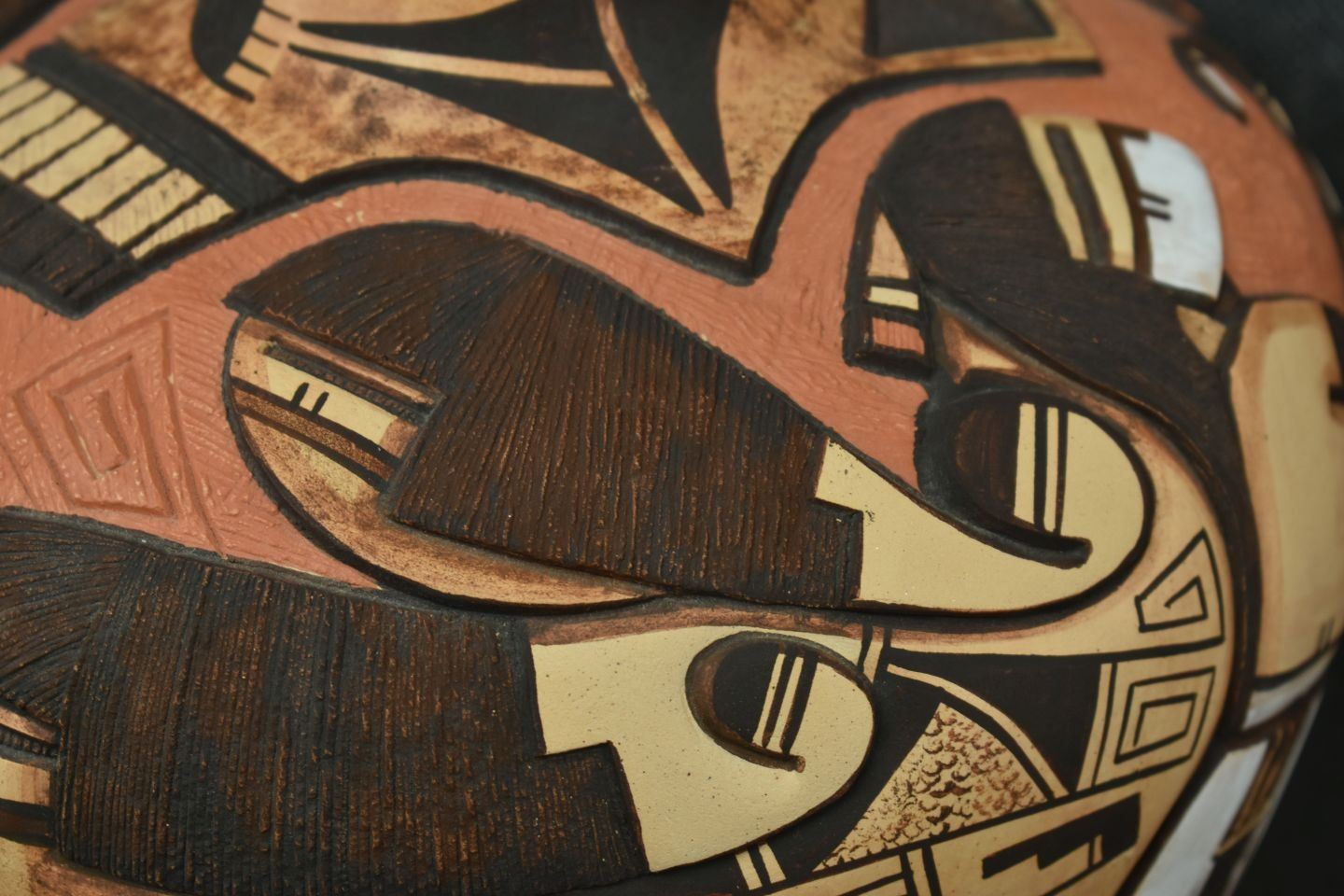 1990's Hopi, hand coiled with carved and painted kachina and pueblo design by Tom Polacca 8.5" x 9"
